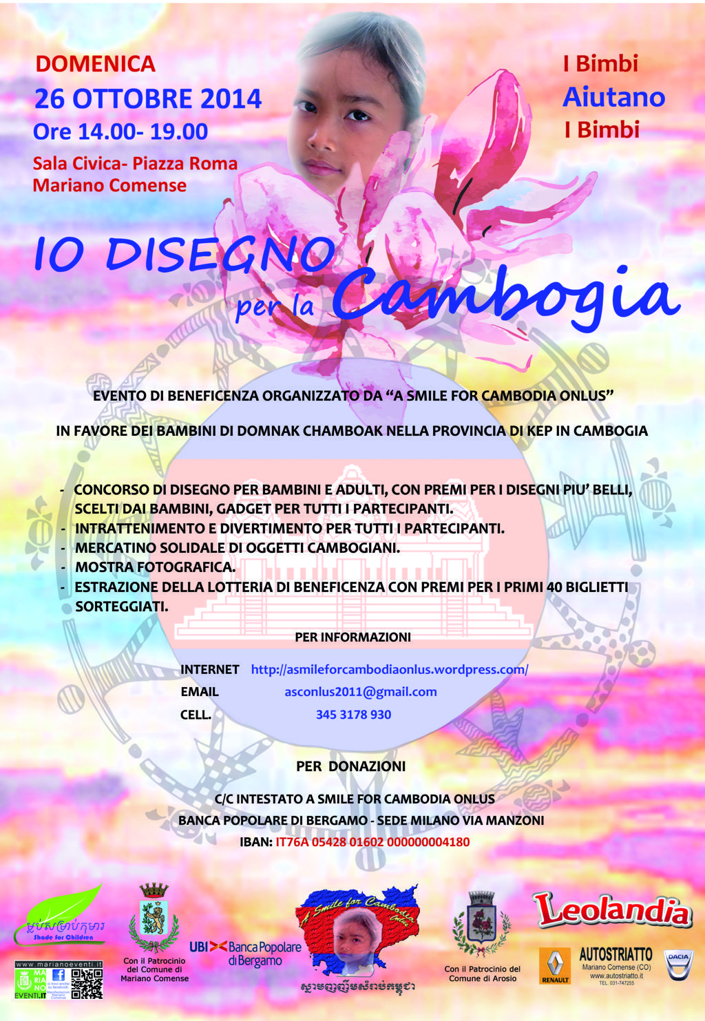 L’evento sarà occasione per l’usuale concorso di disegno per i bambini, che voteranno i disegni migliori e per l’estrazione dei 40 premi della nostra lotteria di beneficenza, destinata a supportare gli investimenti per completare la sede del Centro acquistata lo scorso aprile dalla nostra associazione gemella in Cambogia, Shade for Children, con fondi procurati da A Smile for Cambodia Onlus e dai tanti amici che ci hanno sostenuto in questo progetto.