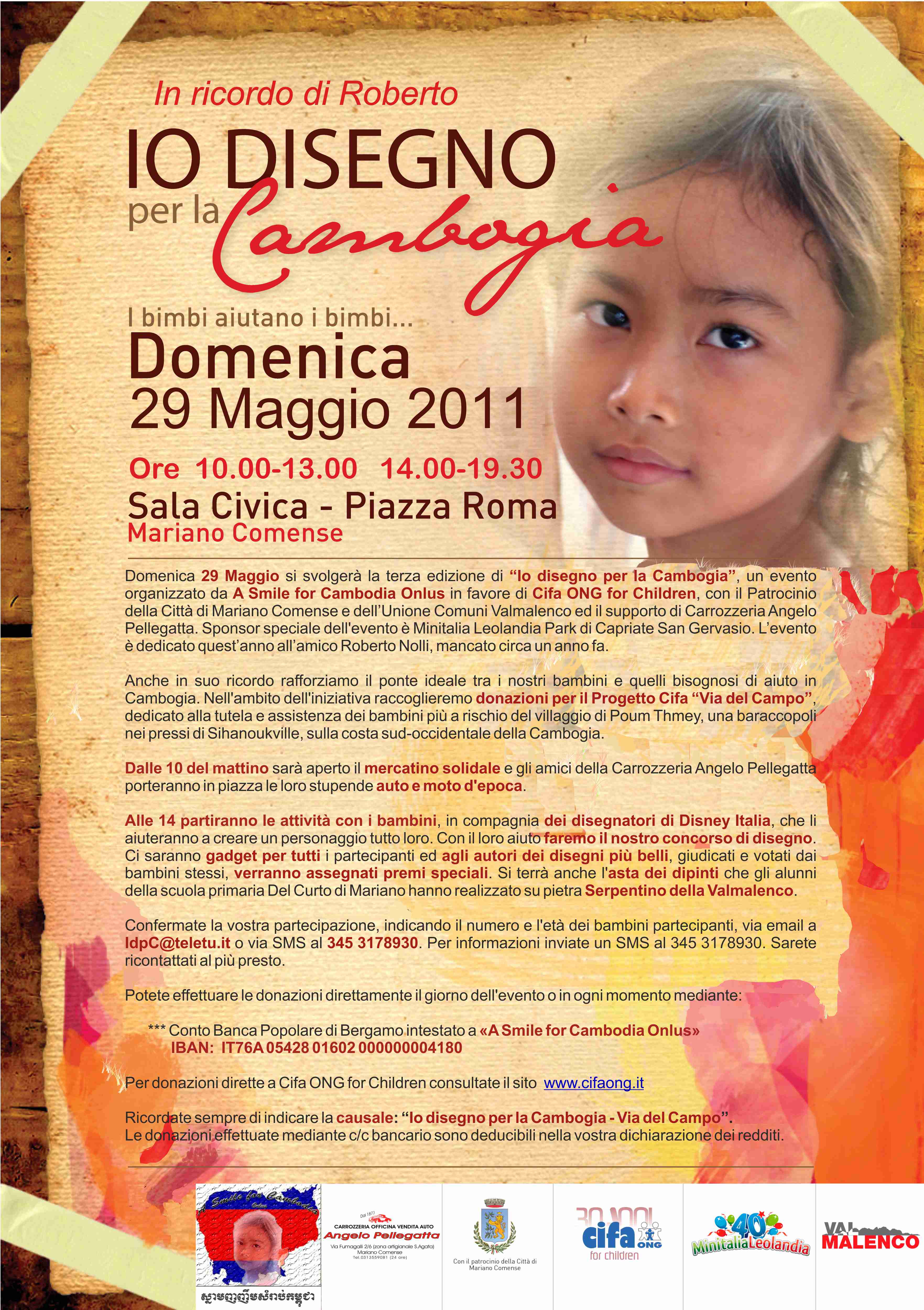 DOMENICA 29 MAGGIO si svolgerà la terza edizione di IO DISEGNO PER LA CAMBOGIA, in favore di CIFA ONG FOR CHILDREN, quest’anno dedicato in modo particolare all’amico Roberto Nolli, mancato un anno fa, nel cui ricordo rafforziamo il ponte ideale tra i nostri bambini e quelli bisognosi di aiuto in Cambogia.