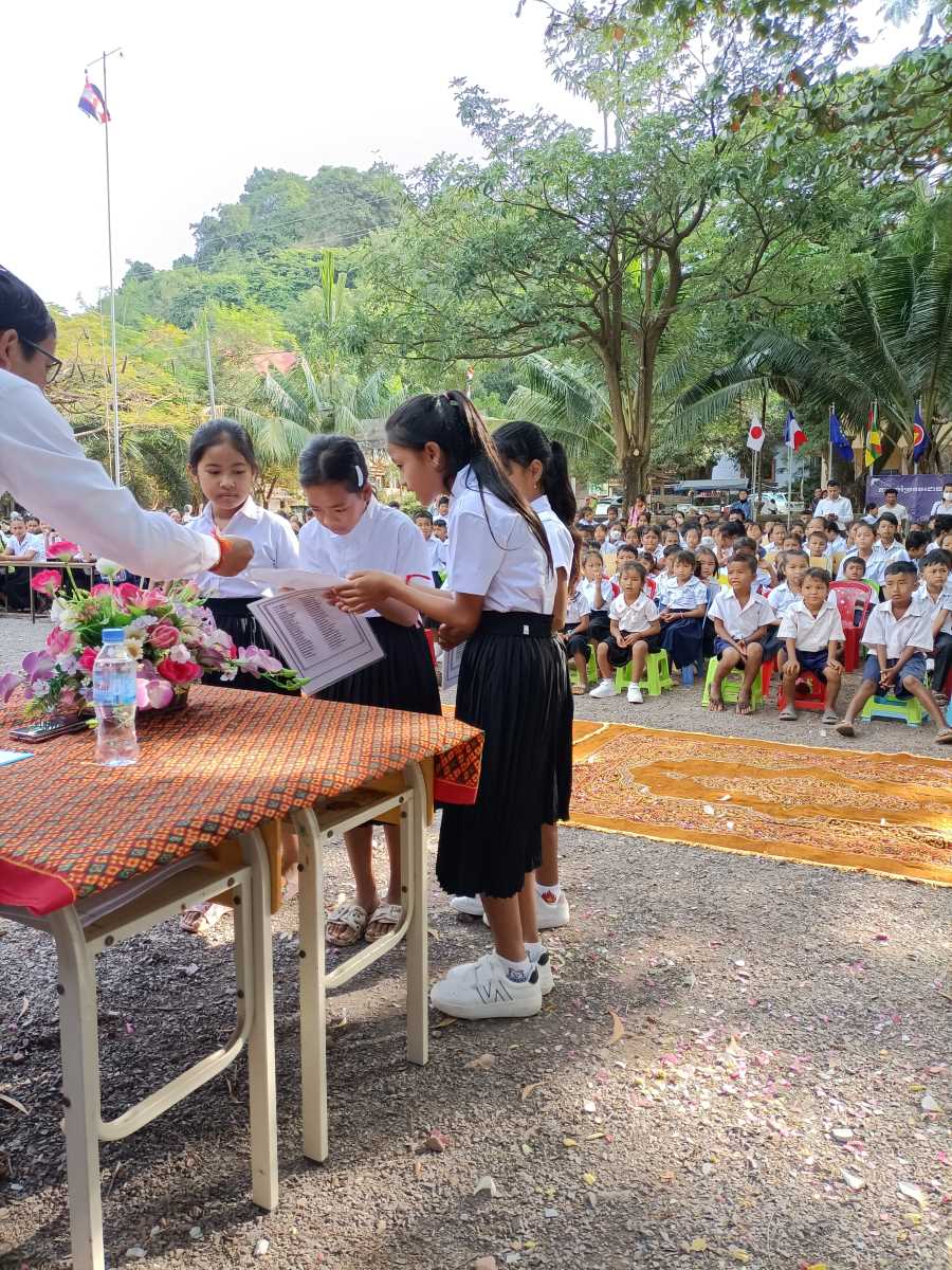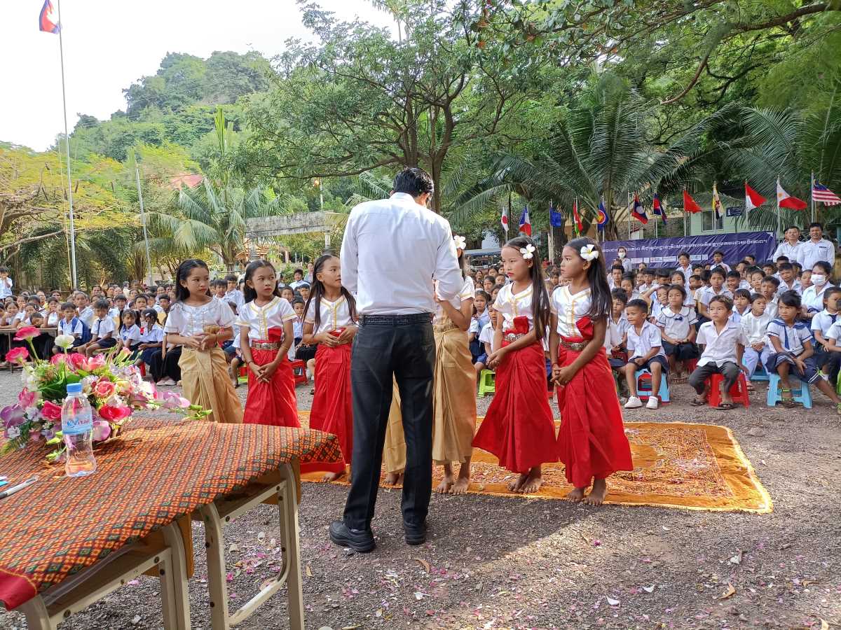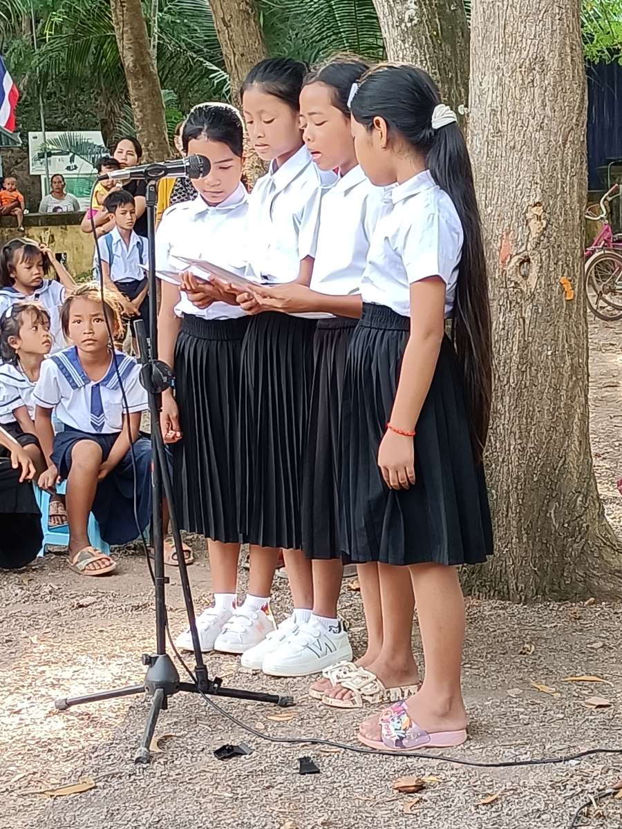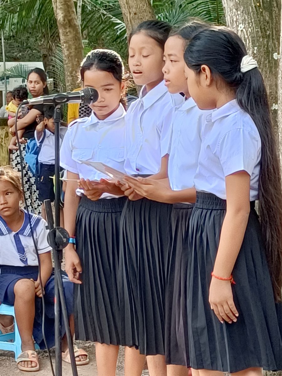 Poi è la volta dei discorsi. Prima quattro bambine che leggono un documento sull’utilità di andare a scuola. A loro è stato dato il ruolo di rappresentare tutti gli alunni della scuola. Poi è la volta del direttore scolastico in pectore e ancora di due bambine che intonano una canzone il cui testo racconta di cosa può succedere se non si va a scuola. A chiudere il round degli interventi il rappresentante del distretto scolastico che legge il messaggio a tutti gli studenti del Primo Ministro Hun Maneth (entrato in carica la scorsa primavera, dopo il “ritiro” del padre Hun Sen che ha governato il Paese per quasi 50 anni e che adesso ha assunto il ruolo di consulente speciale del Re Sihamoni).