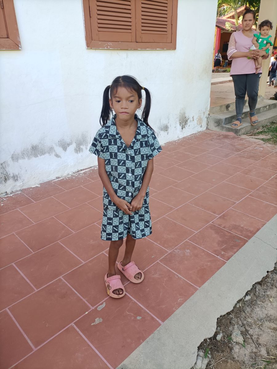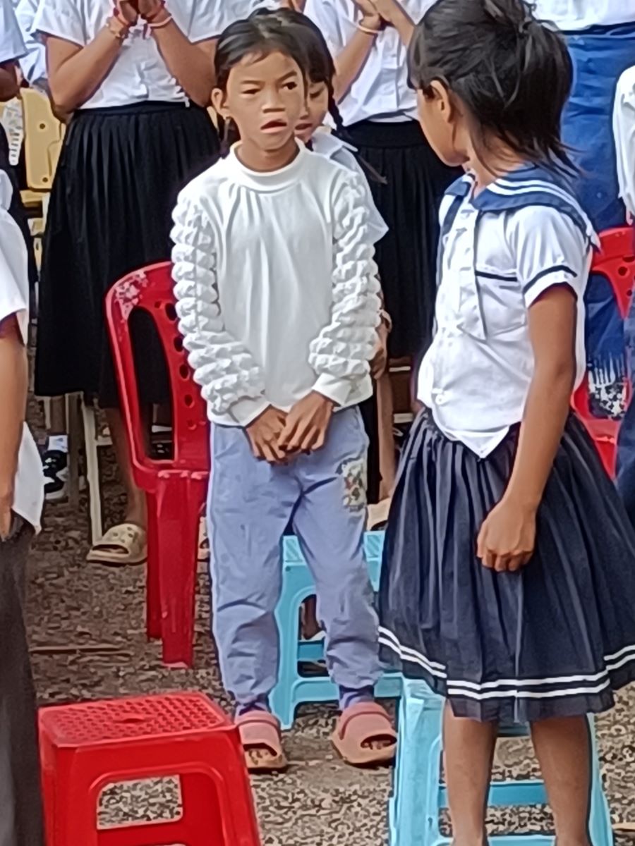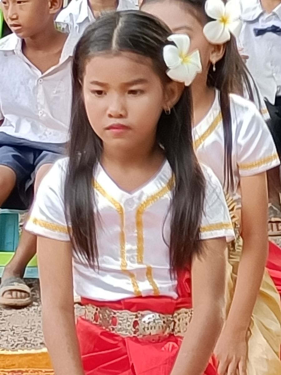 Intanto la sorpresa più bella, che davvero fa la nostra giornata, è vedere che in seconda fila c’è anche la piccola Sievmean, la bimba che abbiamo incontrato l’altro ieri che a 9 anni non ha ancora iniziato la scuola. Questo vuol dire che la scuola ha accettato la richiesta di iscrizione e questo è davvero una grande cosa. Lei è lì tranquilla in mezzo agli altri bambini e si guarda in giro incuriosita. Non sembra avere problemi particolari a stare in mezzo agli altri bambini. Speriamo che tutto prosegua così per lei. Noi abbiamo alle spalle l’esperienza di Peo, un ragazzo con difficoltà espressive pesanti che tuttavia sta arrivando alla fine della scuola superiore e anche con discreti risultati. Speriamo che lo stesso accada anche per questa dolcissima bimba.