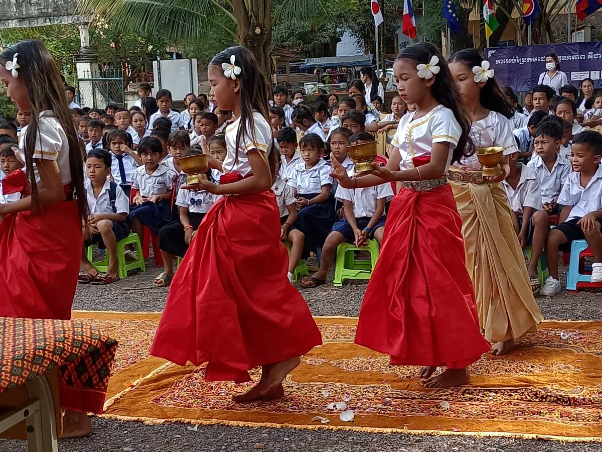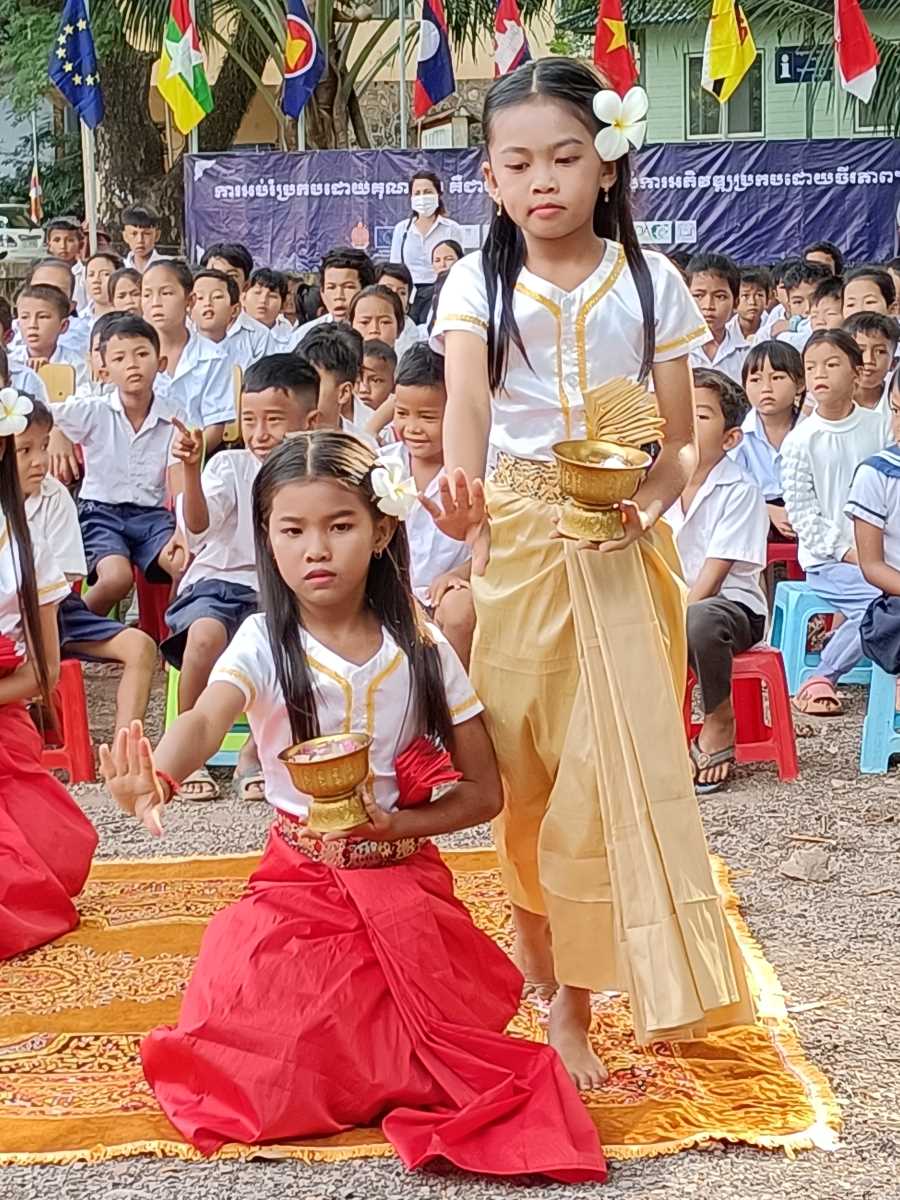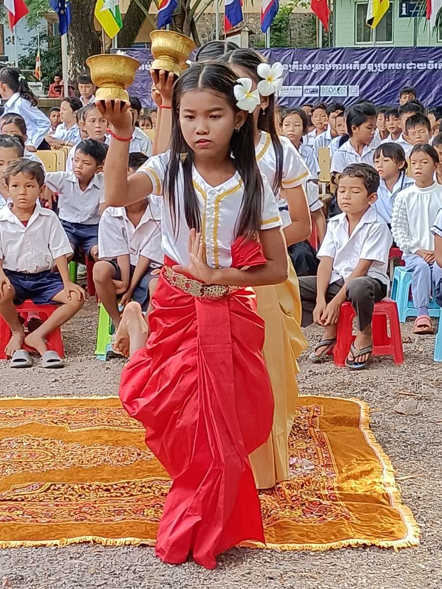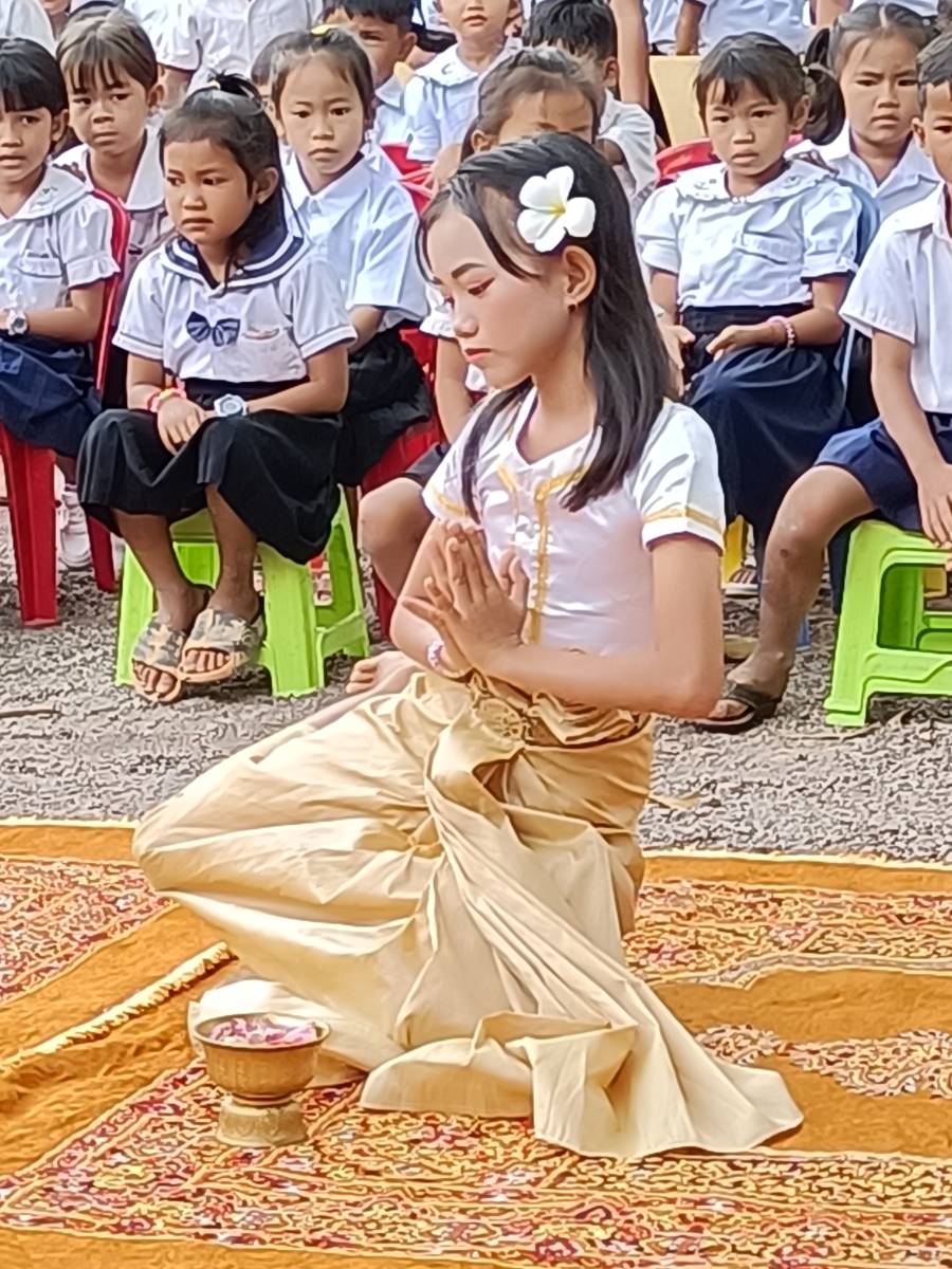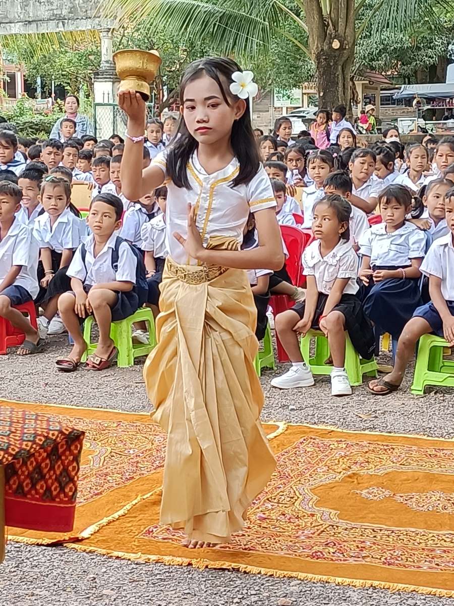 Alle 8.15 entrano in scena le nostre piccole Apsara, che ripetono la stessa danza l’altro giorno hanno fatto per dare a me e Silvio il benvenuto al Centro. Con i loro costumi sgargianti sono davvero belle. Alla fine della loro performance il rappresentante del distretto scolastico si alza e si avvicina per complimentarsi e consegnare un regalo alle bambine.