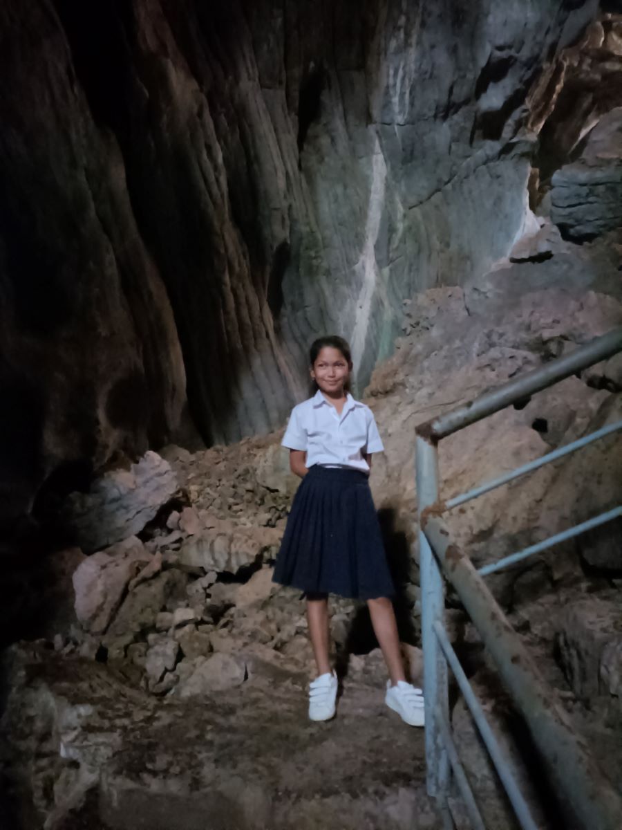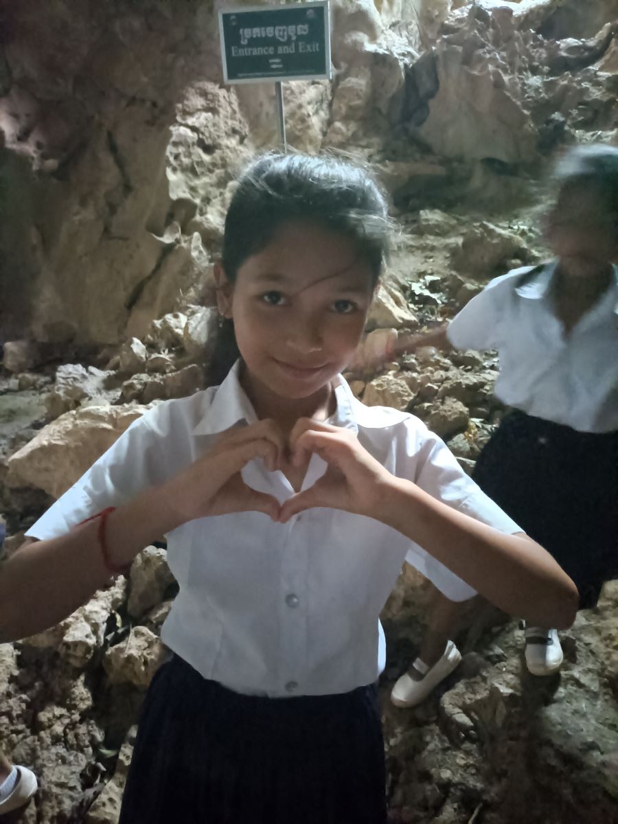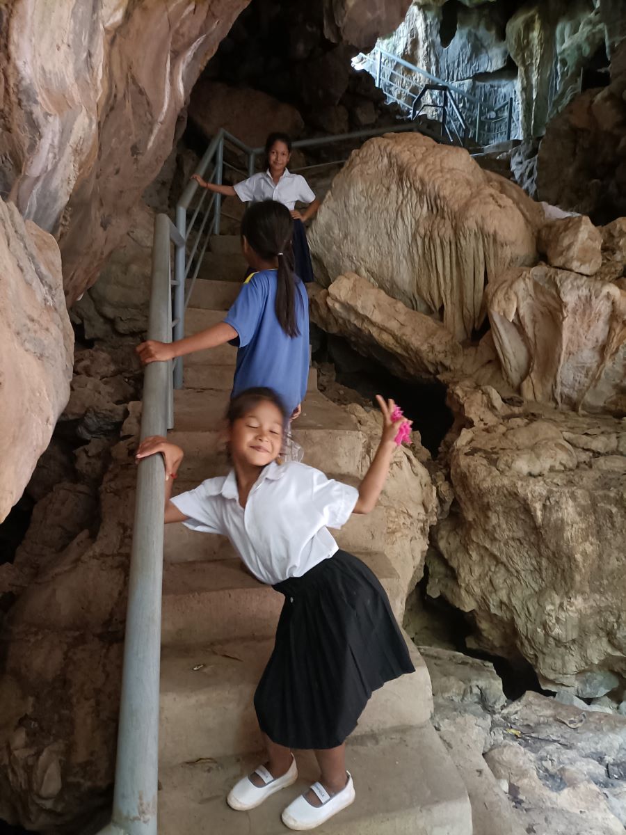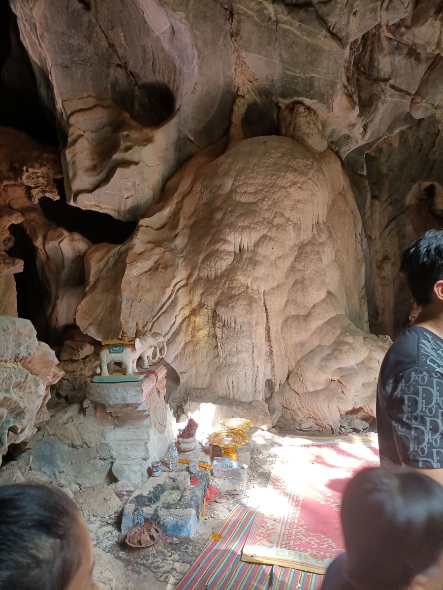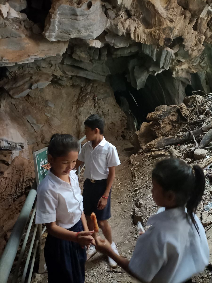 Appena mi libero e faccio per rientrare al nostro Centro vengo rapito da Khemarà, Khanha, Lika e Donghey che mi portano in cima alla pagoda di Phnom Sosear e a vedere le grotte del White Elephant. Scendiamo lungo le scale ripide e sentiamo i pipistrelli fare i loro rumori che non so definire. Ce ne sono parecchi attaccati alle rocce e alla volta della grotta e altri che svolazzano di qua e di là nel tipico modo veloce e dalle traiettorie imprevedibili dei pipistrelli.