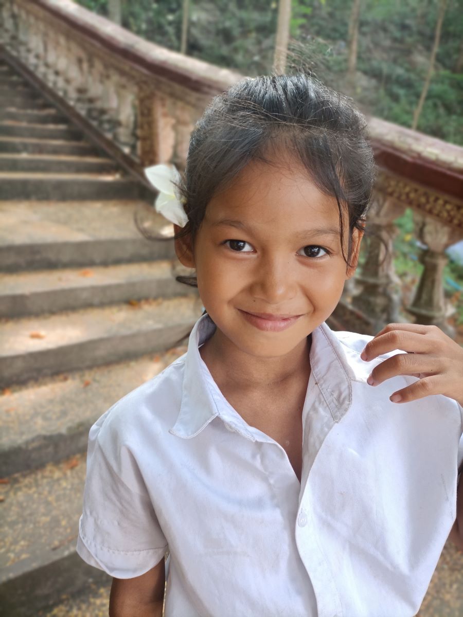 Ma c’è anche qualcun altro che vuole fare la foto. Acchiappo al volo Kunthea e me la prendo in braccio per fare qualche foto. Non resisto alla tentazione di quelle guanciotte paffute e le stampo un bacio sulla guancia. Lei non fa una piega. Anzi sorride. È una vera birba. E poi c’è anche la nostra Sievmean, ma con lei l’approccio deve essere necessariamente più cauto. Le faccio una foto appena prima che le ragazze la chiamino dentro l’ufficio dello staff per consegnarle un set scolastico con uno zaino nuovo di pacca per andare a scuola.