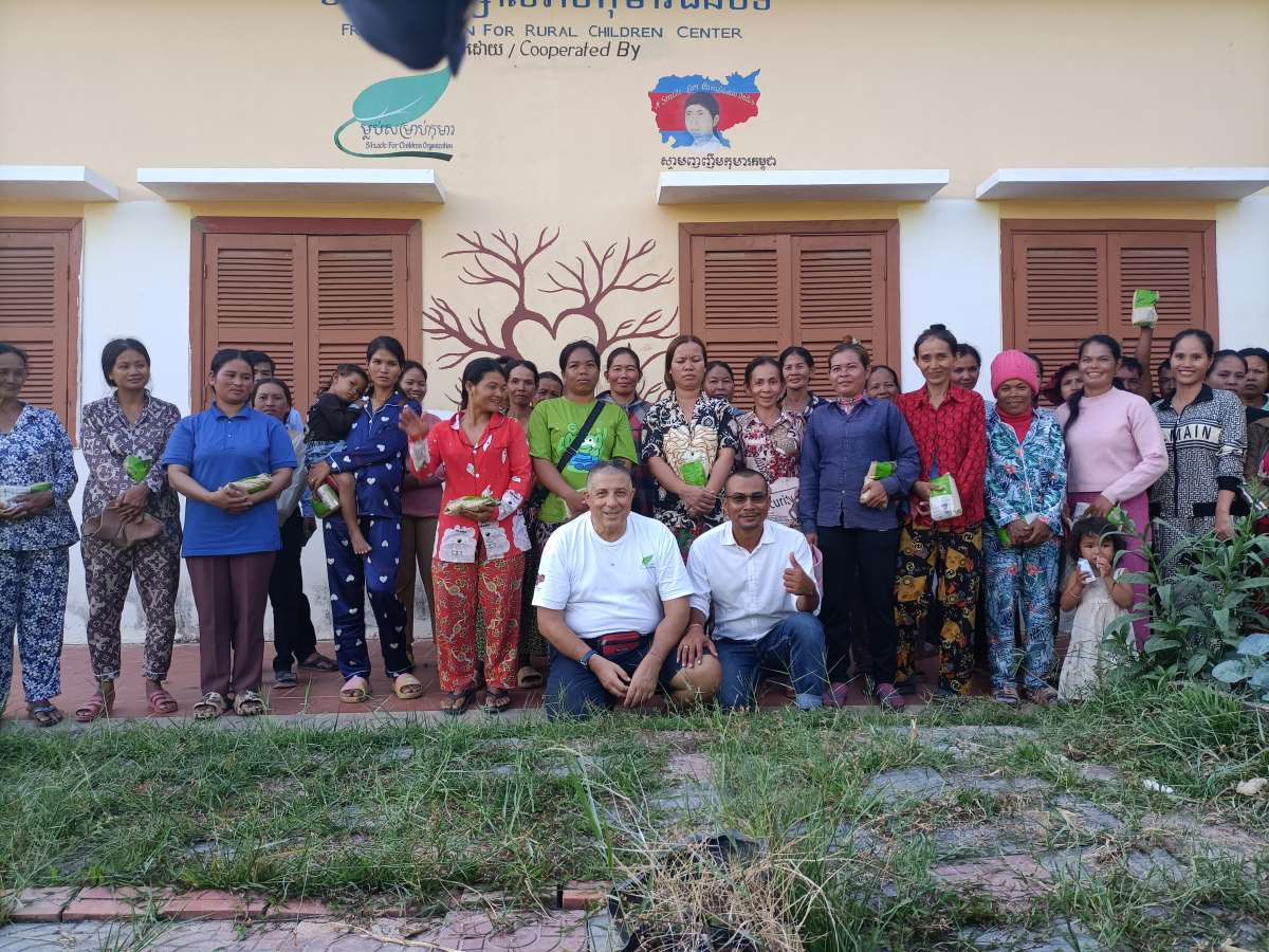 Dopo gli interventi di Channa e degli insegnanti presenti distribuiamo come ringraziamento per avere partecipato pacchetti di zucchero di canna. Un piccolo pensiero e un gesto di cortesia sicuramente gradito. E ovviamente non può mancare la foto di gruppo con tutti i genitori io e Sokkea, proprio sotto il disegno dei loghi di Shade for Children e A Smile for Cambodia Onlus, disegnati sulla parete esterna dell’edificio nuovo.