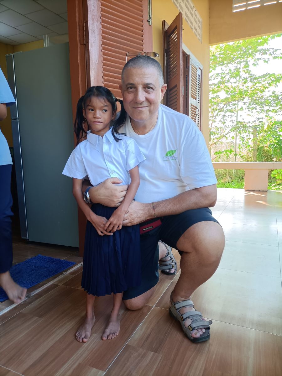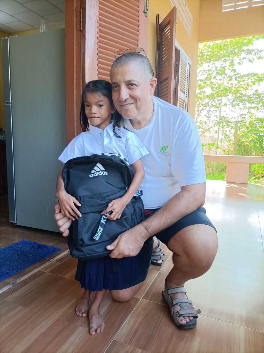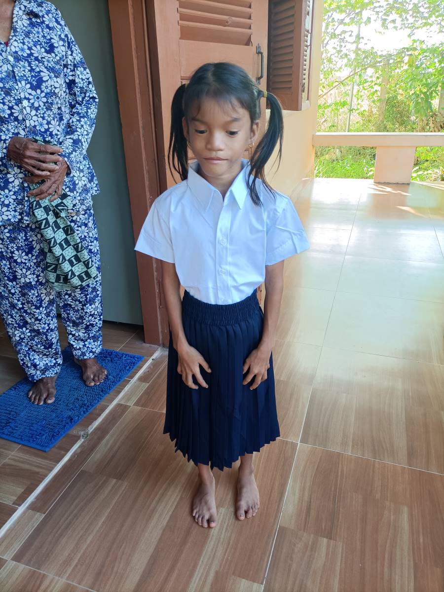 Le ragazze hanno ordine da Sokkea di cercare una divisa scolastica che le vada bene. La prima che estraggono dalla confezione è troppo grande. Meglio al secondo colpo. Sembra proprio della misura giusta. Theara e Malay fanno capire a me e Sokkea che è meglio che usciamo per non mettere in imbarazzo la bimba che deve cambiarsi e indossare la divisa. Quando esce è una studentessa modello ed è bellissima nella sua gonna blu e camicia bianca immacolata. Sembra molto fiera della sua nuova divisa. Mi accuccio vicino al lei per non sovrastarla con la mia stazza e la abbraccio mentre ci fanno le foto. Queste sono le cose che mi fanno letteralmente rinascere. Ci sono ancora cose buone al mondo, basta volerlo e basta davvero poco per raggiungerle. Anche Sokkea fatica a nascondere la soddisfazione e l’emozione per quella bimba così delicata e dolce nel suo essere “diversa”. Lo abbiamo visto anche con altri ragazzi, che la loro diversità è un motivo per voler loro ancora più bene e dedicare loro ancora maggiore attenzione.