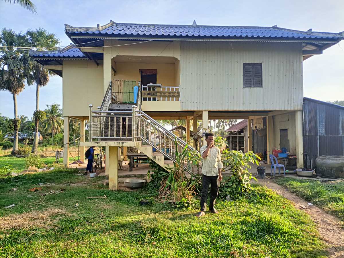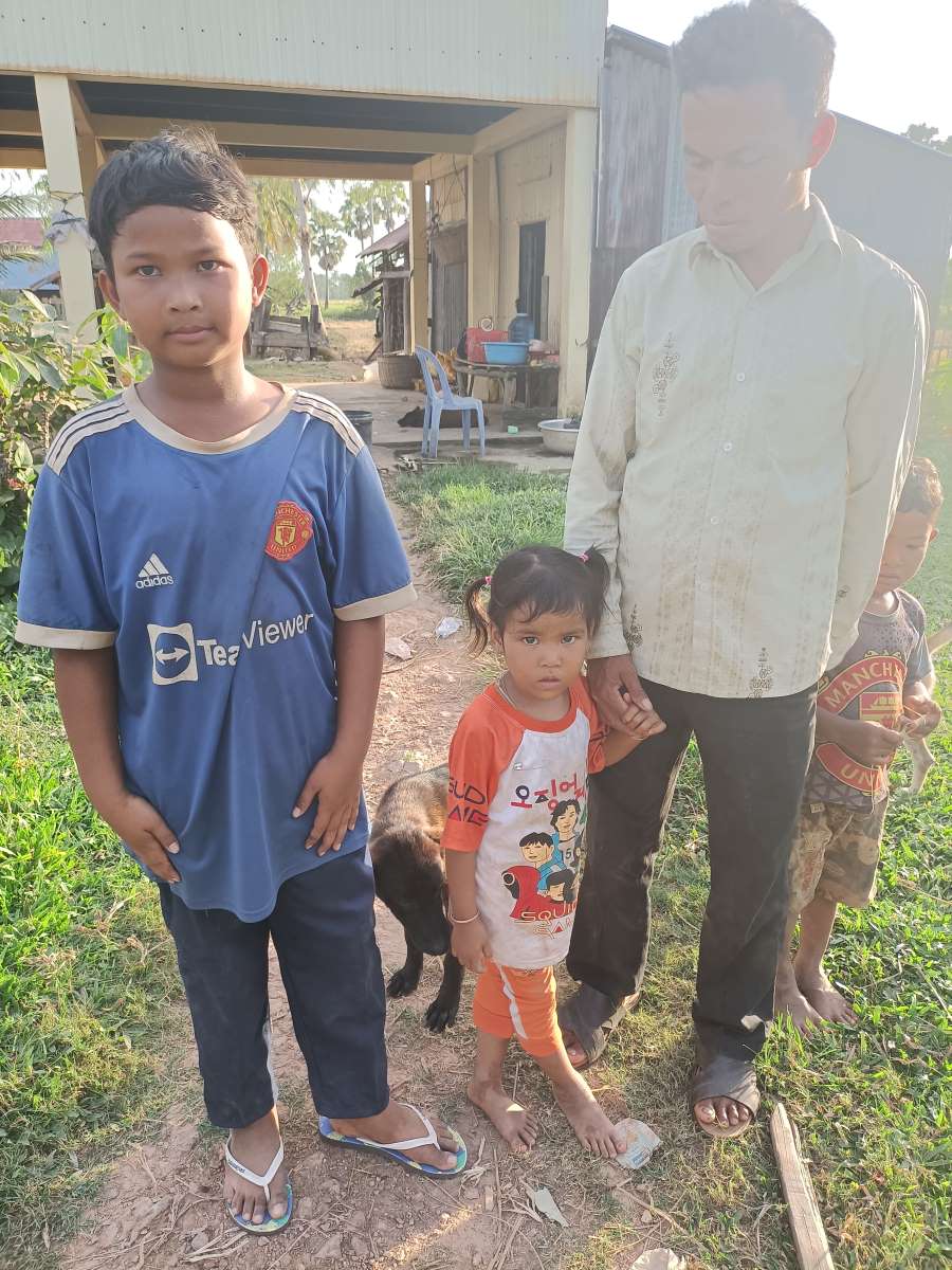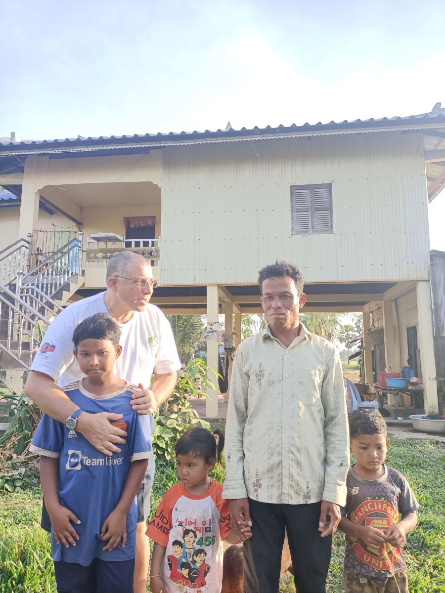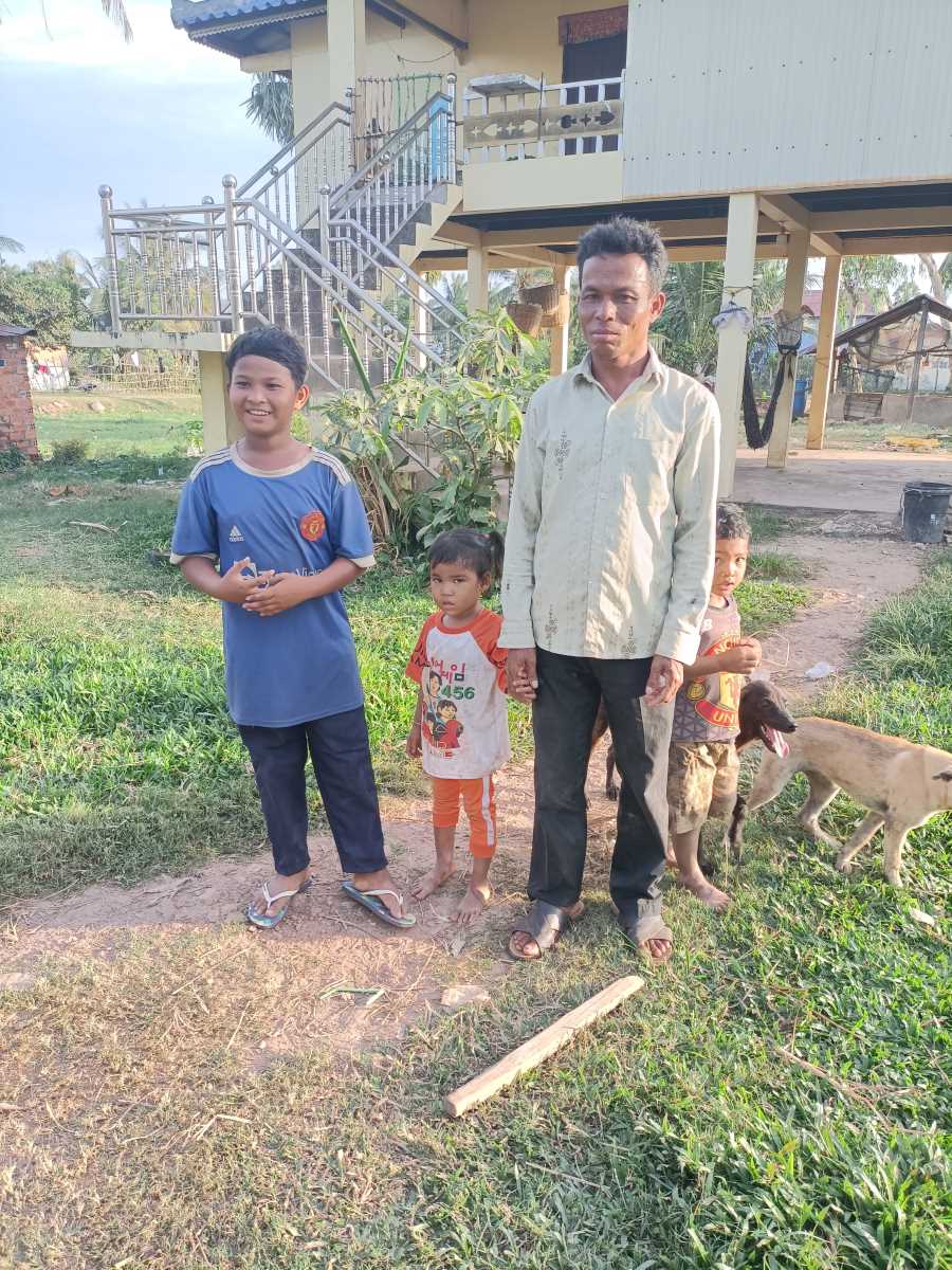 Andiamo dall’altra parte del villaggio, oltre la strada Kep-Kampot. La prima casa che visitiamo me la ricordo da una visita di qualche anno fa. La visita la facciamo a Phum Sokneng, ma prima di lui aveva partecipato al nostro programma di sostegno a distanza il fratello maggiore Phum Sockeng. Sokneng, inserito adesso nel sostegno a distanza, ha 11 anni e frequenta quest’anno la quinta primaria. Suo fratello Sockeng adesso ha 18 anni e lavora come pescatore, lavoro molto pesante. In famiglia c’è anche una sorellina di 3 anni. C’è il papà con Sokneng. La mamma è al vicino mercatino che si affaccia sulla statale Kep-Kampot a vendere pesce.