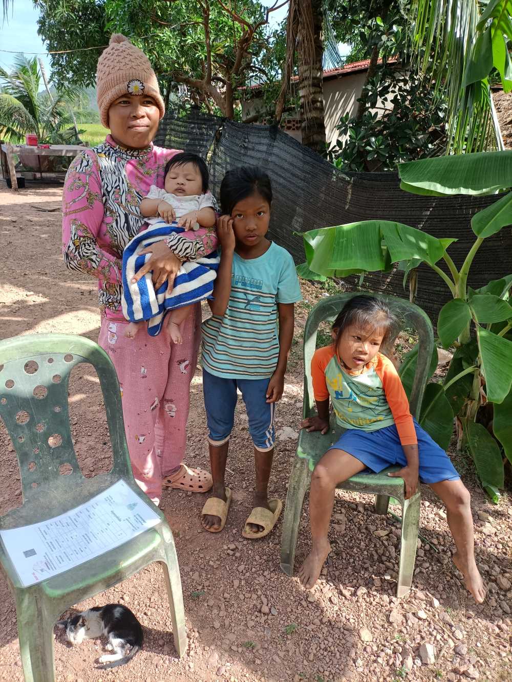 Partiamo di buonora e alle 9 siamo già alla prima casa. Sokkea vuole mostrarmi una situazione particolarmente critica. Mamma giovane con due bimbe di 8 anni e 5 anni e una piccolina di 2 mesi. Le due bimbe più grandi sono state inserite al Centro da metà novembre. Anche Barbara, la nostra amica che ha voluto venire qui a salutare la bambina che lei e sua mamma sostengono, è stata qui ed è rimasta molto colpita dalla situazione.