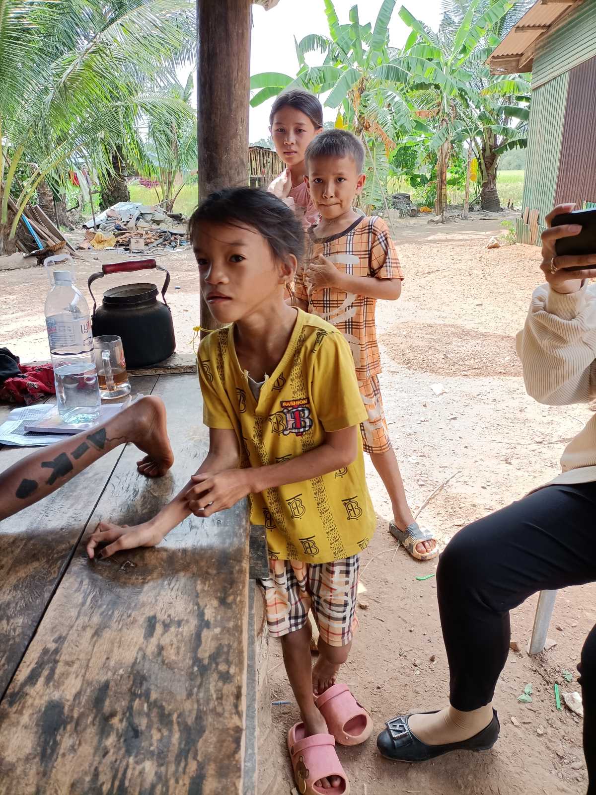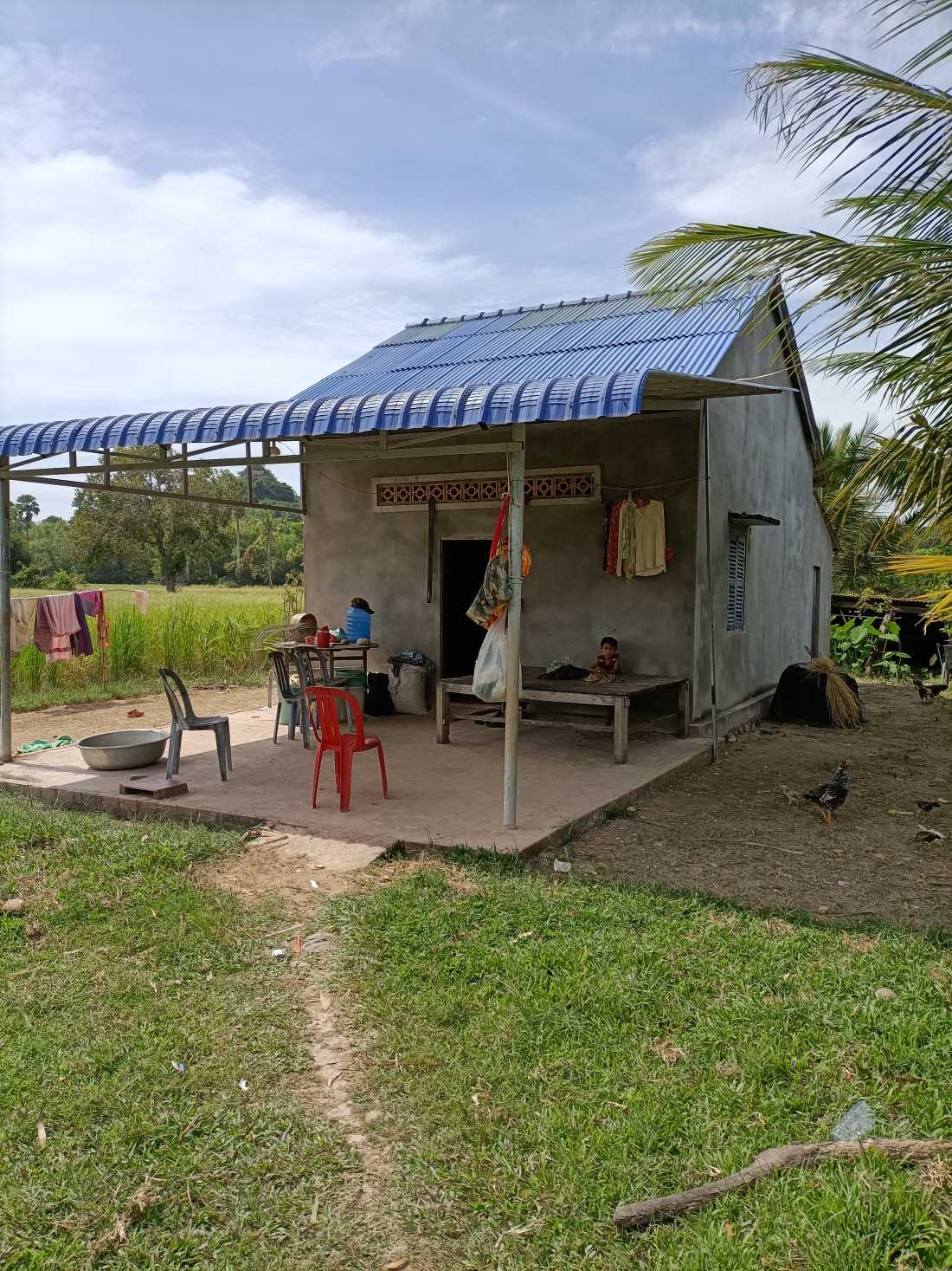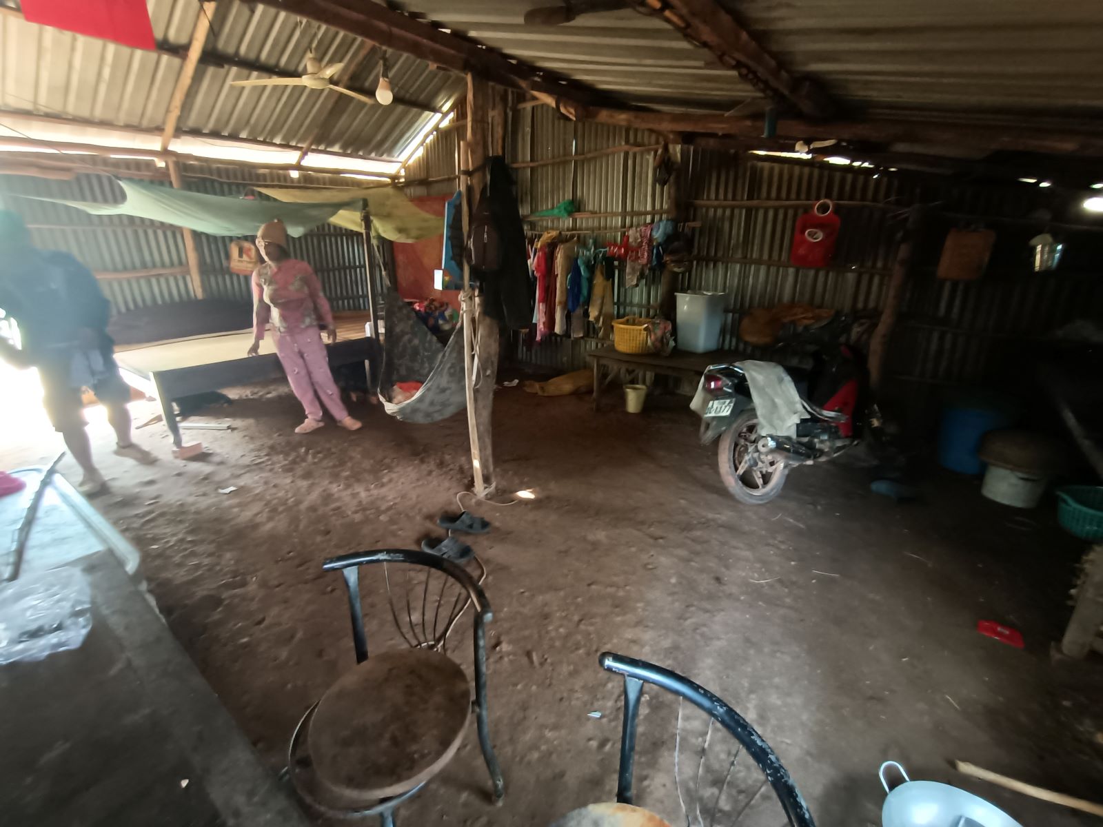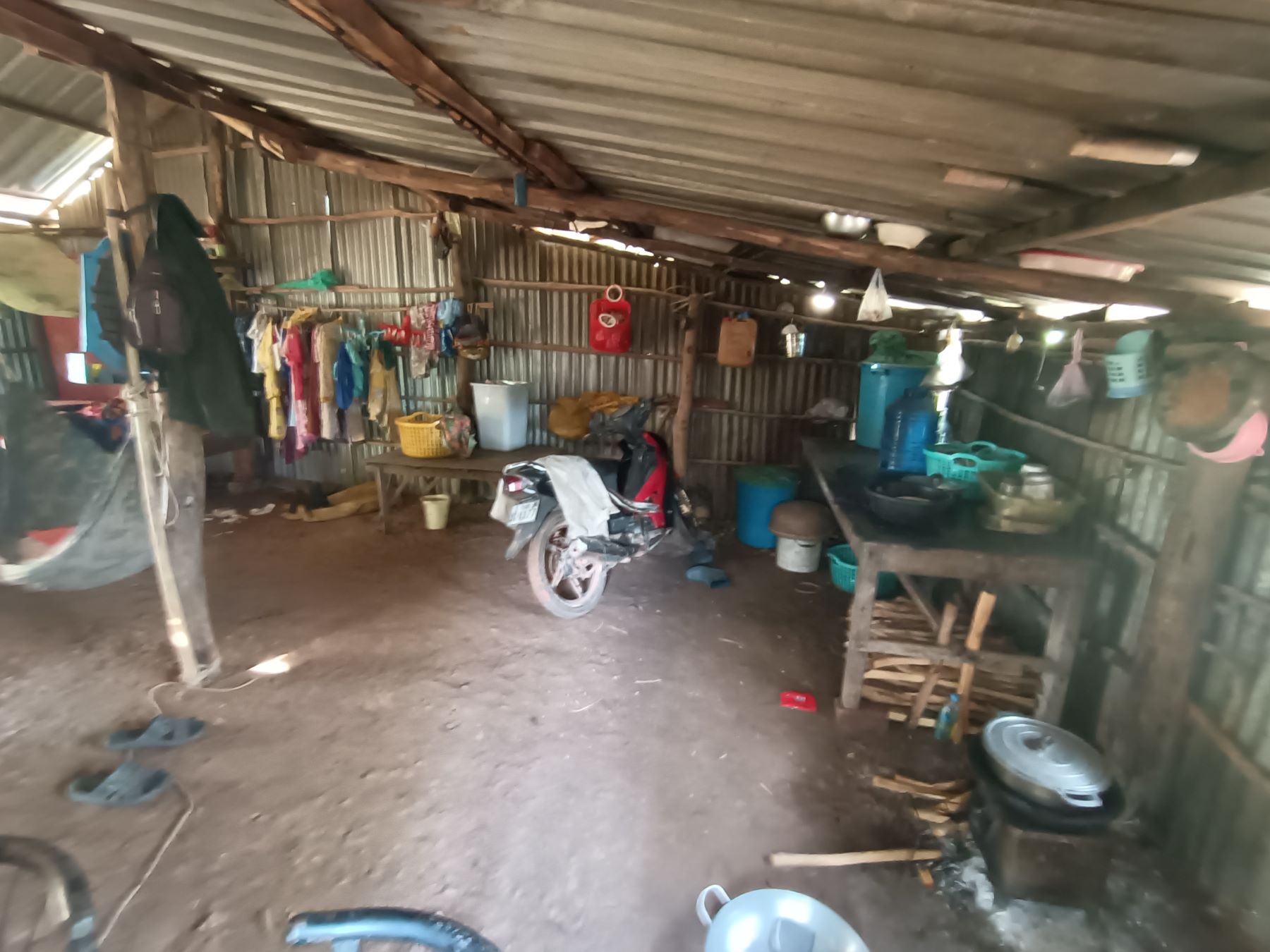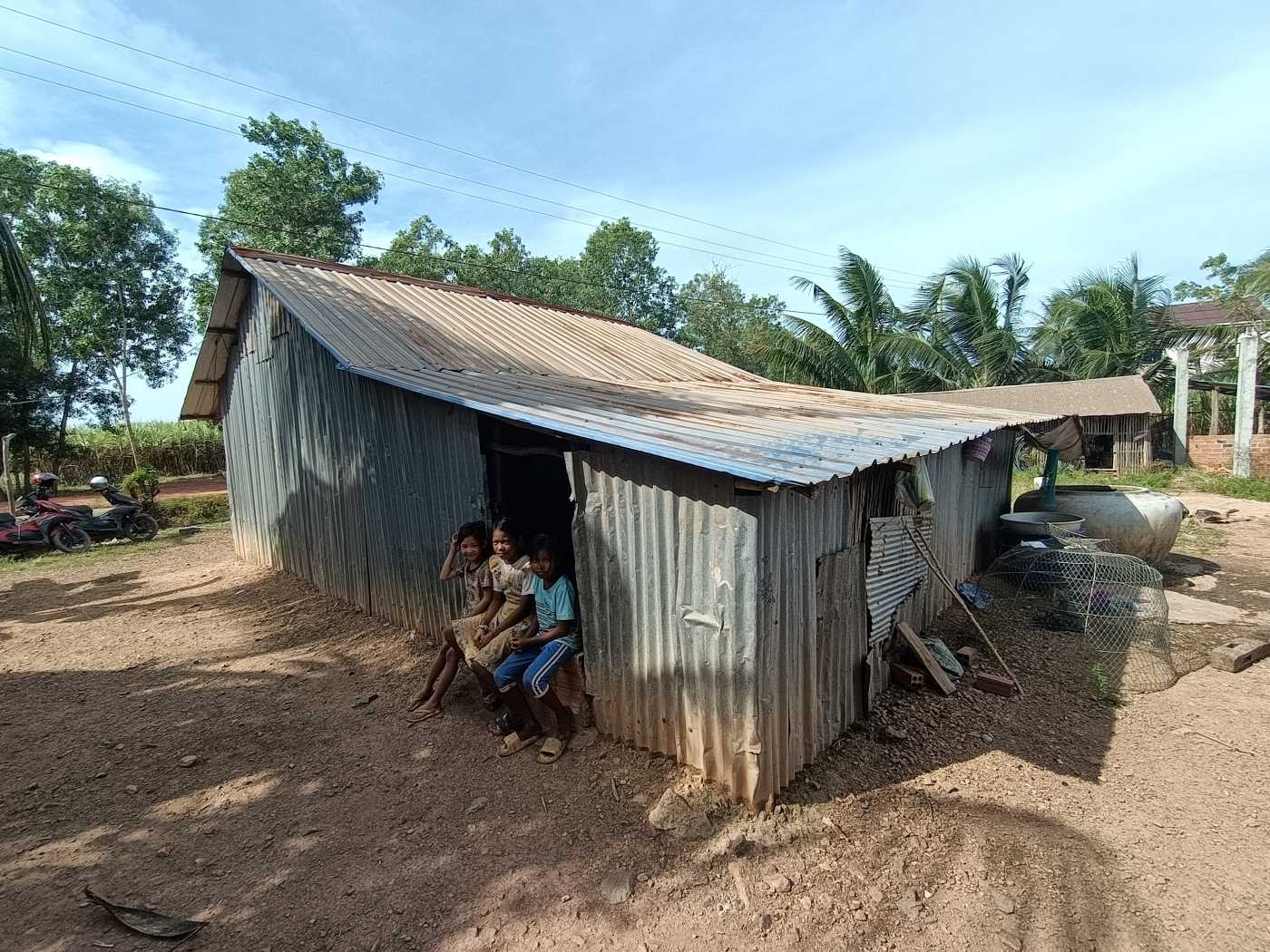 La casa è fatta di lamiera. Un unico ambiente in cui c’è un angolo per cucinare, due panconi per i genitori e i figli, il ricovero per un motorino prestato da un vicino. E in più la piccolina ha una bruttissima ernia ombelicale che ovviamente non stanno curando perché non hanno soldi per portare la bambina all’ospedale. Sokkea è riuscito a convincere i genitori a portarla al Sonya Kill Hospital di Kampot, il nostro ospedale di riferimento. Copriremo le spese di trasporto (a dire la verità si è già fatto avanti un donatore che vuole dare tale contributo) e poi sulla base di quello che diranno i dottori si deciderà il da farsi, con eventuale supporto delle spese mediche necessarie.