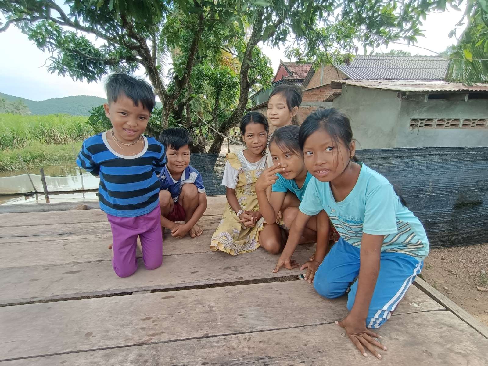 Con il primo fardello nel cuore alleviato da questi sorrisi ci muoviamo oltre. E’ adesso il turno del nostro Sakorn, 8 anni che frequenterà quest’anno (dal 1 dicembre) la terza primaria. Lo troviamo con la mamma e il fratellino di 4 anni. Il papà lavora come security guard in un resort a Rabbit Island, l’isoletta che sta di fronte a Kep a circa mezz’ora di barca a motore. La famiglia non ha una casa propria e vive nella casa della nonna materna.