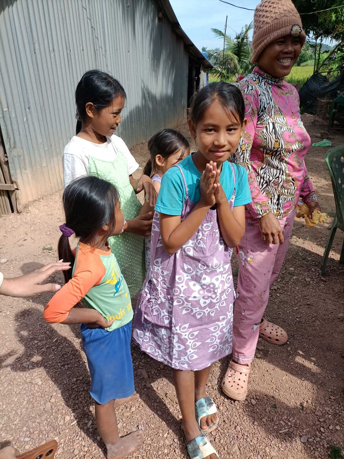 Nel frattempo sono arrivati altri bambini, incuriositi dalla nostra presenza. Silvio ha portato dei vestiti e decidiamo di distribuirne un po’ qui. I bimbi dapprima un po’ timidi, prendono poi a provare i capi che Sokkea suggerisce loro. Ognuno riceve qualcosa. Un vestitino per le bimbe. Una maglia per i bimbi. Un pantaloncino per i più piccoli. “Okun, loak Kruu” “Grazie, Maestro”. Le vocine sono un filo sottile ma basta guardarli negli occhi per vedere la loro felicità per quello che hanno ricevuto.