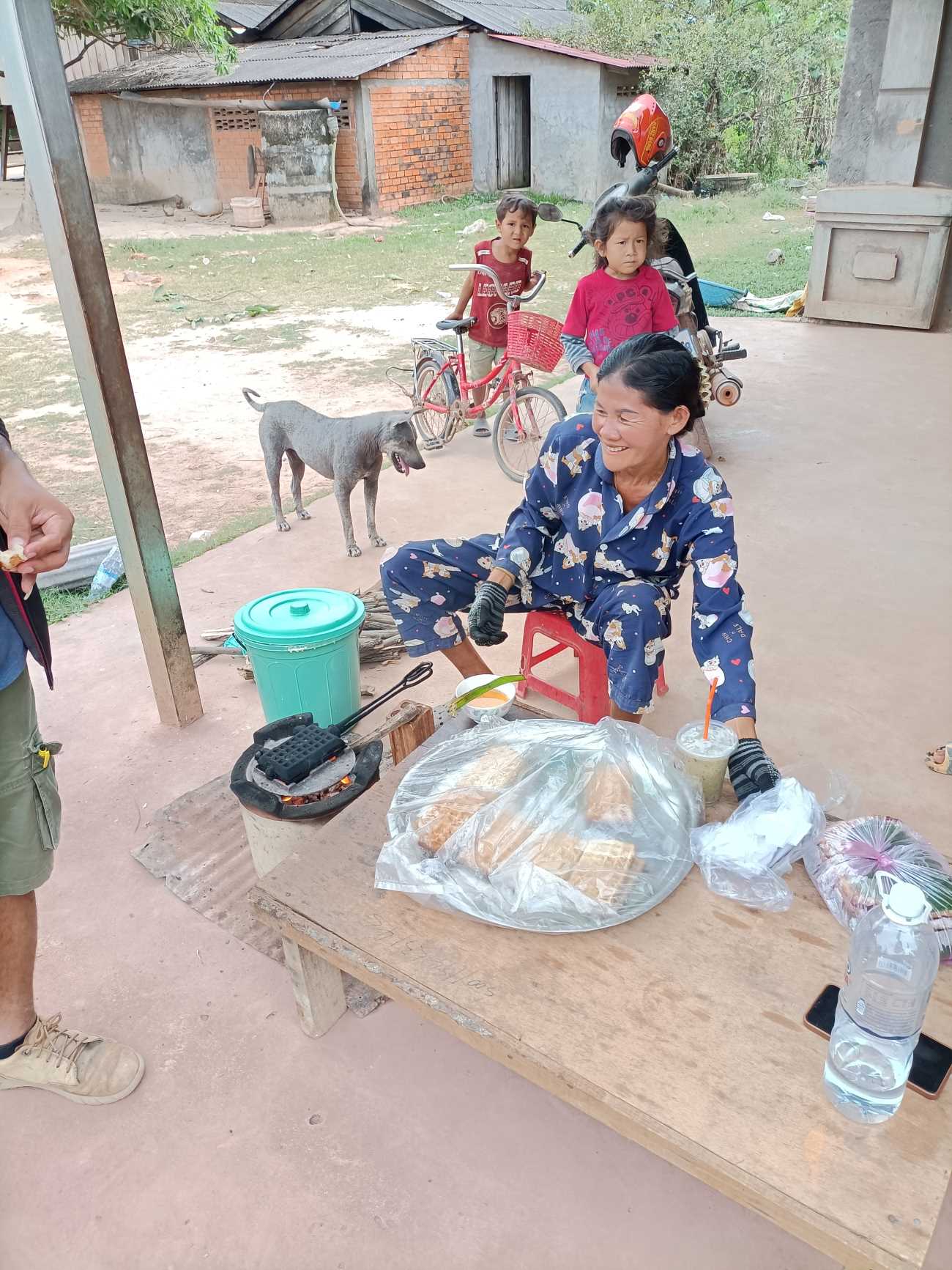 Salutiamo dopo le foto e ci avviamo verso il nostro Centro. Ma mentre passiamo accanto ad una casa sulla strada Sokkea si ferma da una signora che sta cucinando una specie di pancake su un fuoco alimentato dalla legna. Assaggiamo. Buono. E poi quasi per caso ci rendiamo conto che lì accanto c’è un’altra delle nostre ragazze. Con un bimbo piccolino in braccio, non l’avevamo riconosciuta la nostra Mouyhour, una delle nostre mascotte quando era piccolina. Ormai ha 15 anni e quest’anno frequenterà la classe 10, quindi la high school. Sua mamma, seduta lì accanto, tratti quasi più vietnamiti che cambogiani, è giovanissima, ha solo 33 anni. Oltre a Mouyhour ha un’altra femmina di 13 anni e un piccolino di 1 anno che è quello che Mouyhour sta coccolando. La mamma ci dice che aveva avuto un altro maschietto prima di questo, ma è morto a causa di una febbre altissima che lo ha colpito. Lo avevano portato a Phnom Penh al Kantha Bopha Hospital, unico ospedale gratuito per i cambogiani, ma dopo due mesi era mancato.