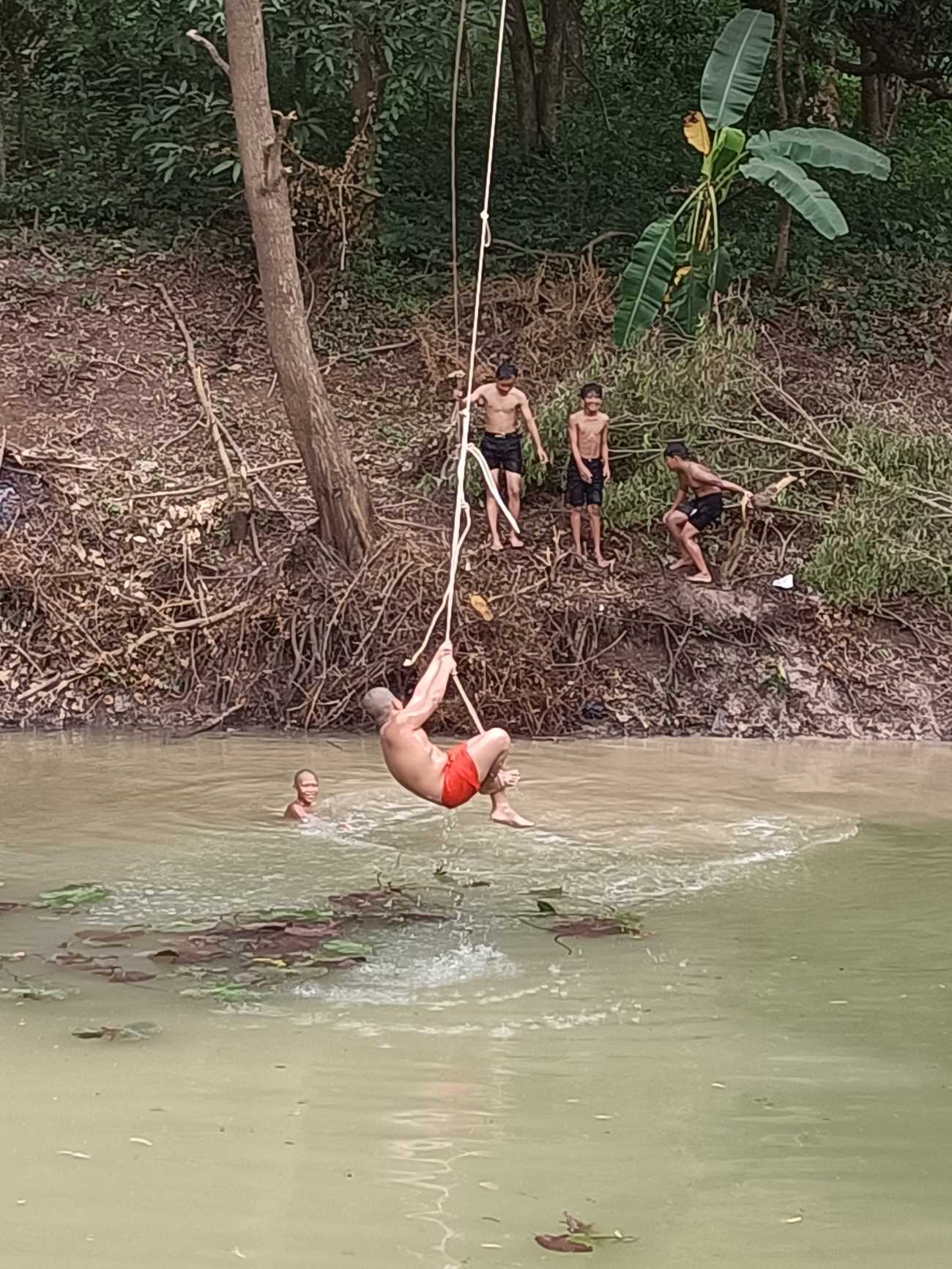 Lungo la strada la nostra attenzione viene attirata da grida e risate di bambini, che saltano e si tuffano in un piccolo stagno a lato della strada. Appena mi affaccio “Hello teacher”. Sono alcuni dei nostri bambini. Riconosco Phearom. Con loro c’è anche uno dei giovani monaci che stanno nella pagoda di Phnom Sosear, appena lì sopra. “Chumriaplia” “Arrivederci”. “Chuap Knia nou salaa tnai saaik”. “Ci vediamo alla scuola domani”.