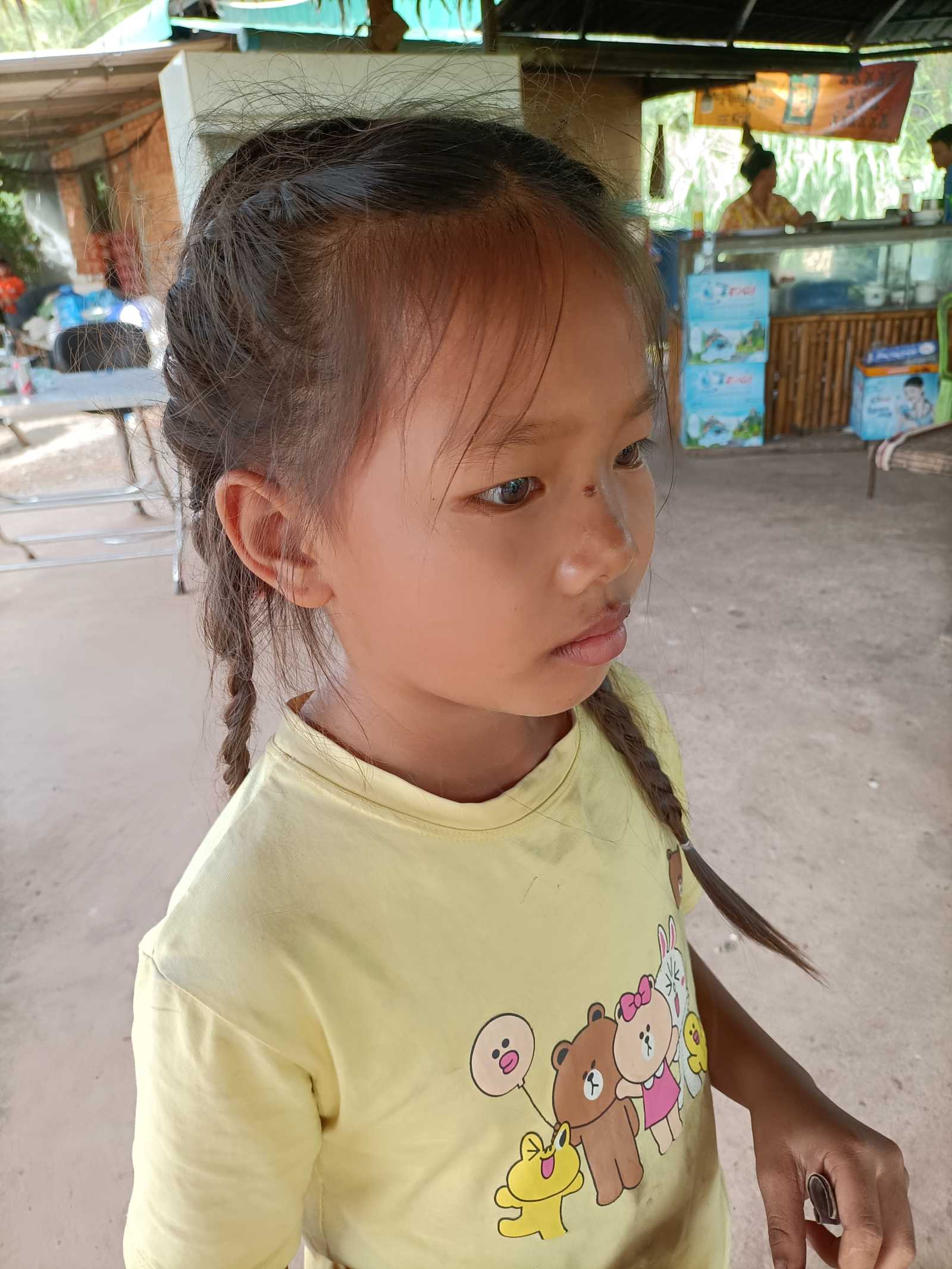 Raggiungiamo il piccolo ristorante di campagna che da un paio d’anni è stato costruito a poca distanza dal nostro Centro, sulla strada che porta alla casa della mia Kemheng. Mentre aspettiamo di essere serviti arriva un’altra delle nostre bimbe, Soksalin. E’ cresciuta tantissimo, ma ha mantenuto i suoi bellissimi lineamenti infantili.