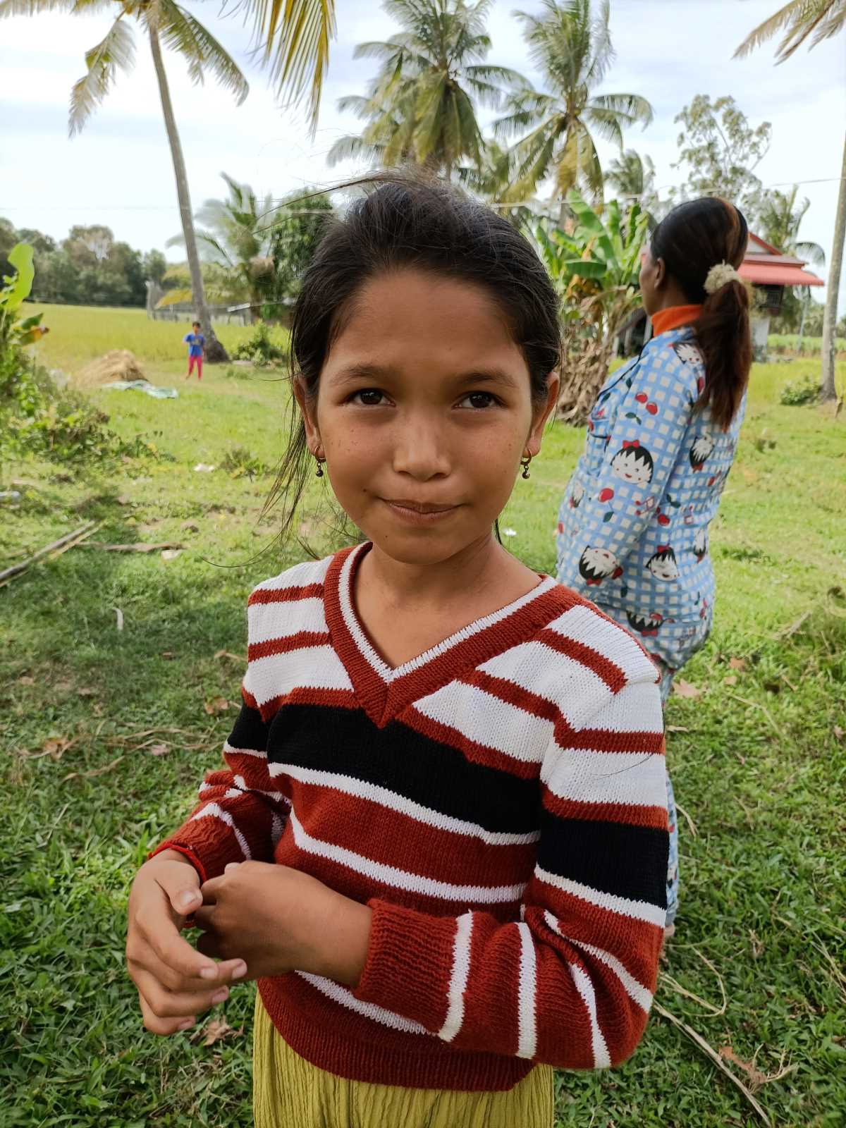 Cerchiamo Paovchou, uno dei nostri piccolini, ma non c’è ci dicono i vicini. Non appena arriviamo ci si fa intorno un gruppo di persone piuttosto folto. E all’improvviso appare questa bimba vestita in un pigiamino giallo. Magra magra. Il viso quasi scavato. Fa fatica a parlare. Per lei parla la nonna. Si chiama Sievmean. Ha 8 o 9 anni, non è chiaro. Ci dicono che non va a scuola. Non ci è mai andata.
