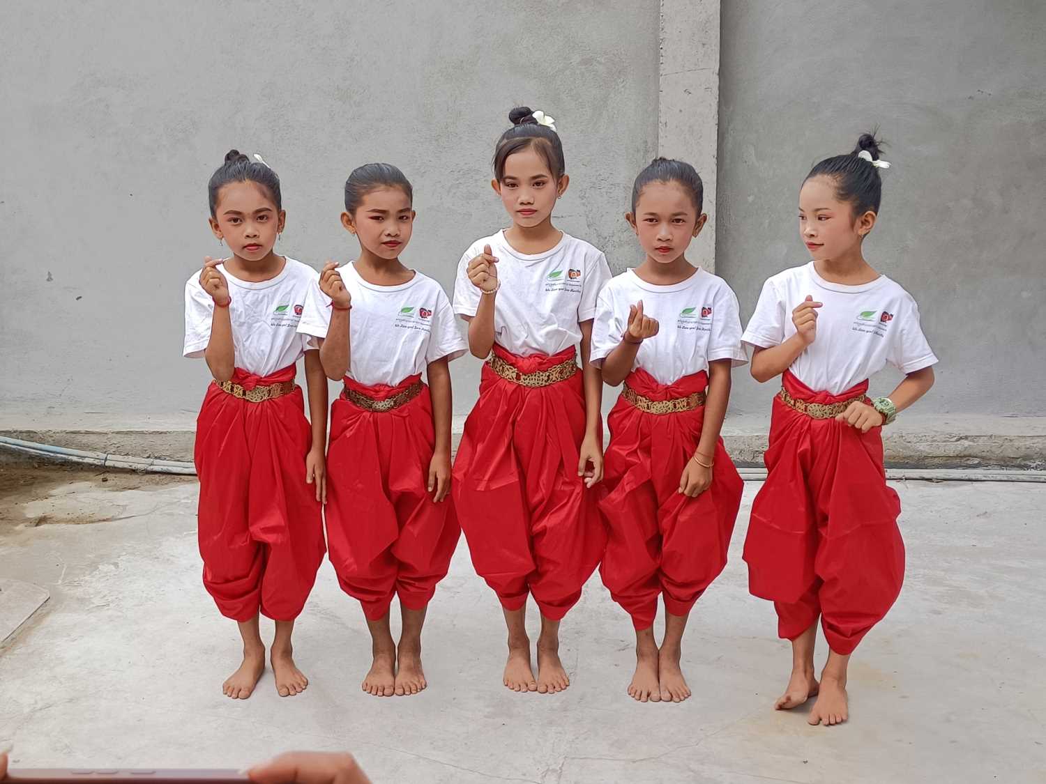 Ma eccoci finalmente allo spettacolo di danza. Le bambine sono divise in due gruppi con colori diversi dei loro costumi. La loro età va dai 6-7 anni ai 9-10 anni. Un primo gruppo, guidato da Ly Hua, indossa pantaloni verde e oro con camicia bianca bordata oro. Il secondo gruppo indossa invece la nostra maglietta Shade for Children bianca con pantaloni rossi.