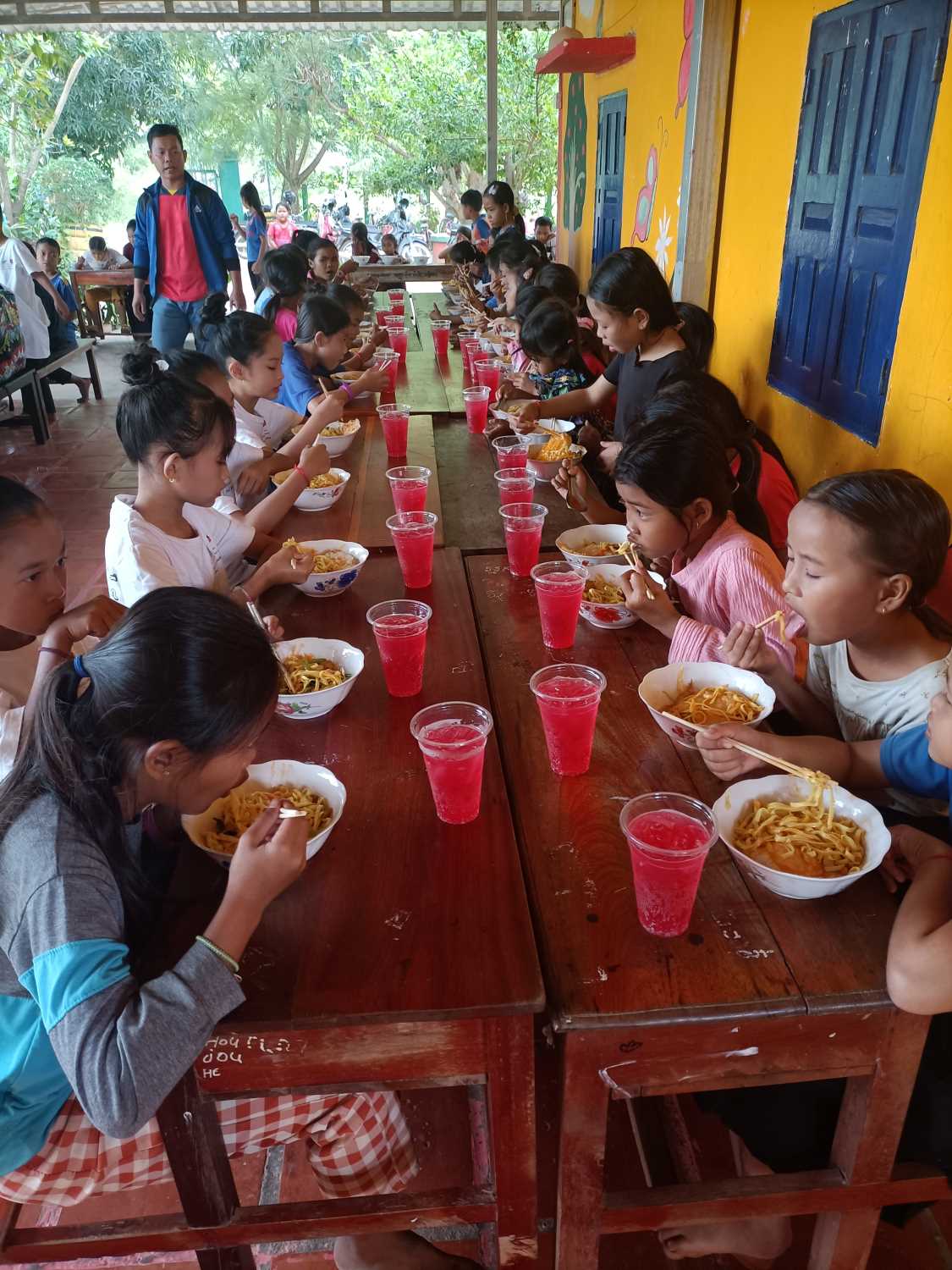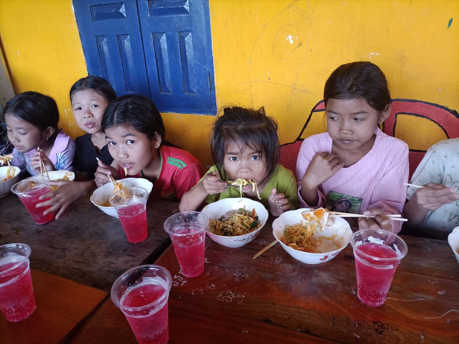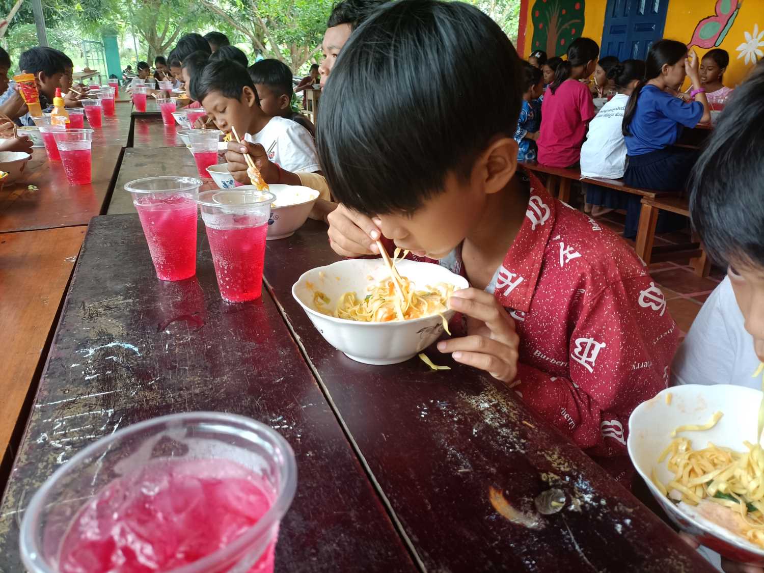 Alle 11 è fissato il pranzo con tutti i bambini. Così presto per consentire loro di rientrare a casa per le varie attività del pomeriggio e per il ritorno al centro nella seconda parte della giornata. Il menù prevede ottimi yellow noodles, che i bambini (come noi) gradiscono molto. Il pranzo insieme vuole anche essere un regalo di compleanno per Silvio. E infatti a fine pranzo appare una bella torta con le candeline che indicano l’età del nostro fortunato. Qui non sveleremo l’età per motivi di privacy, ma diciamo che gli anni sono poco più di 18.