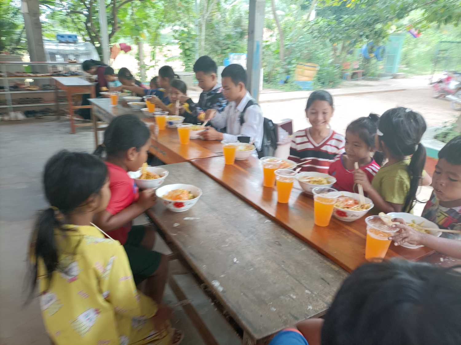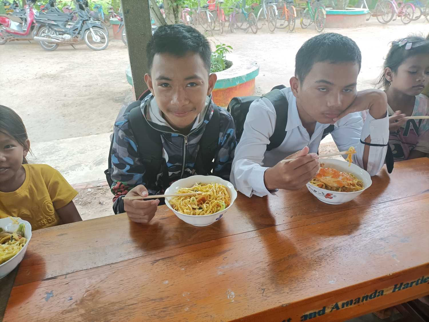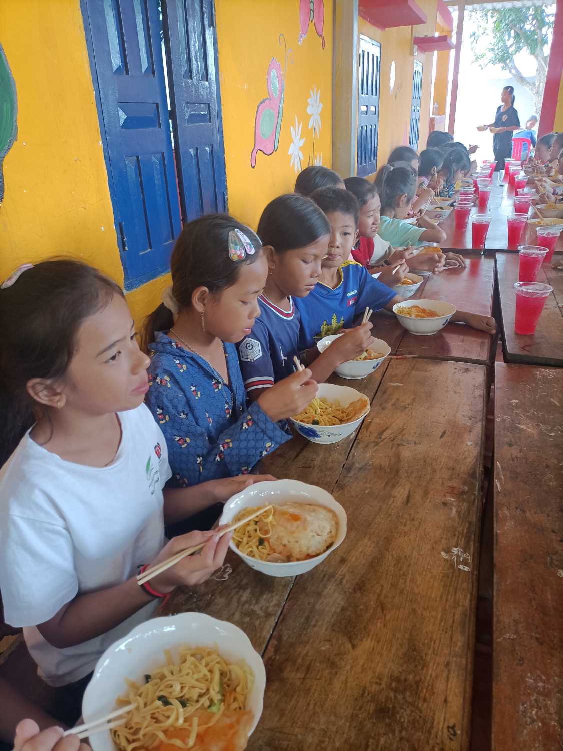 Alle 11 è fissato il pranzo con tutti i bambini. Così presto per consentire loro di rientrare a casa per le varie attività del pomeriggio e per il ritorno al centro nella seconda parte della giornata. Il menù prevede ottimi yellow noodles, che i bambini (come noi) gradiscono molto. Il pranzo insieme vuole anche essere un regalo di compleanno per Silvio. E infatti a fine pranzo appare una bella torta con le candeline che indicano l’età del nostro fortunato. Qui non sveleremo l’età per motivi di privacy, ma diciamo che gli anni sono poco più di 18.