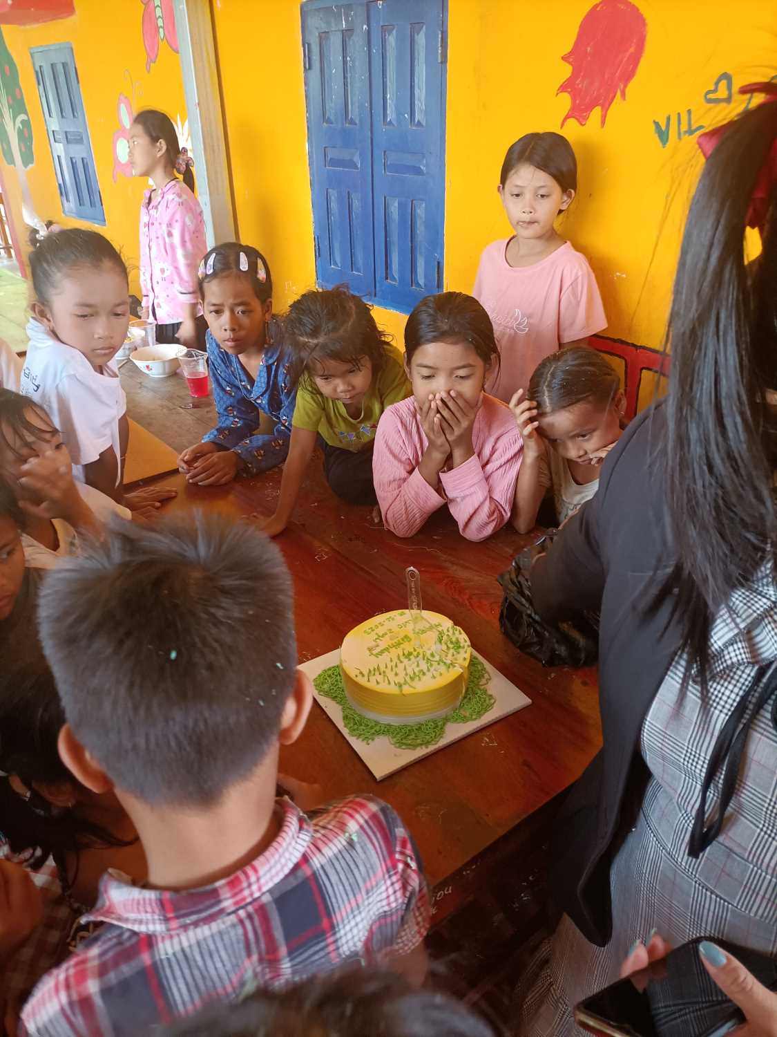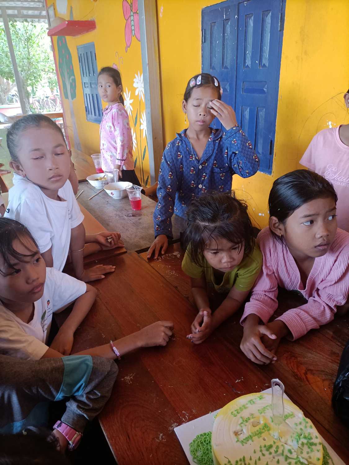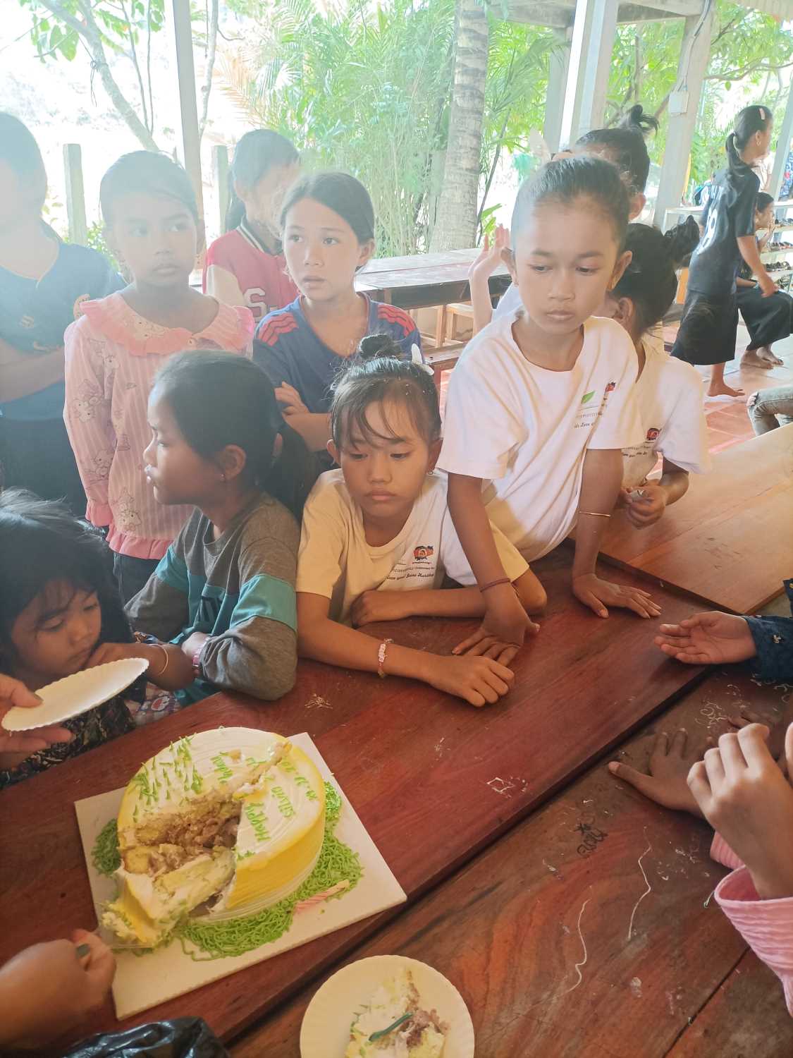 La cosa incredibile di queste torte cambogiane è che sembrano minuscole a vederle, ma riescono a soddisfare una quantità inimmaginabile di bambini e adulti. Ovviamente in pole position, di fronte alla torta ci sta la piccola Kunthea onnipresente e coccolata da tutti.