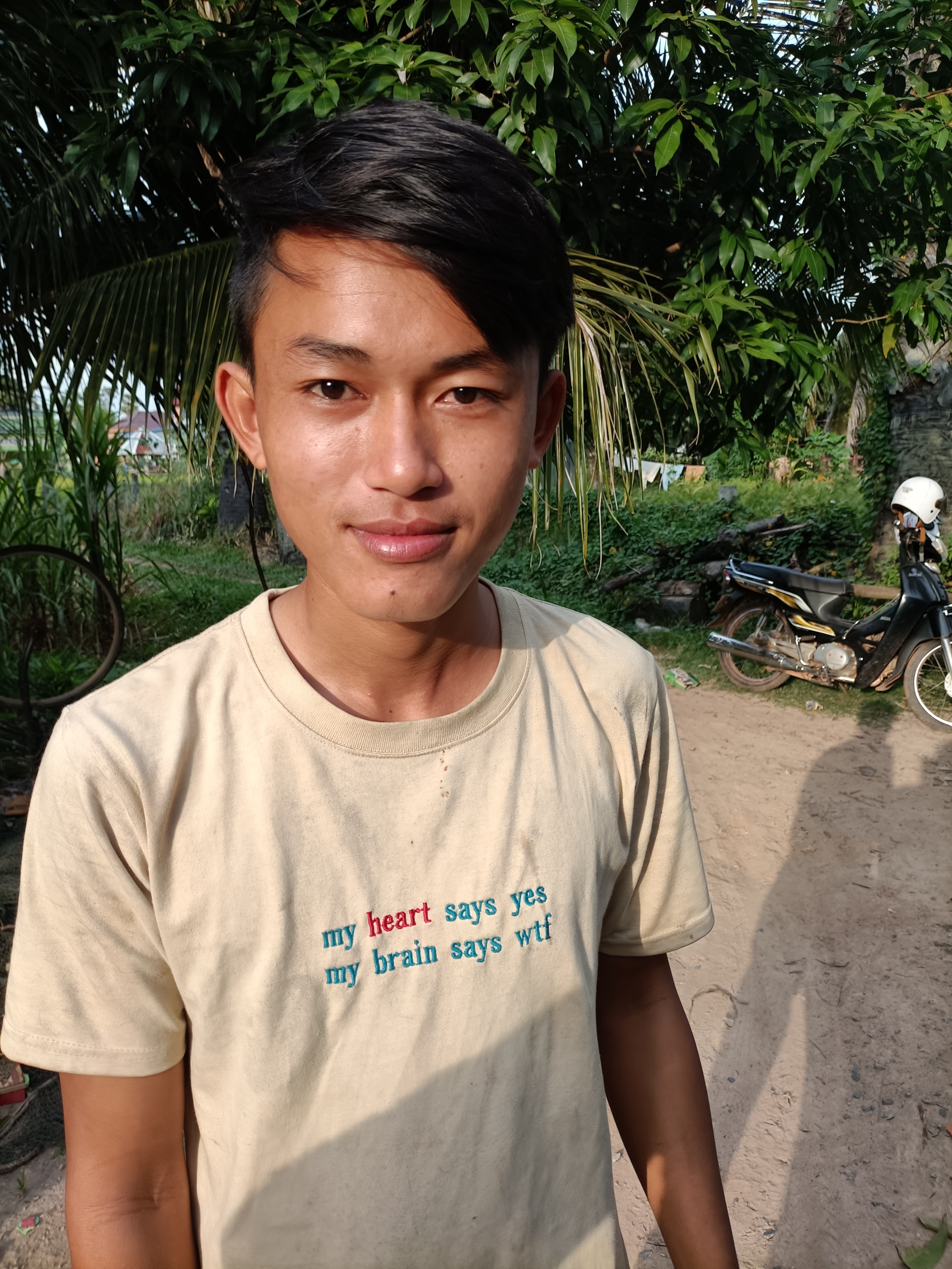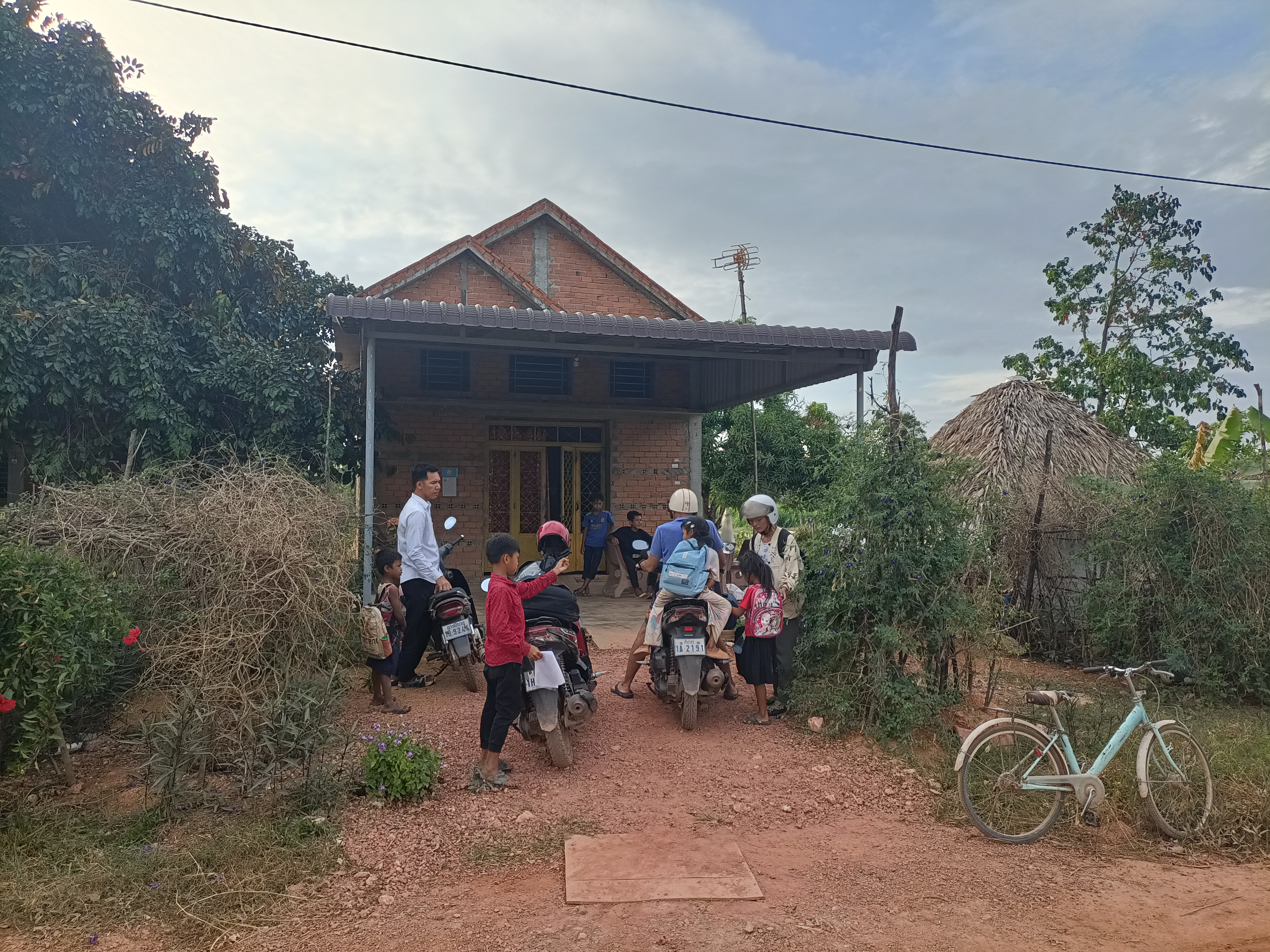 Lungo la strada per andare alla casa di Kao Lina e Rothana passiamo da casa di Phourk Socheat (che arriva poco dopo) e suo fratello Rathana che è sul sellino della mia moto ed ha approfittato del passaggio, così come hanno fatto gli altri bambini di cui visitiamo le case.