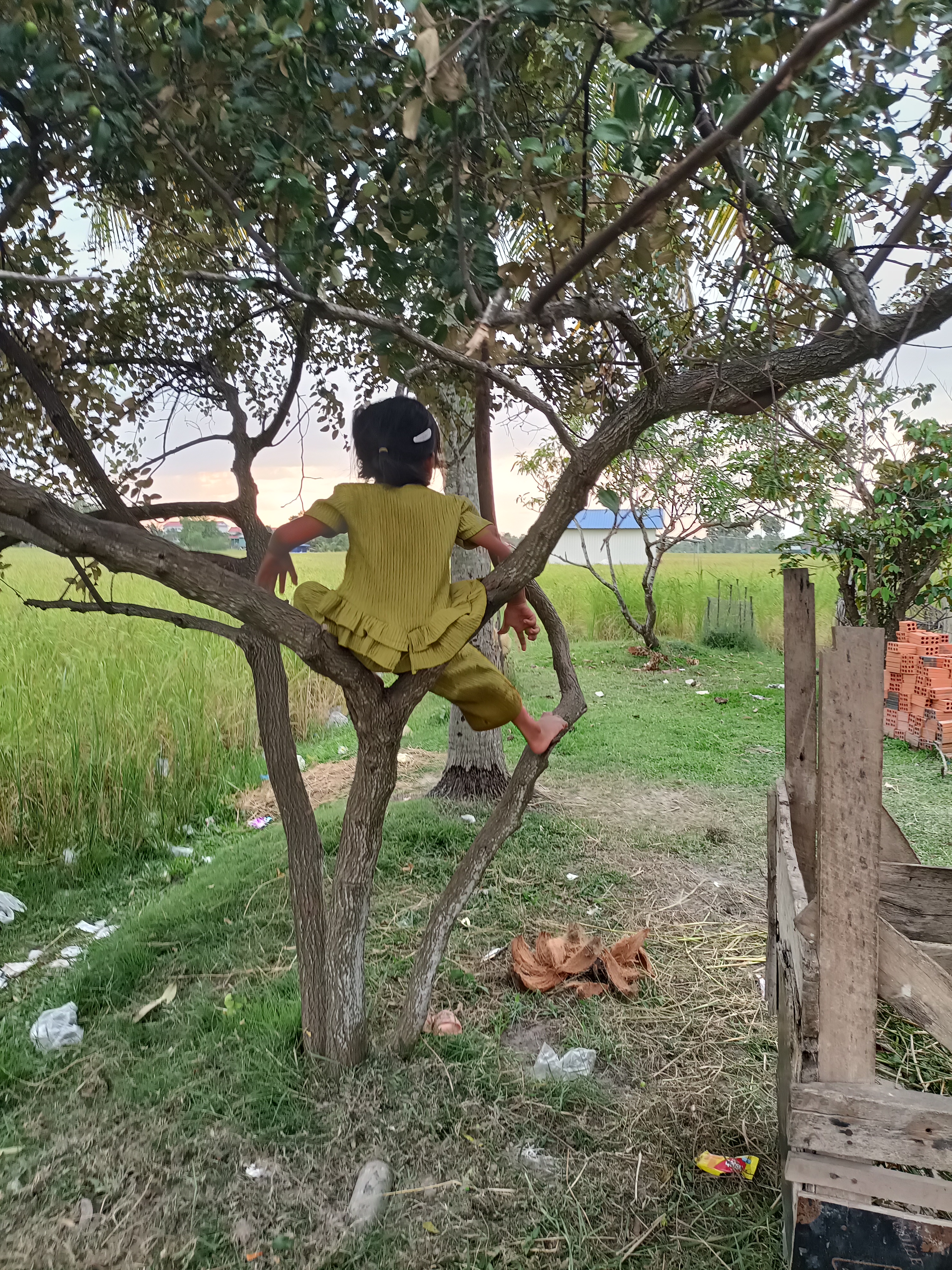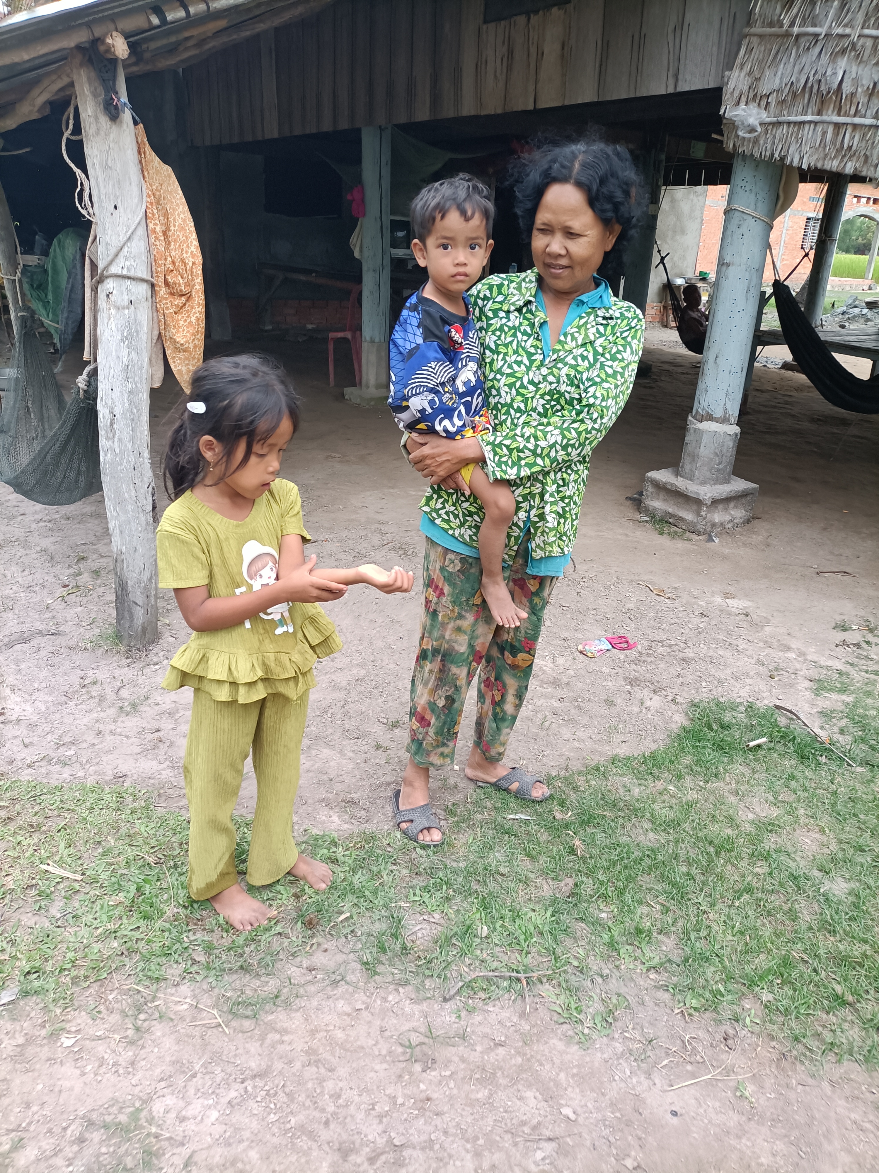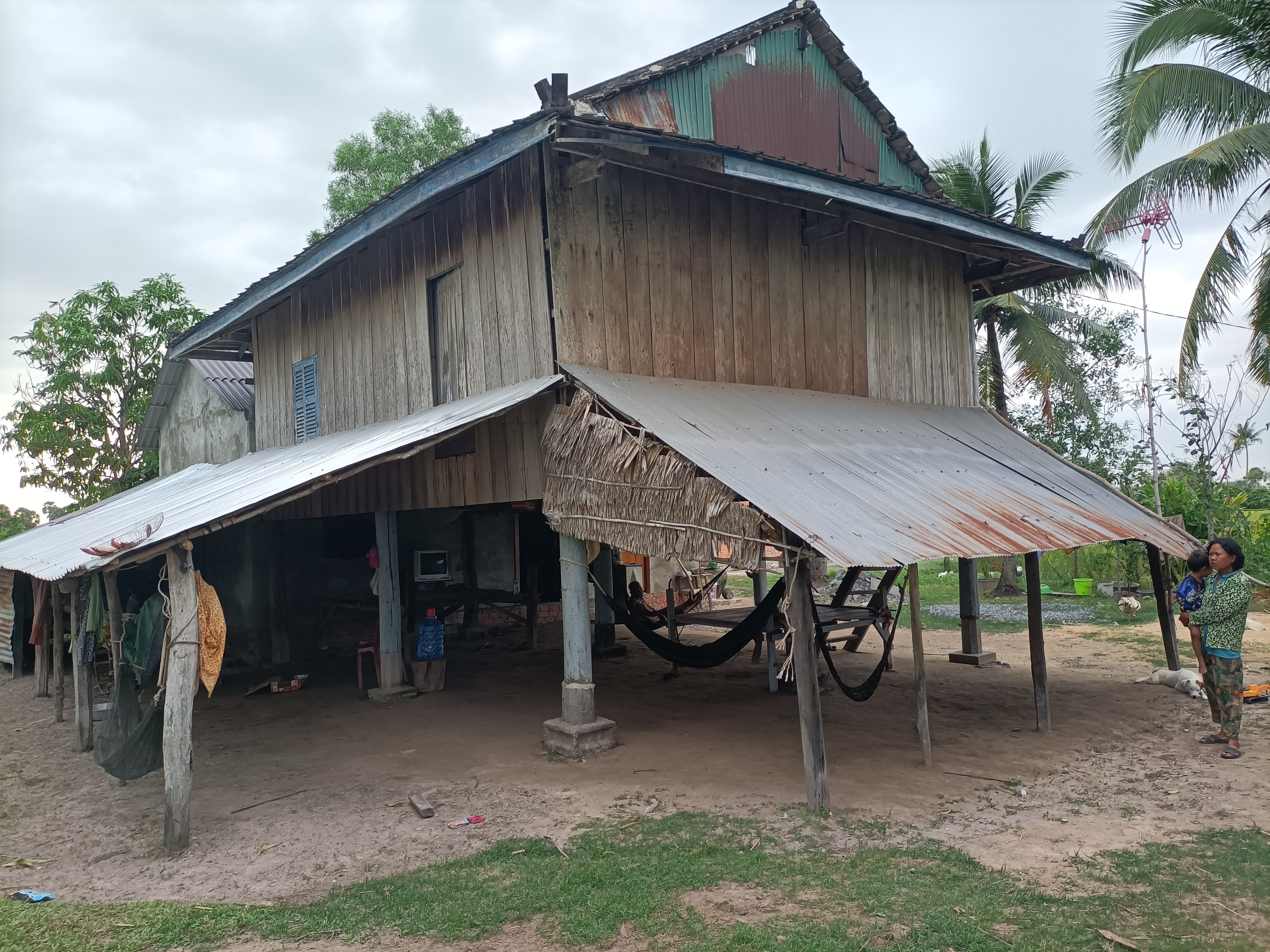 Proseguiamo a piedi sempre più in mezzo alle risaie per arrivare alla casa di Sievmean, anche lei inserita recentemente in sostegno a distanza in sostituzione di Malay che è andata all’università. I genitori non ci sono. Sono a Kep a lavorare. La mamma fa la cameriera in un resort e il papà fa il muratore. L’accudisce la nonna, che non so come faccia a gestirla vista l’iperattività di Sievmean, che come arriva a casa sparisce arrampicandosi su un albero. La nonna ha la mia età 62 anni, portati discretamente bene per una donna cambogiana. Nei miei giri in queste campagne ho conosciuto persone anche significativamente più giovani di me, che sembravano i miei genitori.
