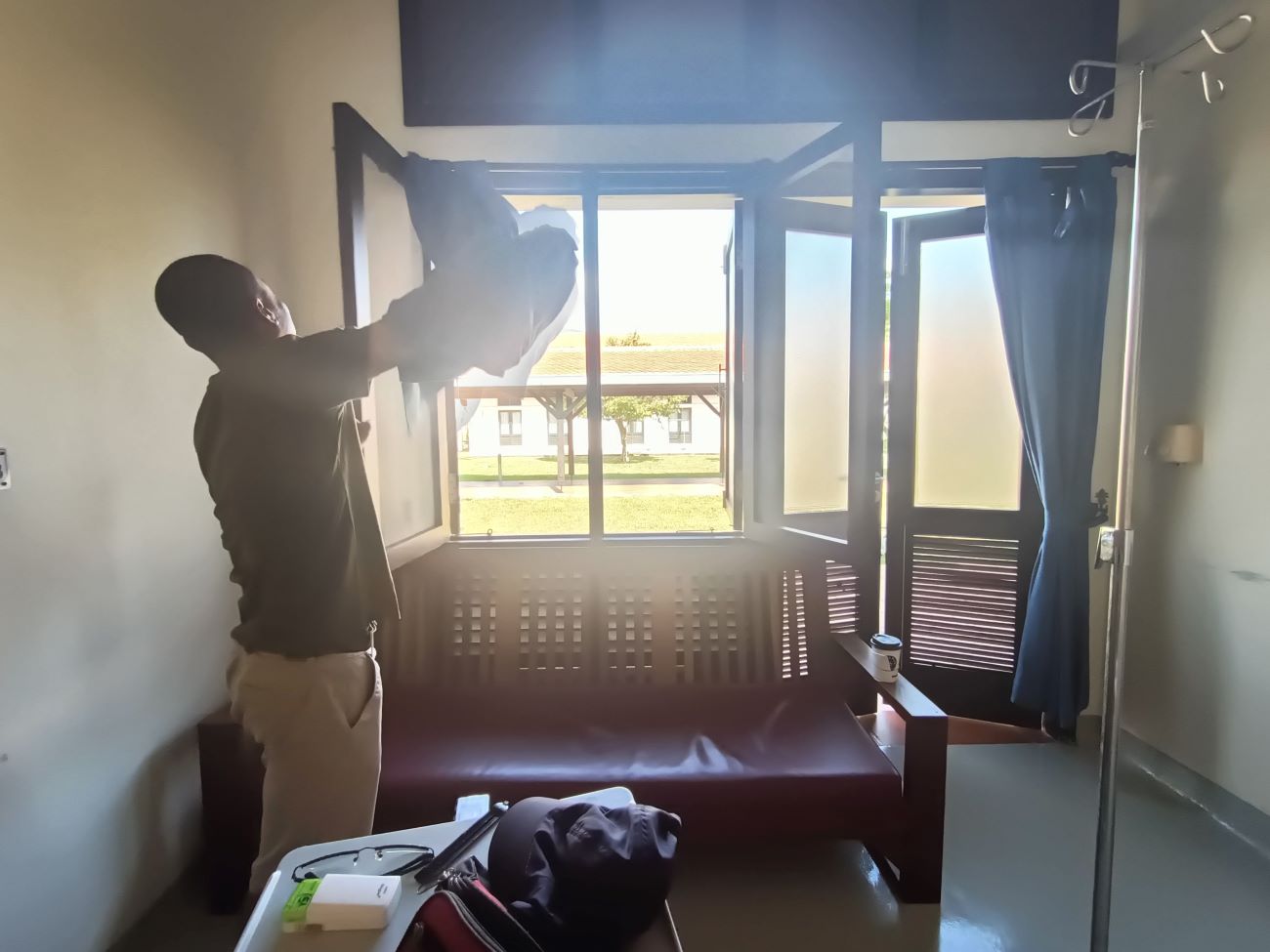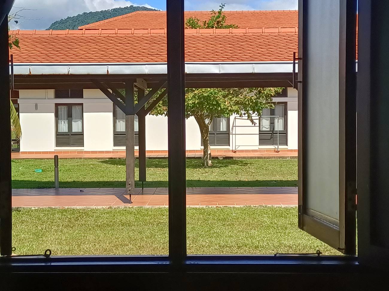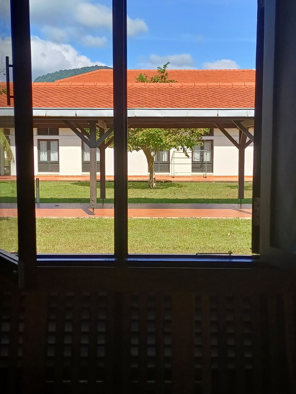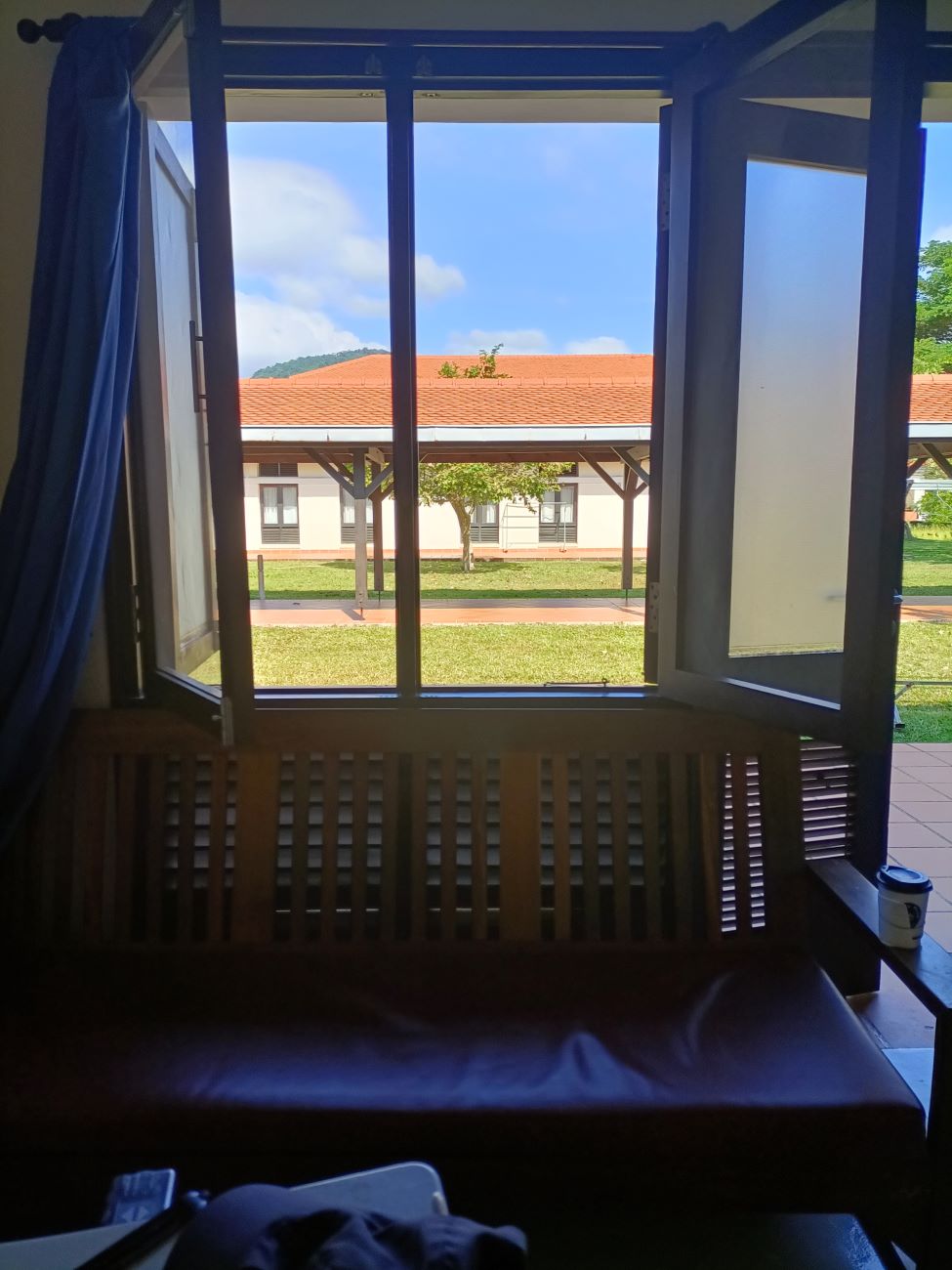 Arriva Sokkea con la mia colazione. Addirittura 4 brioche, due prese dalla mia fornitrice di fiducia di fronte al Today Coffee e due dal nuovo Brown Coffee. Apre subito la porta e le finestre della stanza che danno sull’interno del cortile dell’ospedale, molto curato e ordinato. Approfittiamo per fare qualche foto. / Sokkea arrives with my breakfast. 4 croissants, two taken from my trusted supplier in front of Today Coffee and two from the new Brown Coffee. He immediately opens the door and windows of the room that look out onto the interior of the hospital courtyard, which is very neat and tidy. We take the opportunity to take some photos.