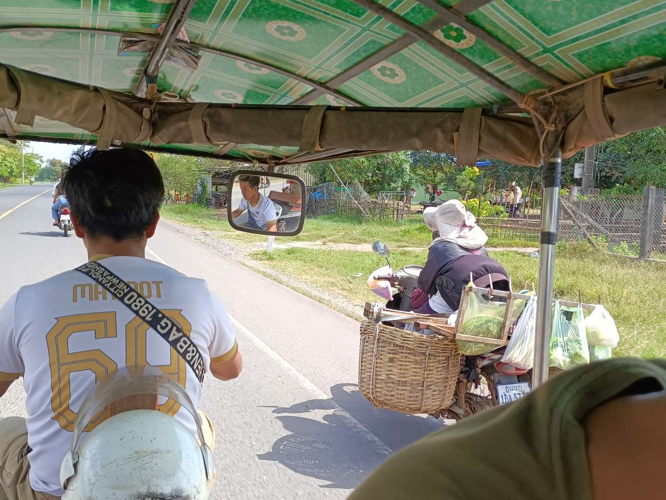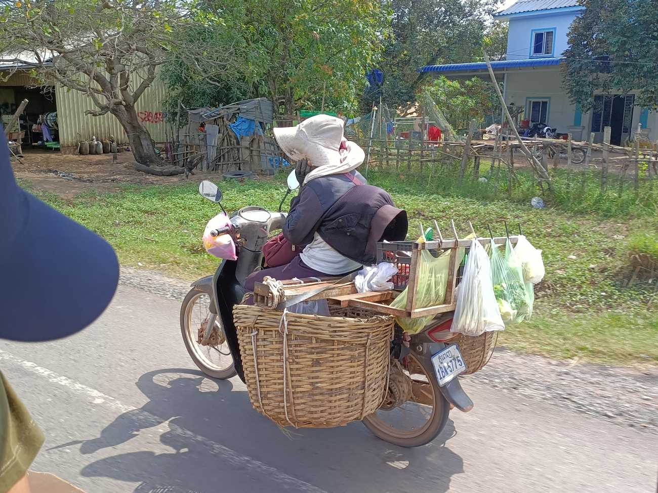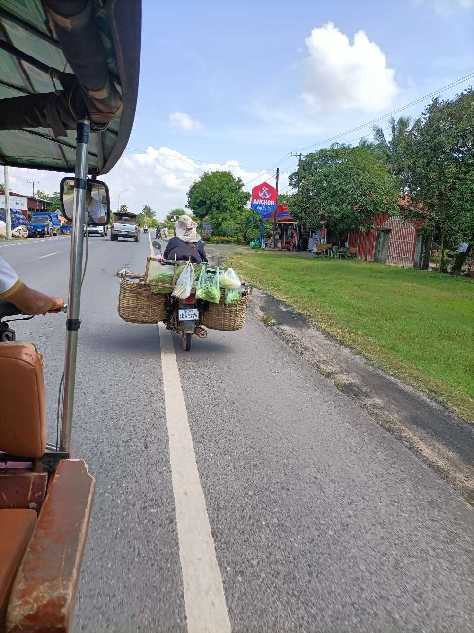 Rientriamo in tuk tuk all’hotel. Anche lungo la strada approfitto per fare qualche foto. Davanti a noi c’è una signora che trasporta ceste di verdura, che probabilmente sta portando dalle campagne in uno dei mercati di Kampot. / We return by tuk tuk to the hotel. Also along the way I take the opportunity to take some photos. Ahead of us is a lady carrying baskets of vegetables, which she is probably bringing from the countryside to one of Kampot’s markets.