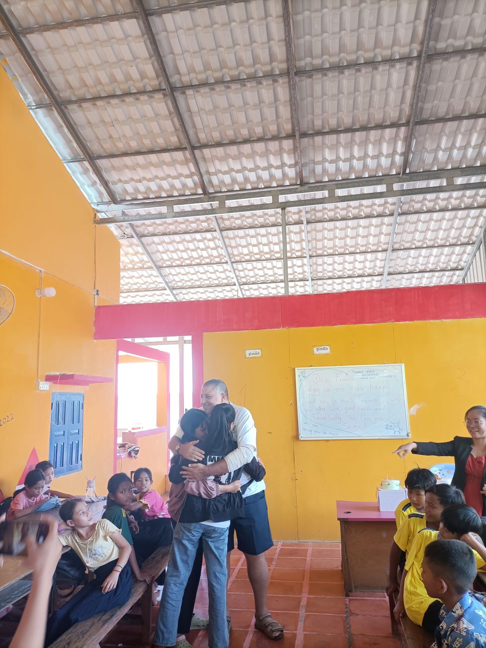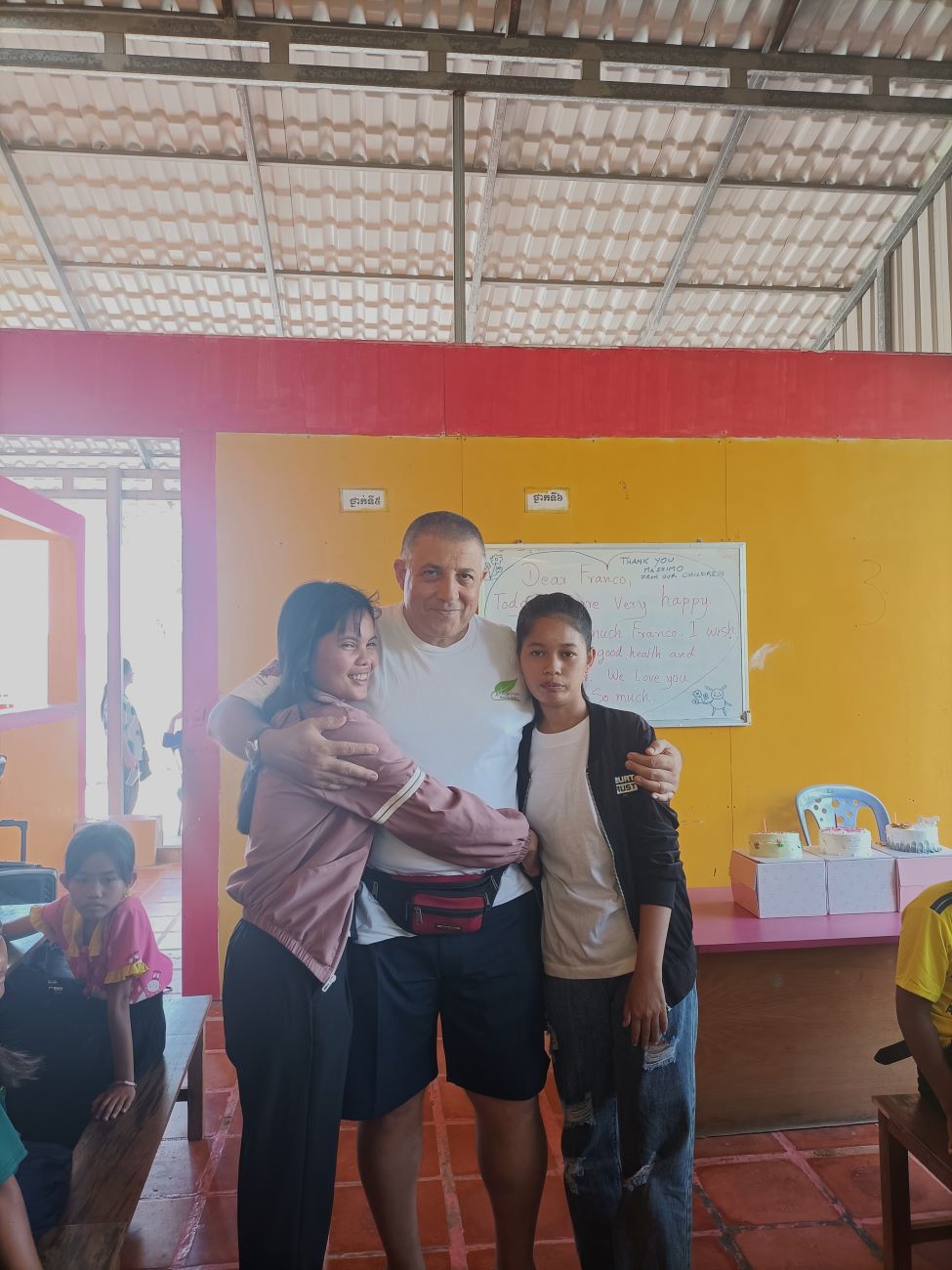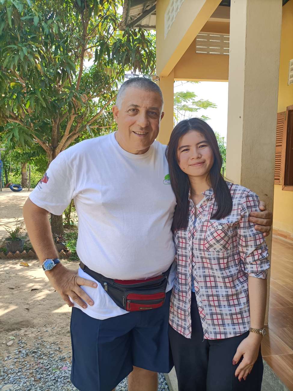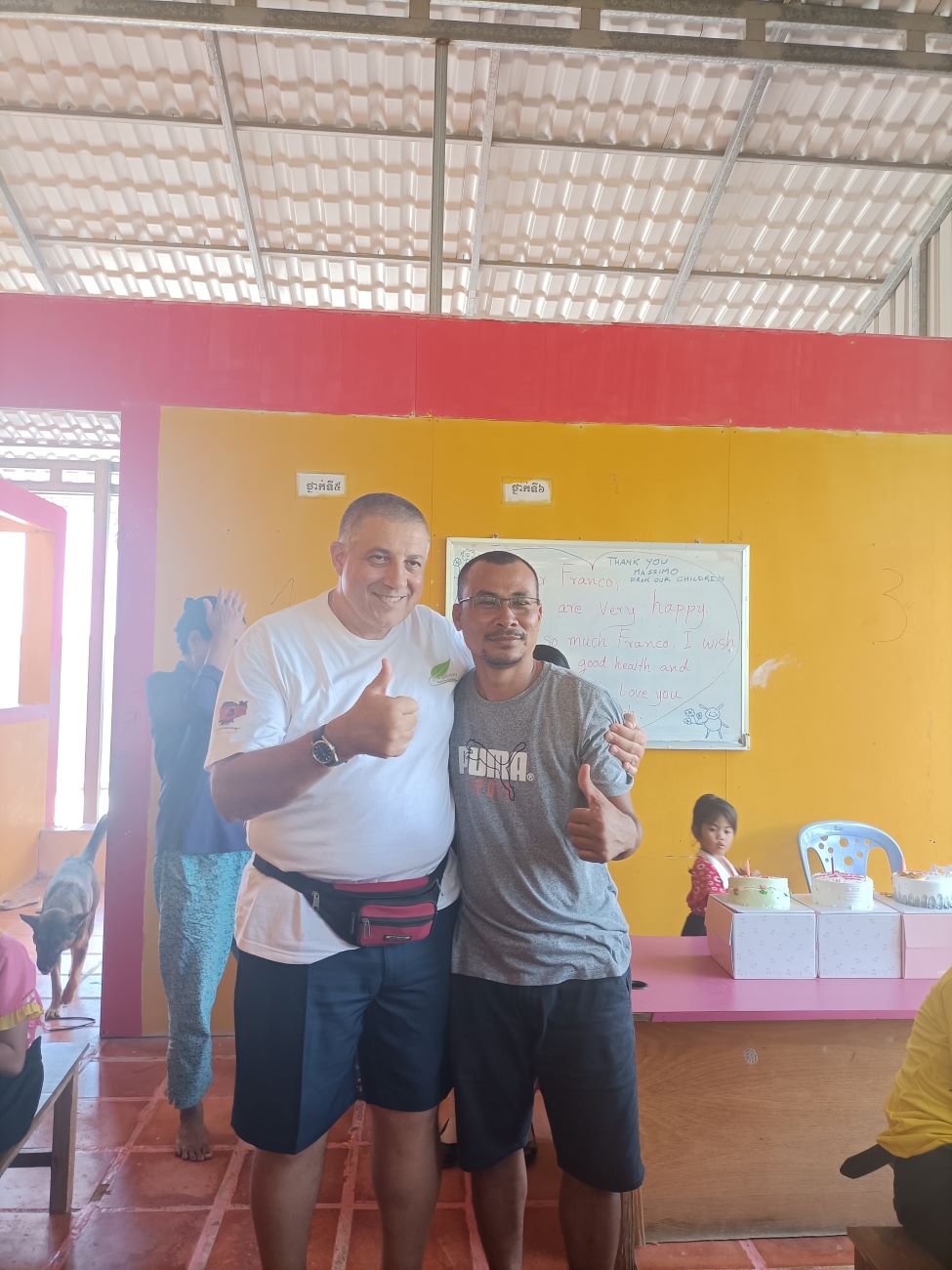 Mi viene chiesto sia da Channa che da Sokkea di dire qualche parola ai bambini prima di iniziare il pranzo. E io non posso che aderire all’invito ed esprimere la mia felicità per essere qui con loro. Li sento tutti un po’ come se fossero figli miei e sono davvero contento di vedere i piccoli che entrano nel progetto e i grandi che ritornano per aiutare o anche solo per salutare. Loro sono una parte importante della mia vita e sono sempre nel mio cuore e nei miei pensieri. Vorrei stare più a lungo ma gli impegni familiari e lavorativi giustamente mi reclamano. Leggo nei loro occhietti neri tutto il loro affetto e rispetto. E spero davvero che mi vedano come il loro papà italiano. Le storie che abbiamo visto con diversi dei nostri ragazzi più grandi ci dimostrano che differenza può fare per il loro futuro essere supportati, seppure, alla fine, con un impegno economico veramente limitato. Concludo la mia chiacchierata chiedendo loro di fare attenzione quando mi abbracceranno e di non schiacciare troppo le mie povere costole. E allora parte un round di abbracci singoli, dove ognuno di loro a turno si alza dalla sua postazione e viene a salutarmi e ringraziarmi con un abbraccio. Le bambine sono le più intraprendenti e molte di loro mi dicono “I love you Franco” e io rispondo con un bacino sulla fronte. Arrivano anche le piccole Kunthea e Sievmean e non resisto a prenderle in braccio e baciarle sulla guancia. Sono troppo dolci. Ovviamente l’ultimo, grande abbraccio è riservato alle mie due signorine Kemheng e Somphors e al meraviglioso Donghey. / I am asked by both Channa and Sokkea to say a few words to the children before starting lunch. And I can only accept the invitation and express my happiness to be here with them. I feel them all a bit like my own children, and I am really happy to see the little ones coming into the project and the big ones coming back to help or even just to say hello. They are an important part of my life and are always in my heart and thoughts. I would like to stay longer but family and work commitments rightly claim me. I read in their little black eyes all their affection and respect. And I really hope they see me as their Italian daddy. The stories we have seen with several of our older boys show us what a difference it can make for their future to be supported, albeit, in the end, with a truly limited financial commitment. I end my talk by asking them to be careful when they hug me and not to squeeze my poor ribs too hard. And then a round of single hugs starts, where each of them in turn gets up from their seats and comes to greet and thank me with a hug. The little girls are the most resourceful and many of them say to me, “I love you Franco,” and I respond with a kiss on the forehead. Little Kunthea and Sievmean also arrive and I can’t resist picking them up and kissing them on the cheek. They are too sweet. Of course, the last, big hug is reserved for my two young ladies Kemheng and Somphors and the wonderful Donghey.