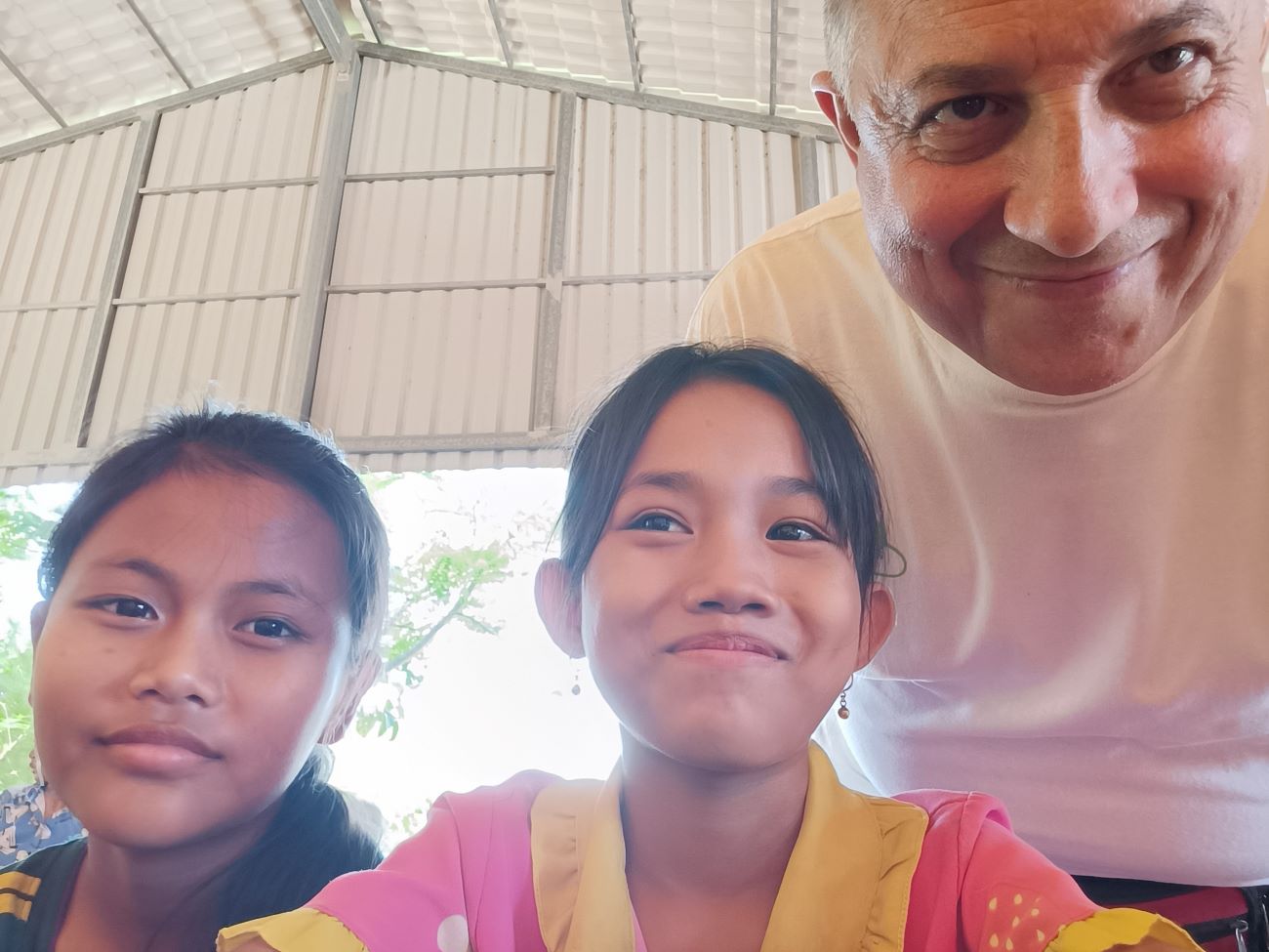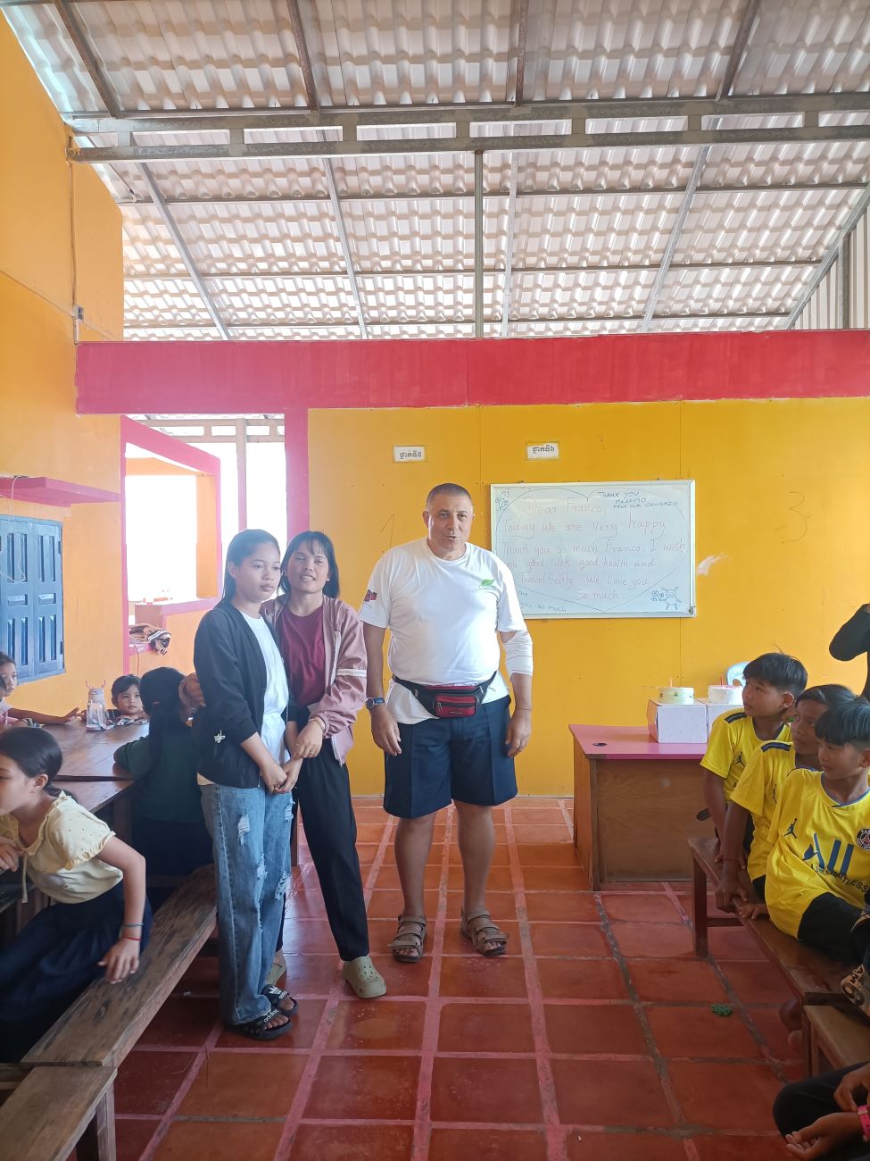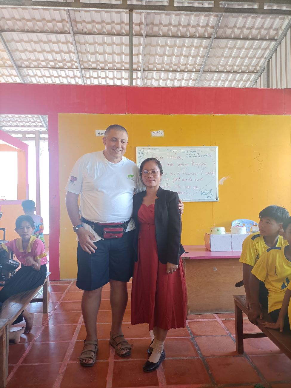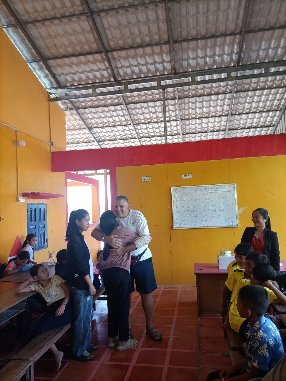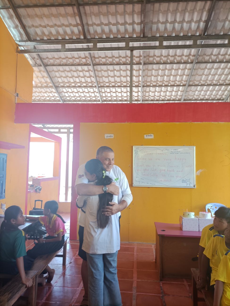 Mi viene chiesto sia da Channa che da Sokkea di dire qualche parola ai bambini prima di iniziare il pranzo. E io non posso che aderire all’invito ed esprimere la mia felicità per essere qui con loro. Li sento tutti un po’ come se fossero figli miei e sono davvero contento di vedere i piccoli che entrano nel progetto e i grandi che ritornano per aiutare o anche solo per salutare. Loro sono una parte importante della mia vita e sono sempre nel mio cuore e nei miei pensieri. Vorrei stare più a lungo ma gli impegni familiari e lavorativi giustamente mi reclamano. Leggo nei loro occhietti neri tutto il loro affetto e rispetto. E spero davvero che mi vedano come il loro papà italiano. Le storie che abbiamo visto con diversi dei nostri ragazzi più grandi ci dimostrano che differenza può fare per il loro futuro essere supportati, seppure, alla fine, con un impegno economico veramente limitato. Concludo la mia chiacchierata chiedendo loro di fare attenzione quando mi abbracceranno e di non schiacciare troppo le mie povere costole. E allora parte un round di abbracci singoli, dove ognuno di loro a turno si alza dalla sua postazione e viene a salutarmi e ringraziarmi con un abbraccio. Le bambine sono le più intraprendenti e molte di loro mi dicono “I love you Franco” e io rispondo con un bacino sulla fronte. Arrivano anche le piccole Kunthea e Sievmean e non resisto a prenderle in braccio e baciarle sulla guancia. Sono troppo dolci. Ovviamente l’ultimo, grande abbraccio è riservato alle mie due signorine Kemheng e Somphors e al meraviglioso Donghey. / I am asked by both Channa and Sokkea to say a few words to the children before starting lunch. And I can only accept the invitation and express my happiness to be here with them. I feel them all a bit like my own children, and I am really happy to see the little ones coming into the project and the big ones coming back to help or even just to say hello. They are an important part of my life and are always in my heart and thoughts. I would like to stay longer but family and work commitments rightly claim me. I read in their little black eyes all their affection and respect. And I really hope they see me as their Italian daddy. The stories we have seen with several of our older boys show us what a difference it can make for their future to be supported, albeit, in the end, with a truly limited financial commitment. I end my talk by asking them to be careful when they hug me and not to squeeze my poor ribs too hard. And then a round of single hugs starts, where each of them in turn gets up from their seats and comes to greet and thank me with a hug. The little girls are the most resourceful and many of them say to me, “I love you Franco,” and I respond with a kiss on the forehead. Little Kunthea and Sievmean also arrive and I can’t resist picking them up and kissing them on the cheek. They are too sweet. Of course, the last, big hug is reserved for my two young ladies Kemheng and Somphors and the wonderful Donghey.