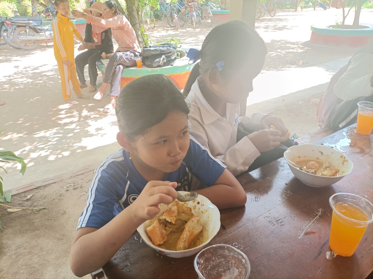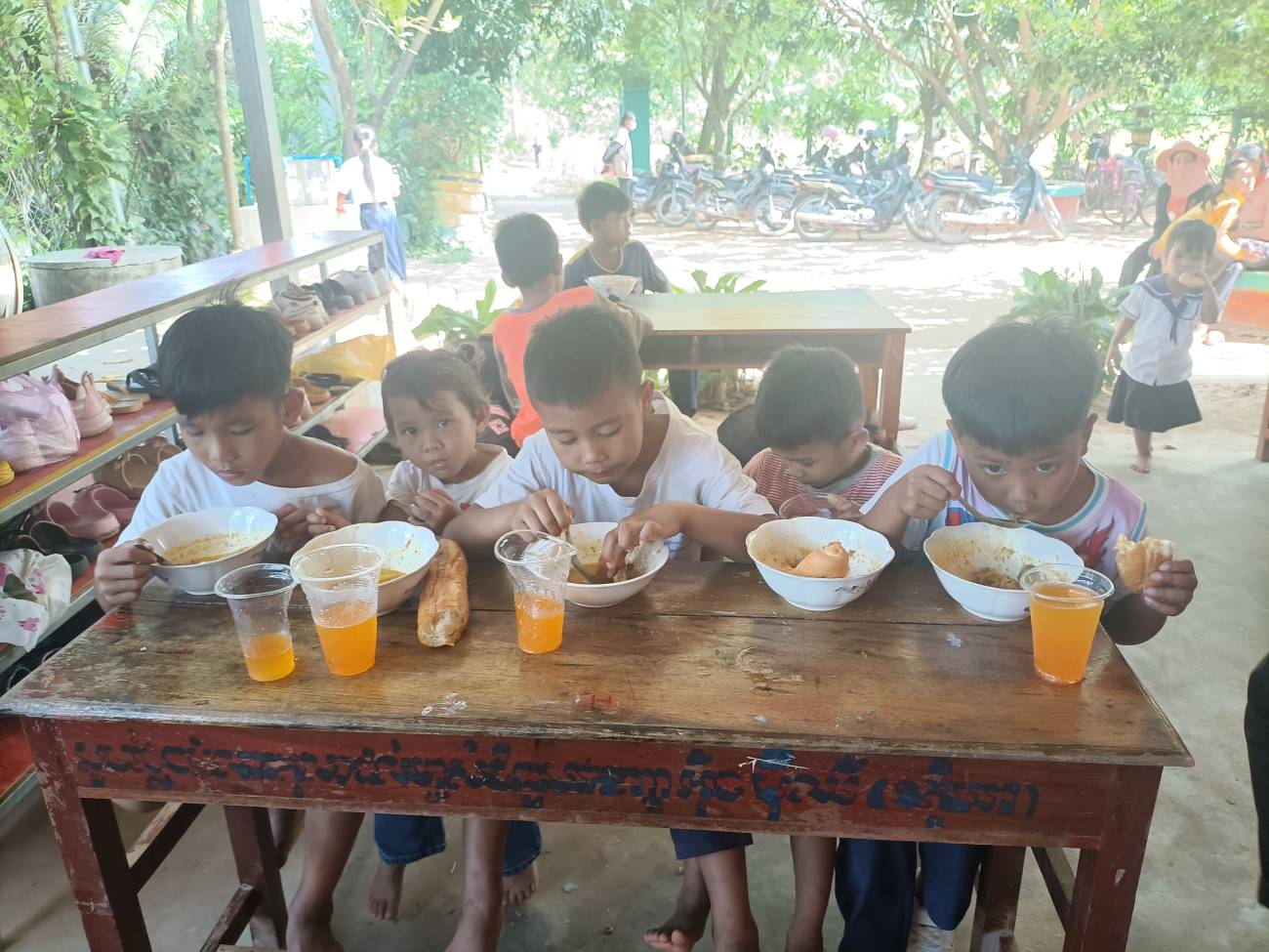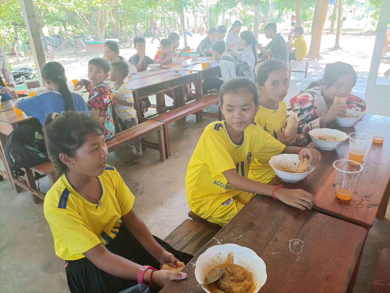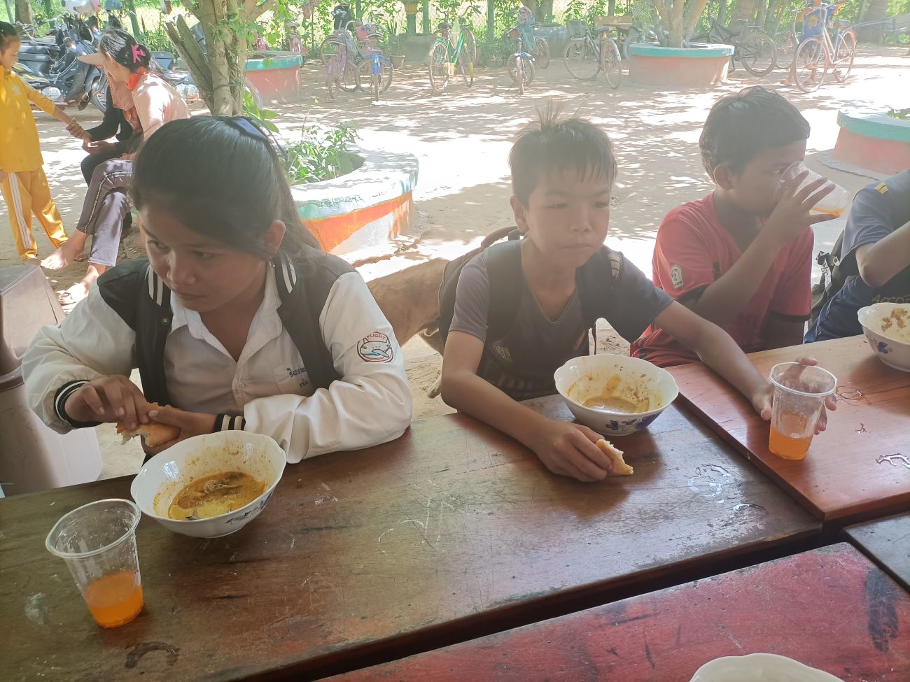 Vengono distribuite le scodelle di ottima Khmer Curry Soup con pollo e baguette da intingere nel gustoso brodo al curry. Tutti hanno il loro bicchiere con bibita che Ny Malay, VannSrey Leak e Thorn Theara distribuiscono nel retro. Le ragazze mangeranno poi tutte insieme lì dietro la parete che separa la classe esterna dallo spazio nel retro dove sono anche appese le tazze e gli spazzolini dei bambini. / They are handed out bowls of excellent Khmer Curry Soup with chicken and baguette to dip in the tasty curry broth. Everyone has their own glass with drink that Ny Malay, VannSrey Leak and Thorn Theara distribute in the back. The girls will then all eat together there behind the wall that separates the outside classroom from the space in the back where the children’s cups and brushes are also hung.