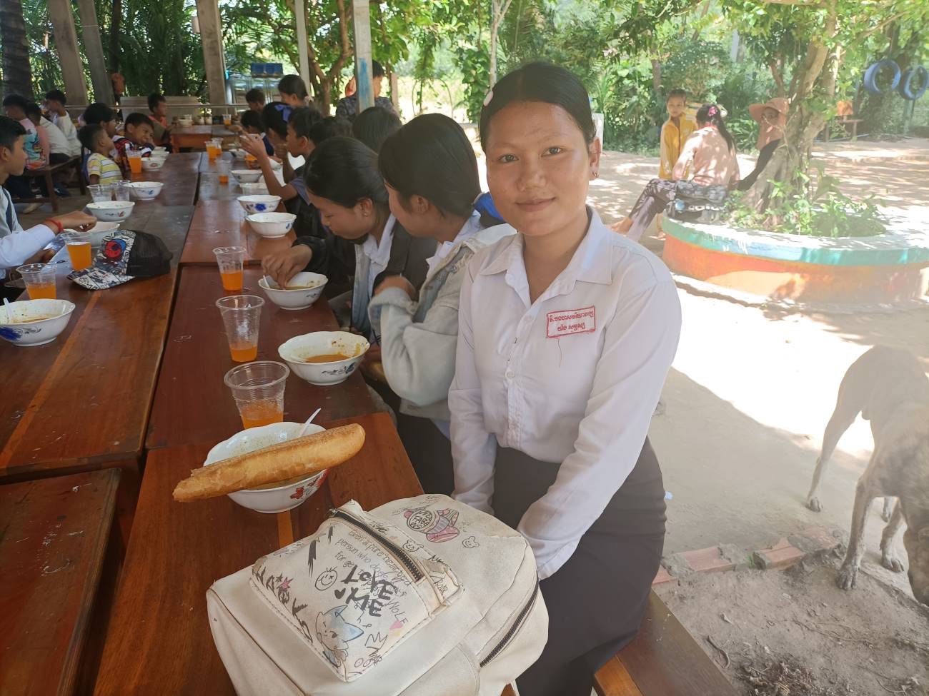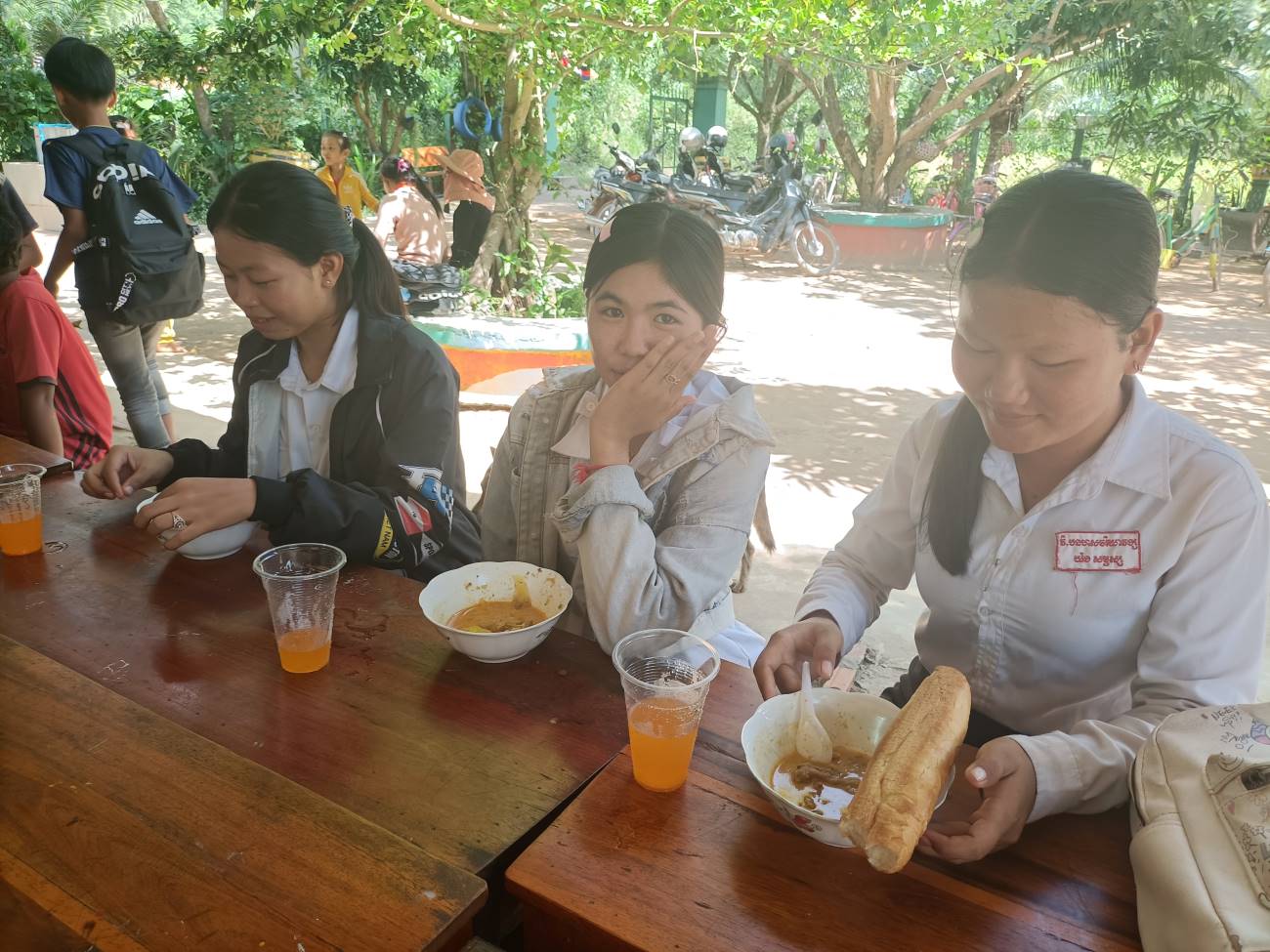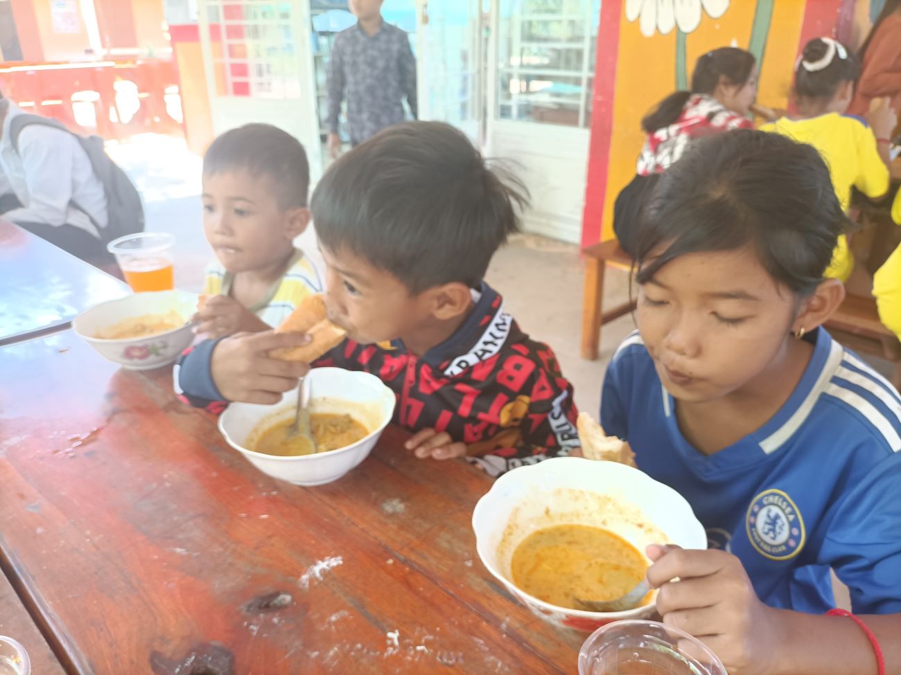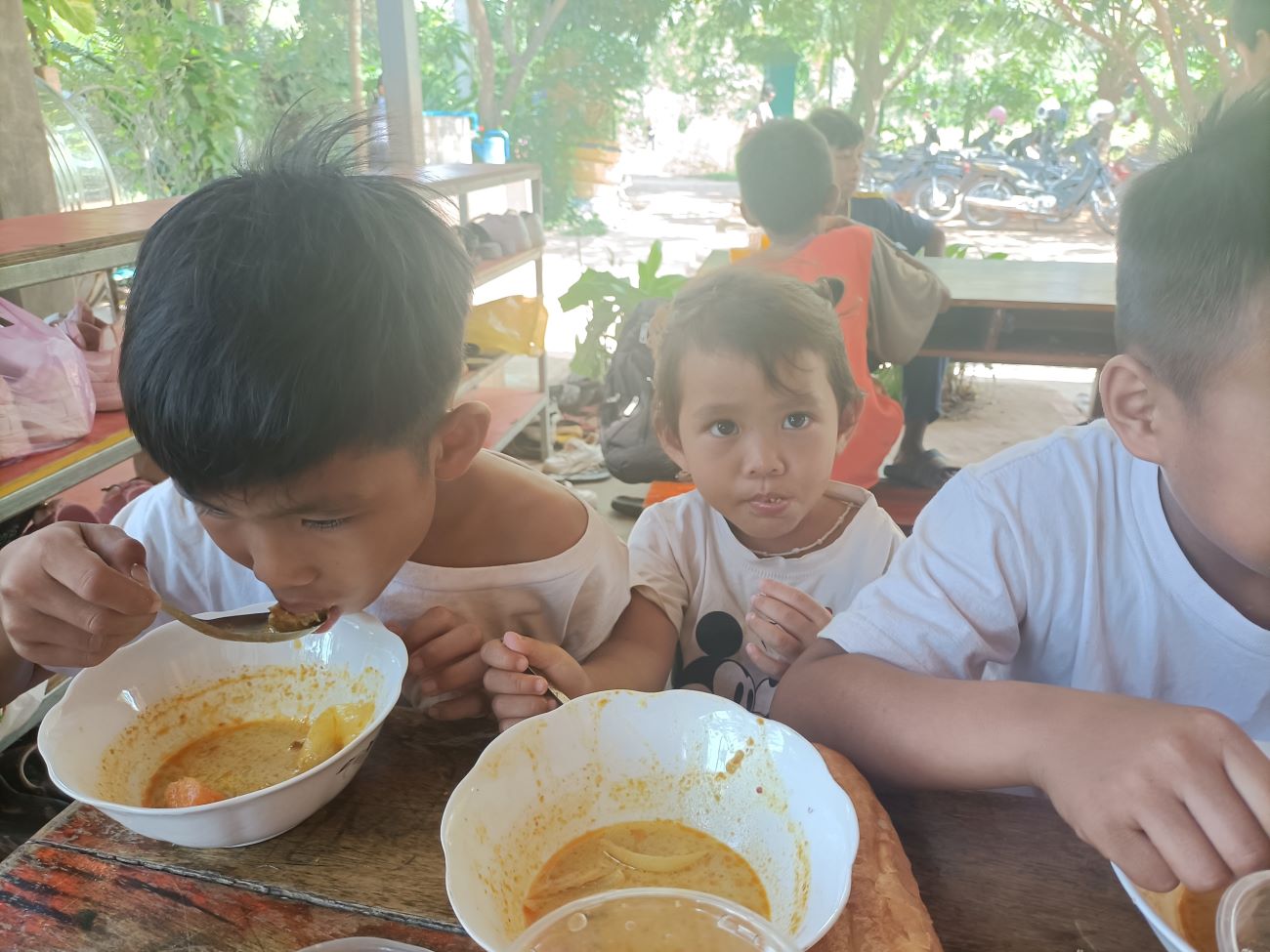Vengono distribuite le scodelle di ottima Khmer Curry Soup con pollo e baguette da intingere nel gustoso brodo al curry. Tutti hanno il loro bicchiere con bibita che Ny Malay, VannSrey Leak e Thorn Theara distribuiscono nel retro. Le ragazze mangeranno poi tutte insieme lì dietro la parete che separa la classe esterna dallo spazio nel retro dove sono anche appese le tazze e gli spazzolini dei bambini. / They are handed out bowls of excellent Khmer Curry Soup with chicken and baguette to dip in the tasty curry broth. Everyone has their own glass with drink that Ny Malay, VannSrey Leak and Thorn Theara distribute in the back. The girls will then all eat together there behind the wall that separates the outside classroom from the space in the back where the children’s cups and brushes are also hung.