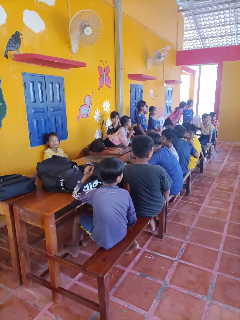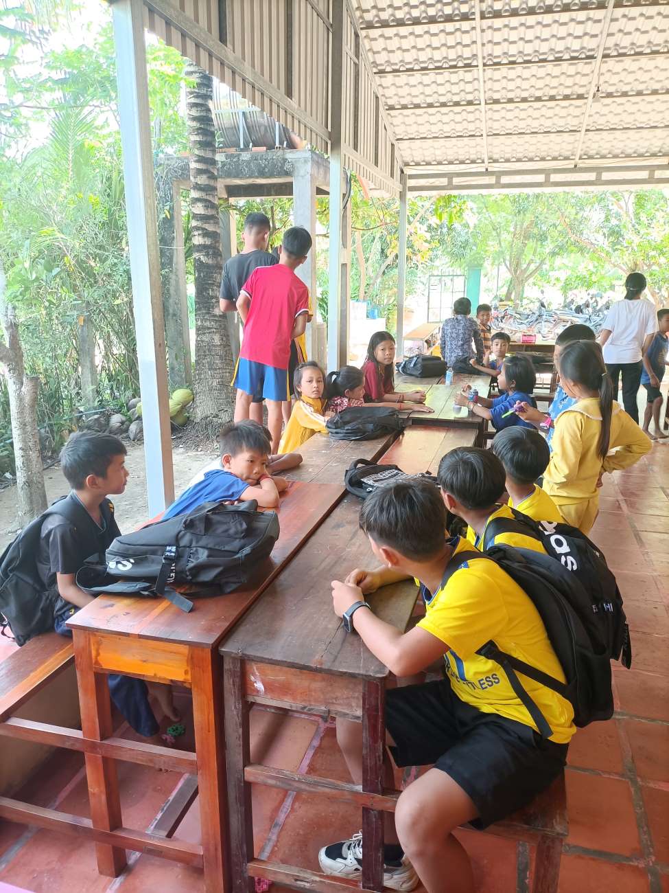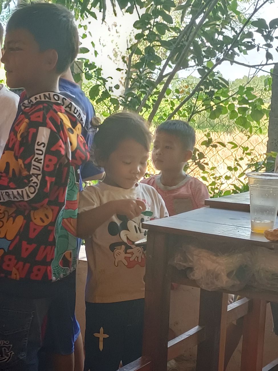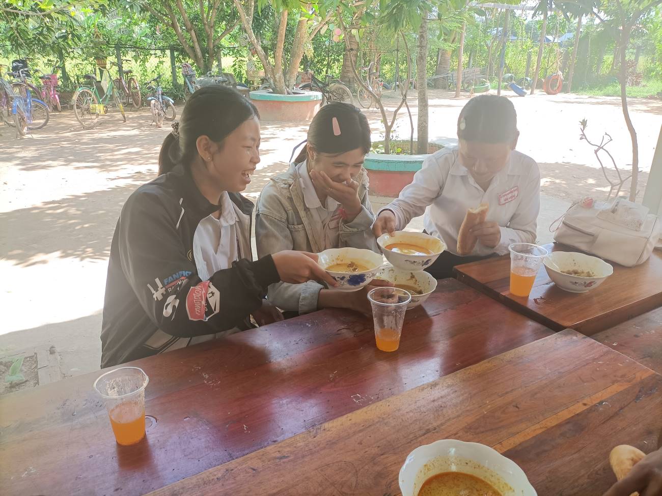Vengono distribuite le scodelle di ottima Khmer Curry Soup con pollo e baguette da intingere nel gustoso brodo al curry. Tutti hanno il loro bicchiere con bibita che Ny Malay, VannSrey Leak e Thorn Theara distribuiscono nel retro. Le ragazze mangeranno poi tutte insieme lì dietro la parete che separa la classe esterna dallo spazio nel retro dove sono anche appese le tazze e gli spazzolini dei bambini. / They are handed out bowls of excellent Khmer Curry Soup with chicken and baguette to dip in the tasty curry broth. Everyone has their own glass with drink that Ny Malay, VannSrey Leak and Thorn Theara distribute in the back. The girls will then all eat together there behind the wall that separates the outside classroom from the space in the back where the children’s cups and brushes are also hung.