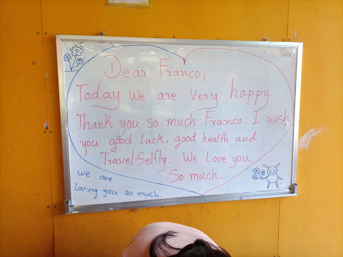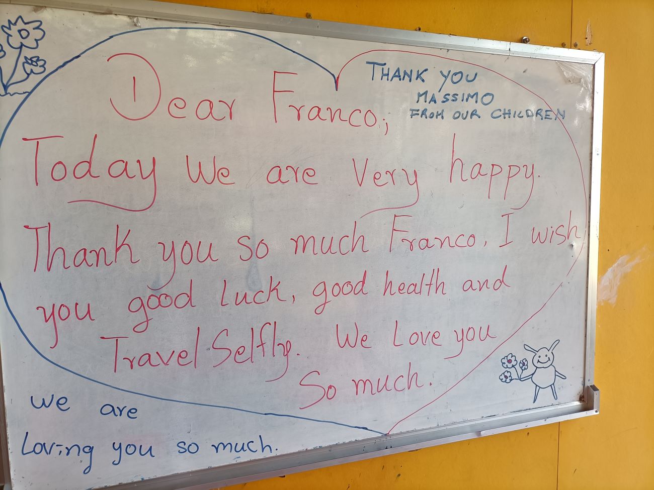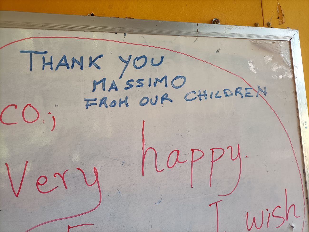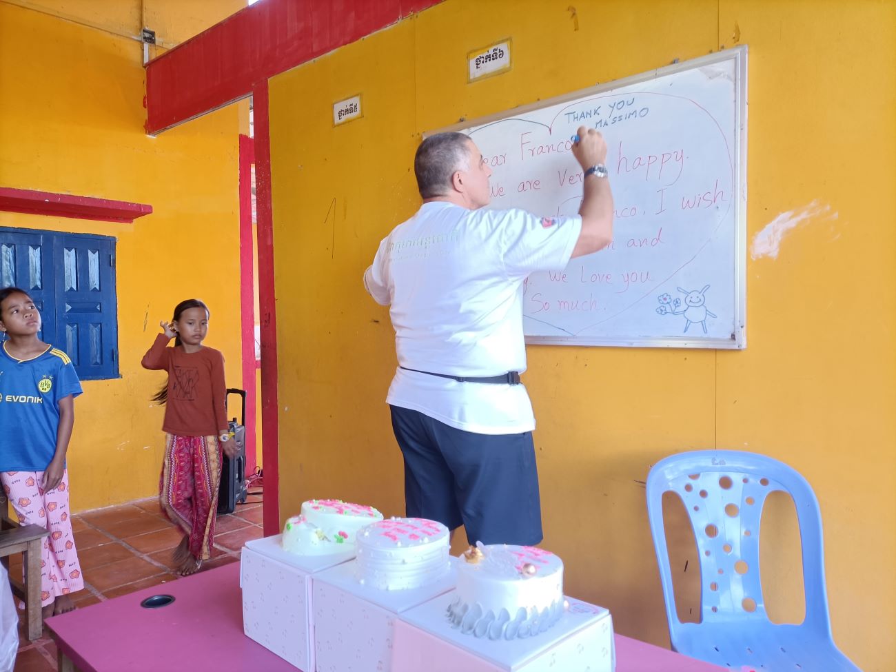 Inizio a girare per il Centro facendo foto dei bambini e ragazzi presenti e scambiando con tutti qualche chiacchiera in Khmer. Quando arrivo nell’aula esterna dove di solito facciamo le feste vedo il messaggio di saluto e di ringraziamento che hanno scritto per me. Ci aggiungo il messaggio di ringraziamento per l’amico Massimo Rescigno, compagno di corso alla Scuola Militare Alpina, che ci ha donato il laptop che aveva vinto come primo premio della nostra lotteria di ottobre e in cui onore facciamo questo pranzo con i bambini. / I start walking around the Center taking pictures of the children and youth present and exchanging some Khmer talk with everyone. When I get to the outdoor classroom where we usually have parties I see the greeting and thank you message they wrote for me. I add to it the message of thanks for my friend Massimo Rescigno, a classmate at the Alpine Military School, who donated the laptop he had won as the first prize in our October raffle and in whose honor we are having this lunch with the children.
