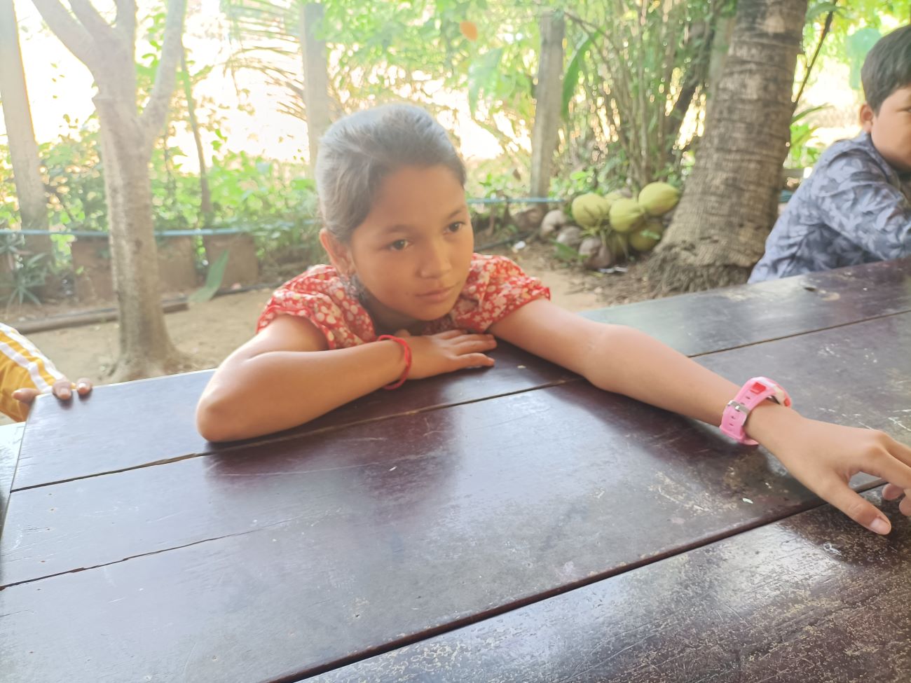 Nel frattempo, arriva il mio ciclone preferito. La mia Somphors. Carattere completamente di verso da Kemheng. Estroversa, casinista, sempre pronta allo scherzo. Mi abbraccia forte e non vuole più staccarsi. Mi dà anche un bacio sulla guancia. I bambini li intorno, soprattutto i maschi ridono a crepapelle. Non sono abituati a vedere queste esternazioni di affetto. Chissà cosa si stanno dicendo in Khmer. / Meanwhile, here comes my favorite cyclone. My Somphors. Character completely different from Kemheng. Outgoing, messy, always ready for a joke. She hugs me tightly and never wants to pull away. She even gives me a kiss on the cheek. The children around them, especially the boys laugh out loud. They are not used to seeing such displays of affection. I wonder what they are saying to each other in Khmer.