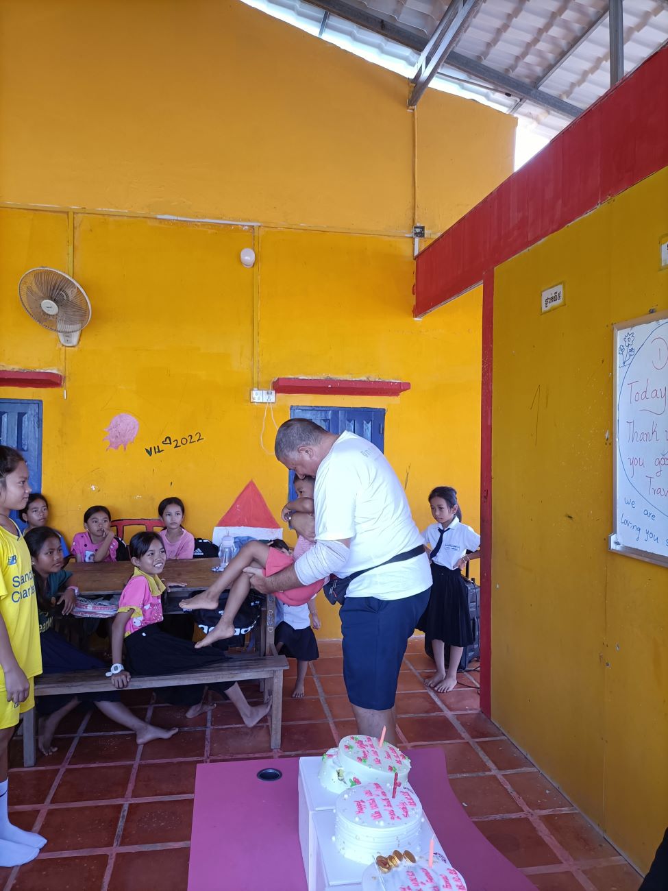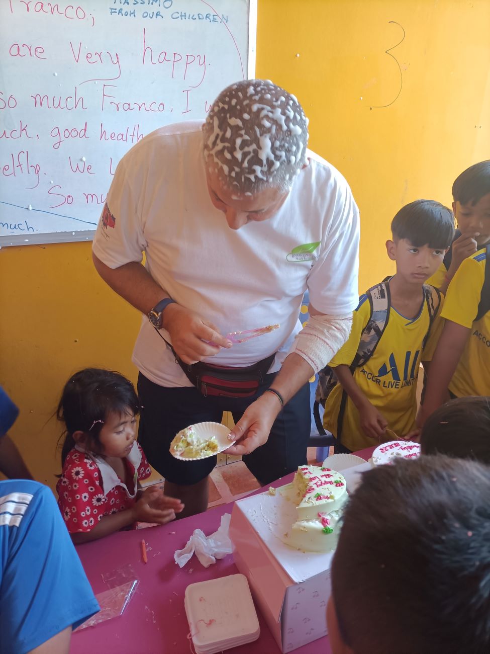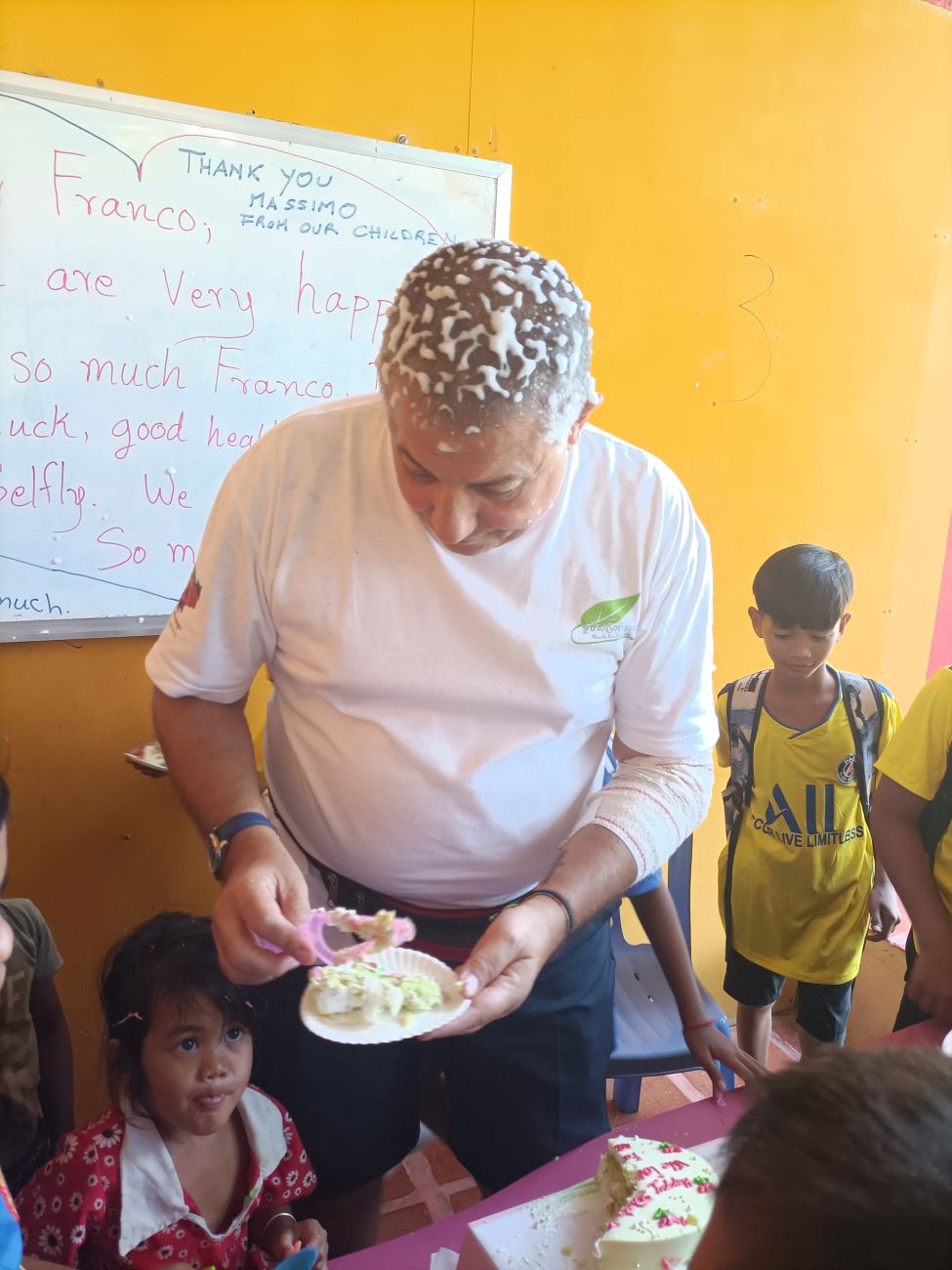 E poi come ormai usanza arrivano le ragazze più grandi a lasciarmi sul viso una striscia di crema della torta, arriva Theara, arriva Malay, arriva Srey Leak e ovviamente Somphors. E poi a ruota tutti i piccolini che imitano alla perfezione i più grandi. Questa è una tradizione che prosegue imperterrita ogni volta che al Centro si taglia una torta, sin dalla prima tortina che donammo nel gennaio 2014 alla mia prima missione qui e quando eravamo ancora nella vecchia sede del Centro qui di fronte. Ricordo che allora molti bambini non sapevano nemmeno cosa fosse quell’oggetto che era stato messo nelle loro mani, perché non avevano mai visto né tanto meno assaggiato una torta. Certo che, se penso a questo rifletto su quanta strada abbiamo fatto in questi anni, anche su queste piccole cose di dettaglio. / And then as is now the custom, the older girls arrive to leave a streak of cake cream on my face, along comes Theara, along comes Malay, along comes Srey Leak and of course Somphors. And then along comes all the little ones who imitate the older ones to perfection. This is a tradition that continues undeterred every time a cake is cut at the Center, ever since the first cupcake we donated in January 2014 at my first mission here and when we were still in the old Center building across the street. I remember back then many children did not even know what that object was that had been placed in their hands, because they had never seen let alone tasted a cake. Of course, when I think about that I reflect on how far we have come over the years, even on these little things of detail.