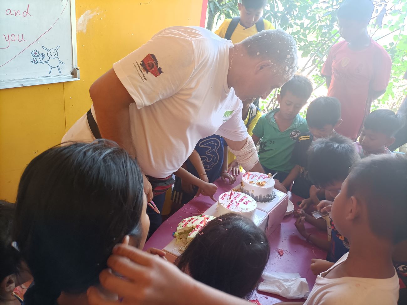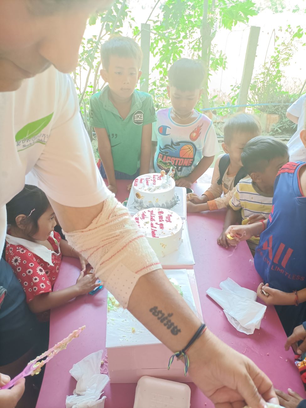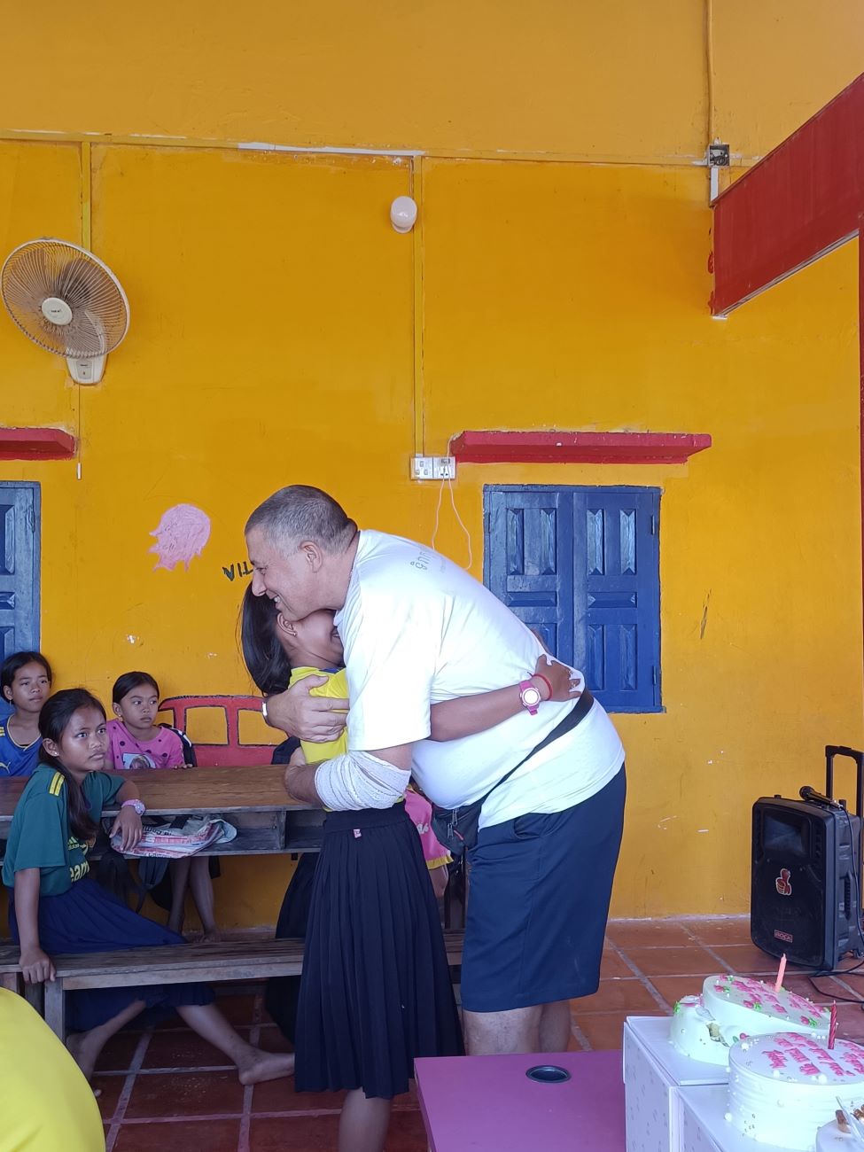 E poi come ormai usanza arrivano le ragazze più grandi a lasciarmi sul viso una striscia di crema della torta, arriva Theara, arriva Malay, arriva Srey Leak e ovviamente Somphors. E poi a ruota tutti i piccolini che imitano alla perfezione i più grandi. Questa è una tradizione che prosegue imperterrita ogni volta che al Centro si taglia una torta, sin dalla prima tortina che donammo nel gennaio 2014 alla mia prima missione qui e quando eravamo ancora nella vecchia sede del Centro qui di fronte. Ricordo che allora molti bambini non sapevano nemmeno cosa fosse quell’oggetto che era stato messo nelle loro mani, perché non avevano mai visto né tanto meno assaggiato una torta. Certo che, se penso a questo rifletto su quanta strada abbiamo fatto in questi anni, anche su queste piccole cose di dettaglio. / And then as is now the custom, the older girls arrive to leave a streak of cake cream on my face, along comes Theara, along comes Malay, along comes Srey Leak and of course Somphors. And then along comes all the little ones who imitate the older ones to perfection. This is a tradition that continues undeterred every time a cake is cut at the Center, ever since the first cupcake we donated in January 2014 at my first mission here and when we were still in the old Center building across the street. I remember back then many children did not even know what that object was that had been placed in their hands, because they had never seen let alone tasted a cake. Of course, when I think about that I reflect on how far we have come over the years, even on these little things of detail.