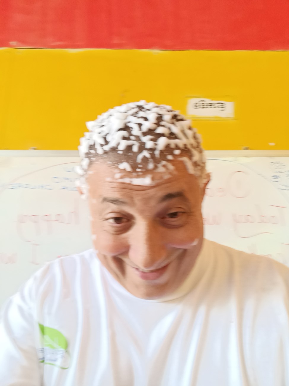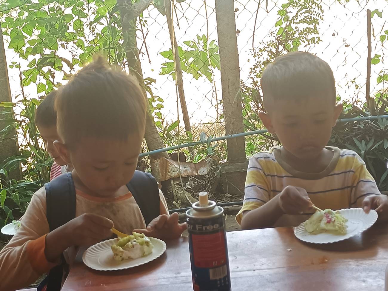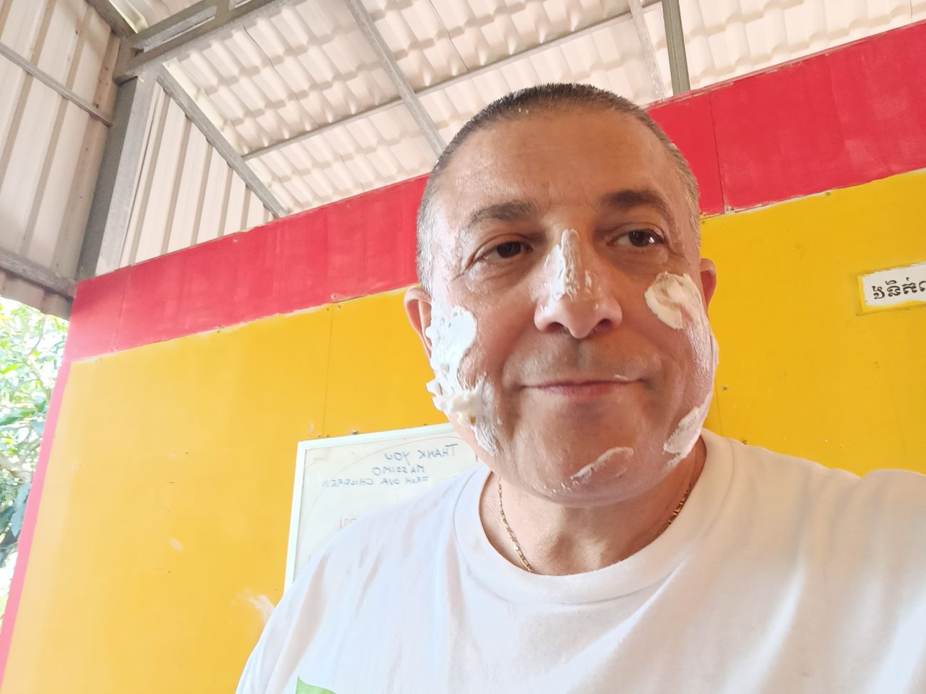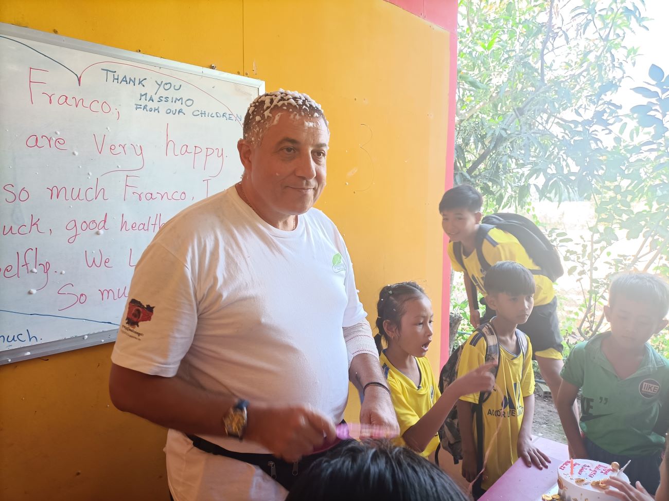 Ormai si avvicina per una parte dei bambini l’orario di andare per recarsi a scuola ed è quindi ora di attaccare le torte. Sokkea si mette dal lato da cui soffia il vento con un pannello e così Channa e Theara riescono ad accendere le candeline che mi affretto a spegnere con il fiato che riesco a tirare fuori dalle mie costole, prima che vengano spente dal vento. Grande applauso, soprattutto, immagino, perché finalmente arriva la torta. Ma appena alzo la testa mi arriva addosso una abbondante spruzzata di stelle filanti stile nostro carnevale e mi ritrovo con i capelli ricoperti di bianca schiuma e la faccia piene di stelle filanti. / By now it is approaching the time for some of the children to leave for school and so it is time to attack the cakes. Sokkea gets on the side from which the wind is blowing with a panel, and so Channa and Theara manage to light the candles, which I hurry to blow out with what breath I can get out of my ribs before they are blown out by the wind. Great applause, especially, I imagine, because the cake finally arrives. But no sooner do I lift my head than a copious sprinkling of our carnival-style streamers come down on me and I find my hair covered in white foam and my face full of streamers.