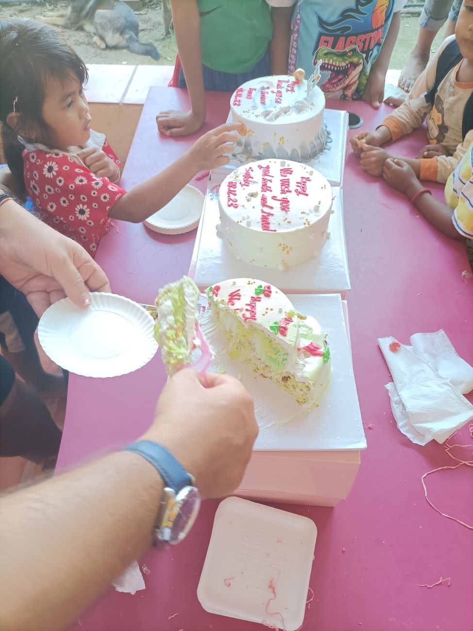 Inizio a tagliare le torte sotto la direzione di Channa, che continua a ripetermi “Small, Teacher” invitandomi a fare fette piccoline per fare bastare la torta per tutti. Alla fine, avanzerà una intera torta che però verrà tenuta per quelli che hanno dovuto scappare a scuola e non sono riusciti ad avere una fetta di dolce. La piccola Kunthea è in prima linea. Qualcuno dei bambini torna per un secondo round, qualcun altro invece declina il mio invito a prendere ancora un po’ di torta. / I start cutting cakes under the direction of Channa, who keeps repeating “Small, Teacher,” inviting me to make small slices to make enough cake for everyone. Eventually, there will be a whole cake left over, but it will be kept for those who had to run off to school and could not get a slice of cake. Little Kunthea is on the front line. Some of the children return for a second round, while others decline my invitation to have some more cake.