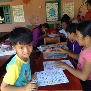 E viva, credo di avere risolto il problema, per così dire, di essere circondata da bambini durante il così detto pausa di pranzo. Prendo foglio di lavoro che crescano, con figure, il scatolone di colori, gli ho insegnato a dire, in inglese”Jane, per favore posso avere uno” e via tutti a disegnare, con un coro di “Jane, please can I have one”. Forse ho parlato troppo presto. Linda ha scritto la pronuncia della frase in Khmer, lo sta insegnando a tutti e tutti stanno arrivando per i fogli con lei a dietro che insegna cosa dire. Ma quante volte devo dire che adoro questi bambini.