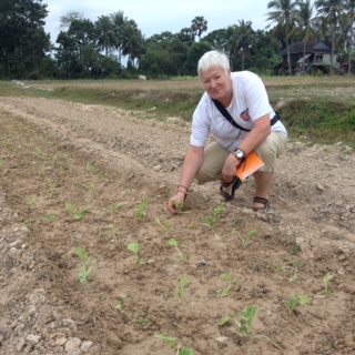 We continue, every now and then saying good day to farmers who are fathers of our children. We arrive at Socheat’s house and are almost set off by four dogs and eight puppies, I didn’t have time to count. But Socheat came out to greet us so the dogs understood we were friends and stopped barking. Not so his three year old brother, one look at this big white lady and he ran off behind the hen cage and when they had to bring him out for the photo screamed and hit his mother who completely ignored his fists. Other than the mother there was another woman who I identified as his grandma, but what a surprise, not only is she Socheat’s grandmother she is also Pheara’s mother, that makes Pheara Socheat’s uncle. No wonder they are always together in the center.