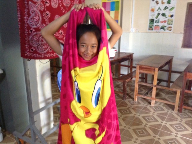 Ho approfittato del assenza di tanti bambini per dare un regalo a Theara, un grandissimo asciugamano con l’immagine di Titti, comperato con i punti dello supermercato. Si capiva dalla faccia che questo le piaceva proprio. Ha posato per le foto con una disinvoltura insolita per lei. Poi nonostante l’avevo messo nel suo sacchetto l’ha tolto subito per far vedere ad un altra ragazza.