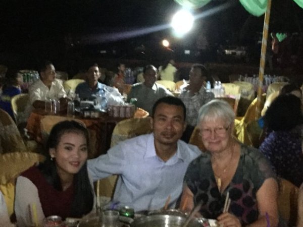 Finalmente partiamo per la casa di Channa. Per fortuna e raggiungibile in tuk-tuk. E buio quando arriviamo ma Channa ci vede e sua figlia mi si attacca subito ai pantaloni. C’è la loro casa di famiglia, la strada ed il campo con un enorme tendone ed il solito palco con musica a tutto volume. Passiamo sotto un arco di fiori finiti con le foto delle sposi e li sposi che ci danno il benvenuto con mani giunti ed un inchino. Quasi non faccio in tempo a vederli, sto seguendo Kimlaan e cercando di guardare dove metto I piedi. Non è facile camminare in una risai ormai secca. Ecco perché I matrimoni sono sempre in questo periodo dell’anno. Hanno finito la raccolta allora hanno meno lavoro ed I campi sono liberi per una festa. Per il resto tutto e proceduto come la sera prima, con l’aggiunta di Sokkea e il fatto che le ragazze hanno insistito che mi alzavo per andare a ballare. Ballare! In cerchio davanti al palco, due passi scivolati avanti ed uno indietro girando le mani di qui e di la. Non mi capite male. Mi sono divertita un sacco. Era tutto nuovo per me è mi sentivo onorata di essere stata invitata. / We finally set off for Channa’s house, which, fortunately can be arrived at by tuk-tuk. It’s dark by the time we arrive but Channa’s spots us immediately and her little daughter grabs on to my trousers. There is a quite big family house, the road and a rice paddy with an enormous tent and the usual stage with music full blast. We pass under an archway of artificial flowers flanked by photos of the bride and groom with the bride and groom greeting us hands joined and slight bow. I hardly have time to see them as I was busy following Kimlaan and trying to watch where I put my feet. It’s not easy walking on a dried out rice paddy. That’s why nearly all weddings are at this time of year. They have finished harvesting the rice, they have more time and the field is dry to have a party on. As for the rest the evening followed the same as the evening before with the addition of Sokkea’s company and the fact that the girls insisted I got up to dance. Dance! In a circle in front of the stage, two steps forward and one back twisting your hands this way and that. Don’t misunderstand me. I had a great time. It was all new for me and I felt honoured to have been invited.