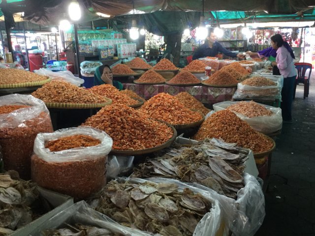 Mi faccio portare al crab market e per la mia gioia il ristorante di Mr. Mab oggi è aperto. Ho un po’ paura che con il fatto di avere spostato molto del personal a Phnom Penh la cucina non sarebbe stato buono come prima. Non dovevo preoccuparmi. Ho mangiato gamberoni in burro con riso che erano un spettacolo e finalmente ho potuto assaggiare la loro bibita di lime e ginger. Tutto per $7,50. / I ask to be taken to the crab market where to my joy Mr. Mab restaurant is open today. I’m a little worried that having moved a lot of the staff to Phnom Penh the food will not be up to its usual standard. I should not have worried. I ate prawns done in butter with rice that were spectacular and I was finally able to enjoy their drink of lime and ginger . All for $7,50.