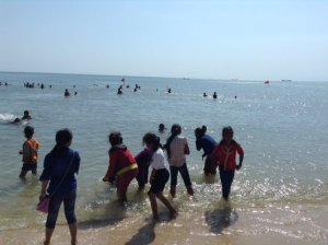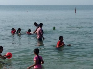 Poi il mare. Dentro di corso con i vestite. Sei nuovi palloni per la spiaggia, su Nabil, grande e grosso si arrampicavano su le spalle per tuffarsi. Per fortuna l’acqua non è molto profondo. Stamattina toccava a teacher To a stare nel acqua come un bambino anche lui. / Then the sea. Racing in fully dressed. Six new beach balls. Nabil who is big and strong taking them on his shoulders so they can dive in. Fortunately it isn’t too deep. This morning was teacher To’s’ turn to go in the water and he was just as bad as the kids.