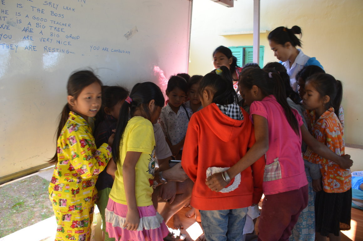 Il mattino è più affollato con due gruppi e quasi tutti i bimbi e le bimbe del Sostegno a Distanza. Sono divisi in due classi e mentre Mister To insegna all’interno dell’edificio a quelli più grandicelli, io e Roumdul (spero che lo spelling sia giusto), la ragazza proveniente dal Centro Don Bosco di Kep che insegna inglese e khmer, siamo con un folto gruppo dei più piccoli.