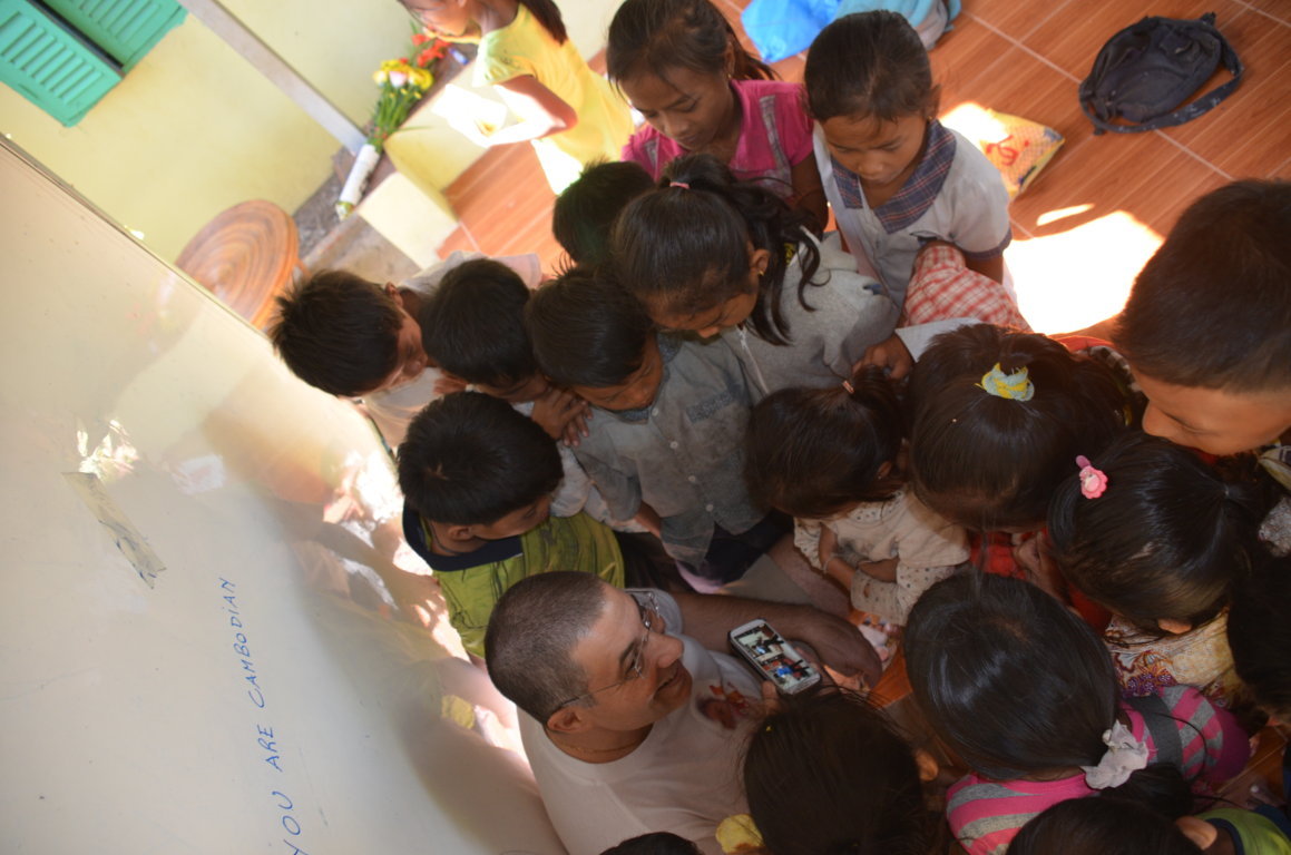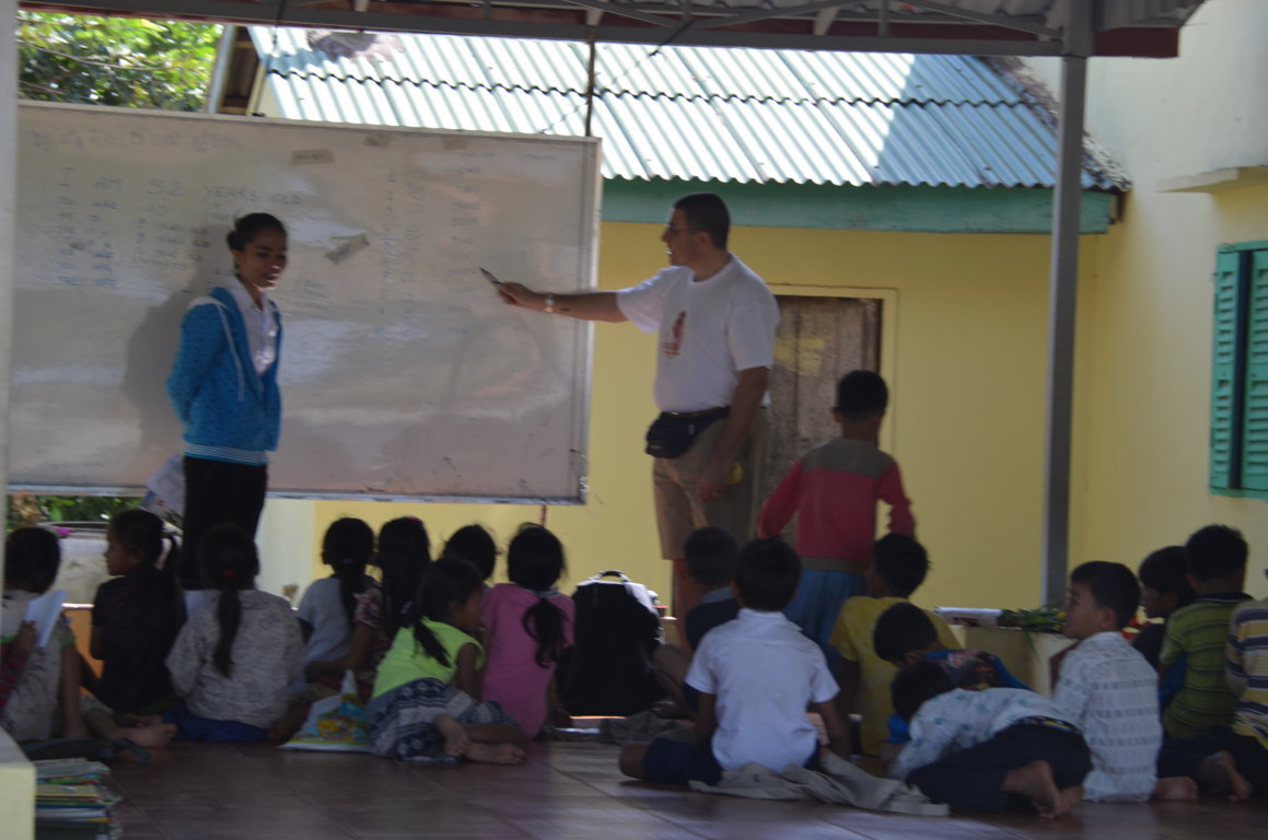 Sono molto curiosi. Prendono appunti di tutto quello che scrivo alla lavagna. Roumdul mi dà una mano con il khmer e a loro con l’inglese per consentirmi di comunicare. Ogni tanto qualcuno si alza e puntando con il ditino verso una delle lettere che ho scritto alla lavagna mi fa capire che la mia scrittura non è per loro così comprensibile. Per loro sono già “Loak Kru”, signor maestro.