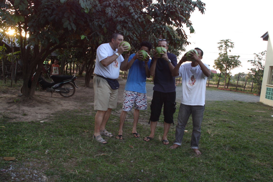 Sono davvero contento, ma anche esausto. Ci pensa Sokkea a rifocillarci, arrampicandosi su una palma che sta nel recinto del Centro e procurando quattro meravigliose noci di cocco. Brindiamo con Mister To e Olivier, amico francese che ci accompagna in questi giorni, come se le noci di cocco fossero enormi bicchieri e ci dissetiamo con il contenuto del frutto. Una foto ricordo è obbligatoria. Autoscatto e via….. Immortalato il momento.
